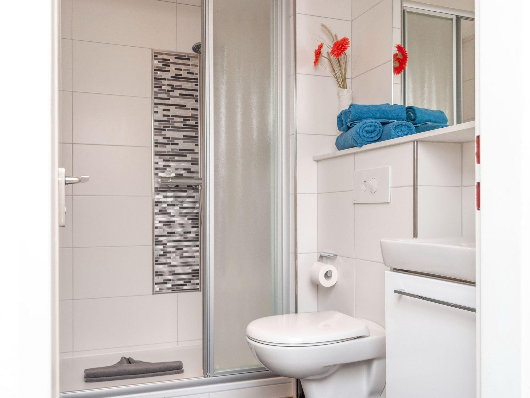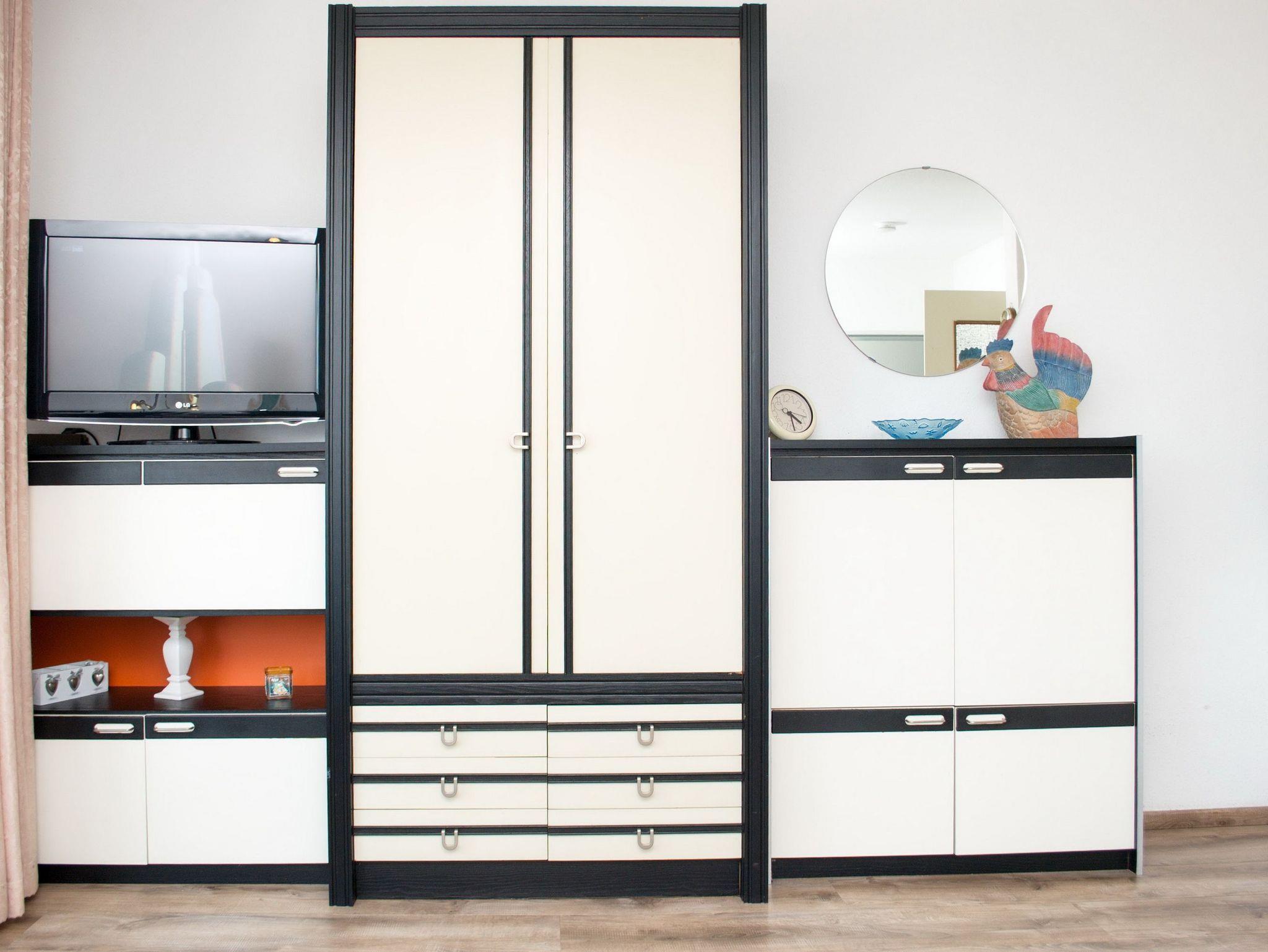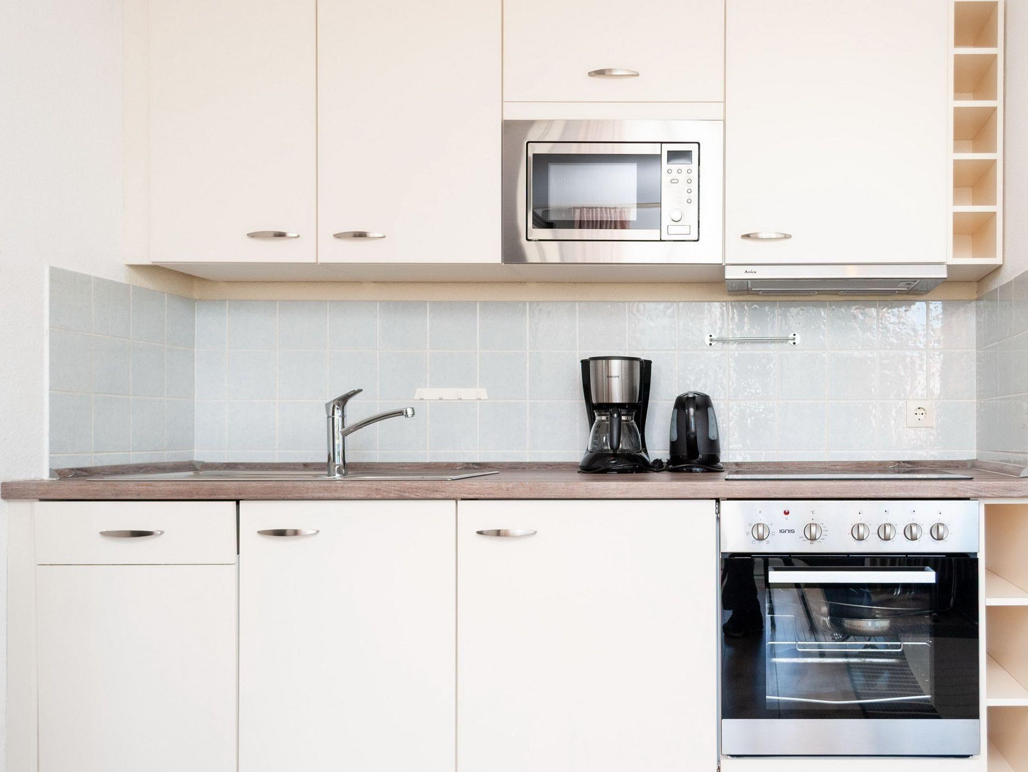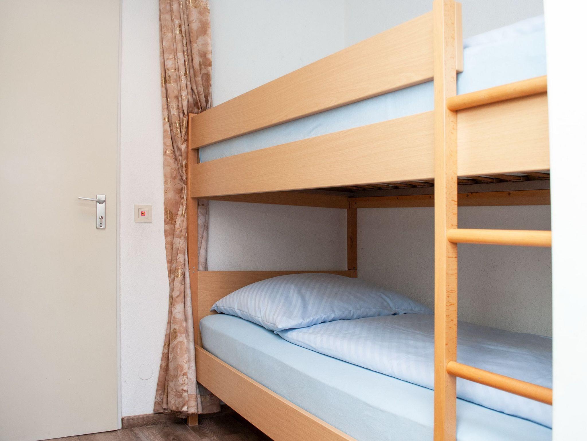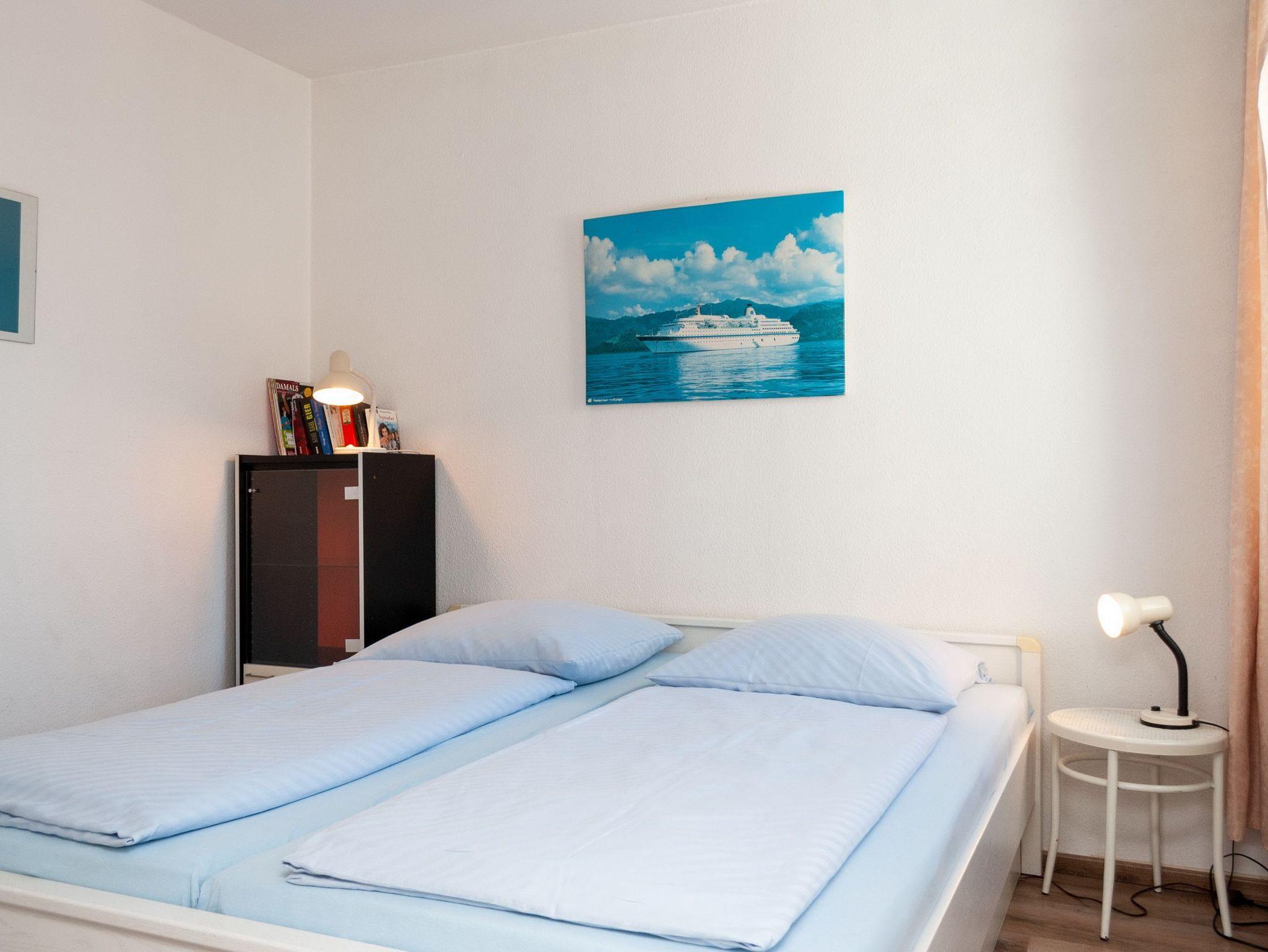Das Apartment besteht aus einem Schlafzimmer mit 1 Doppelbett, einem Wohnbereich , einem zusätzlichem Etagenbett in einer Nische im Flur und einem Badezimmer mit Dusche sowie WC. Die Ferienwohnung beinhaltet eine voll ausgestattete offene Küche.