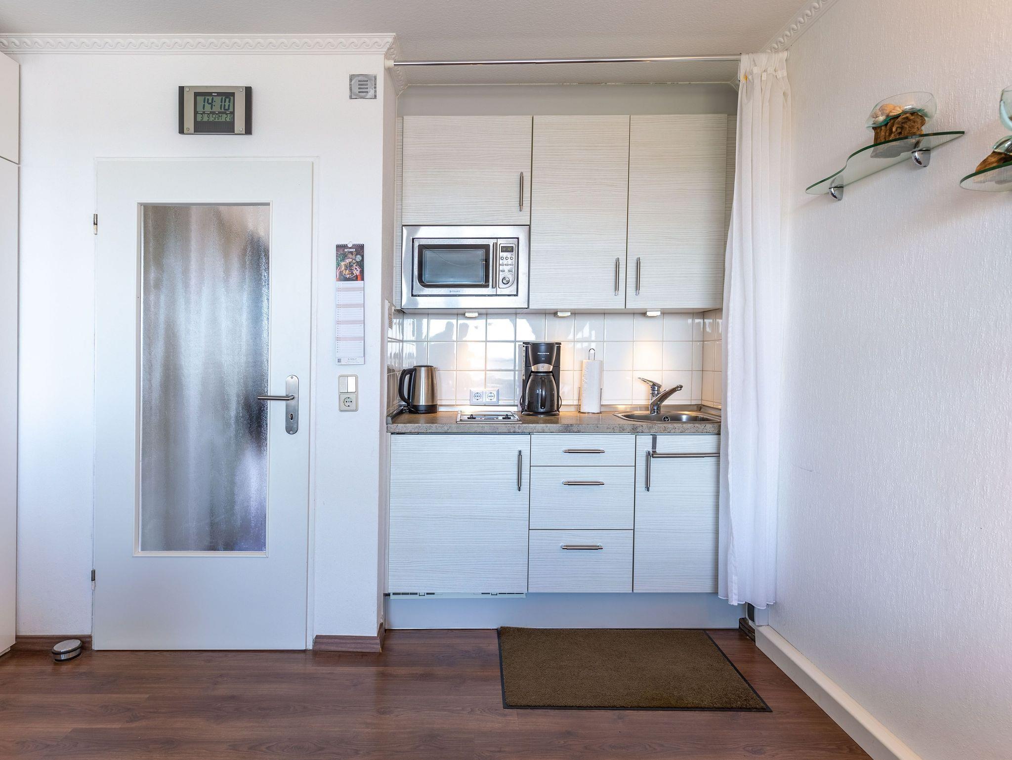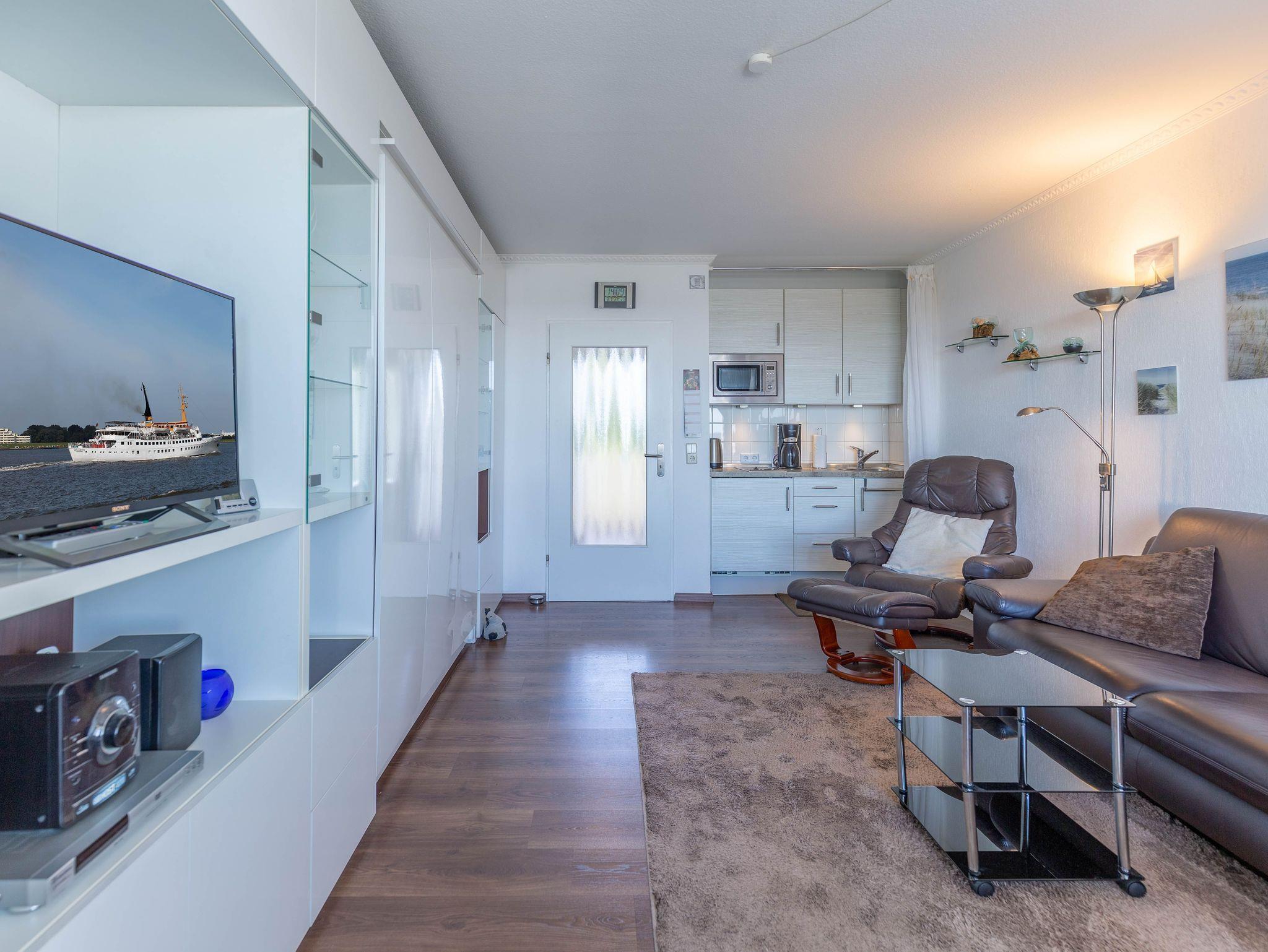 Nach einem langen und erlebnisreichen Tag können Sie im Relaxsessel oder auf dem Sofa entspannen und die Parade der vorbeiziehenden Segelschiffe, Krabbenkutter und Luxus Liner beobachten. Der Esstisch am Fenster gewährleistet, dass Sie schon beim allmorgendlichen Kaffee den herrlichen Meerblick genießen können. Ein Fernseher sorgt dafür, dass Sie auch im Urlaub nicht auf Ihre Lieblingsserie verzichten müssen. Eine kleine Küchenzeile mit 2 Platten-Cerankochfeld und Kühlschrank mit Gefrierfach ist im Wohnbereich integriert.