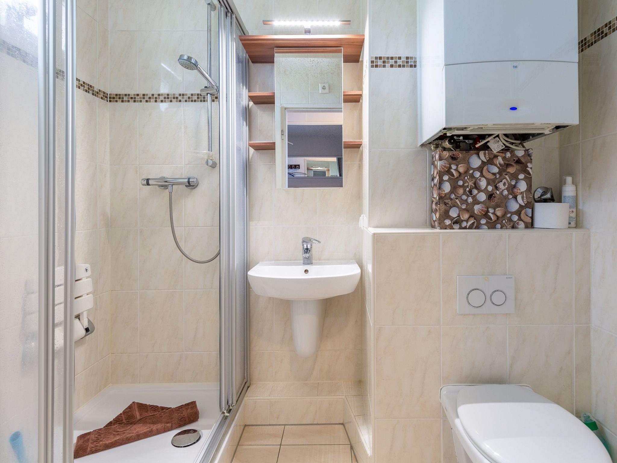 Das Schrankbett (2x90x200) im Wohnbereich gewährleistet einen erholsamen Schlaf. Darüber hinaus bietet ein separates Einzelbett (90x200) im Vorraum eine vom Wohnbereich getrennte Schlafmöglichkeit. Die Ferienwohnung ist mit Verdunklungsvorhängen ausgestattet, sodass Sie nicht von der Morgensonne geweckt werden. Auch vom möblierten Balkon genießen Sie den faszinierenden Meerblick. Das Bad mit Dusche und WC verfügt über ein Fenster zum Belüften.