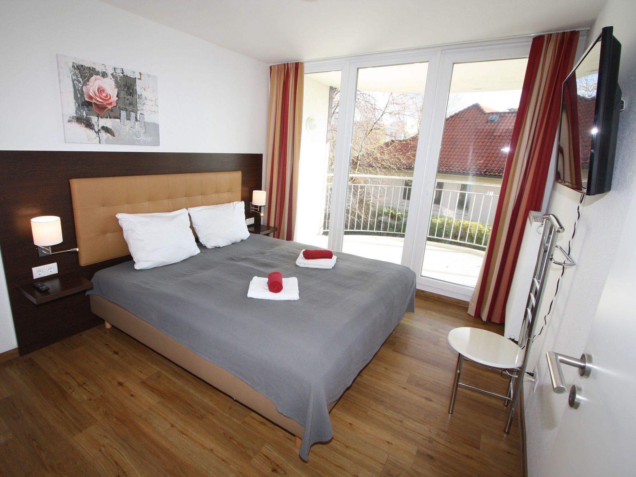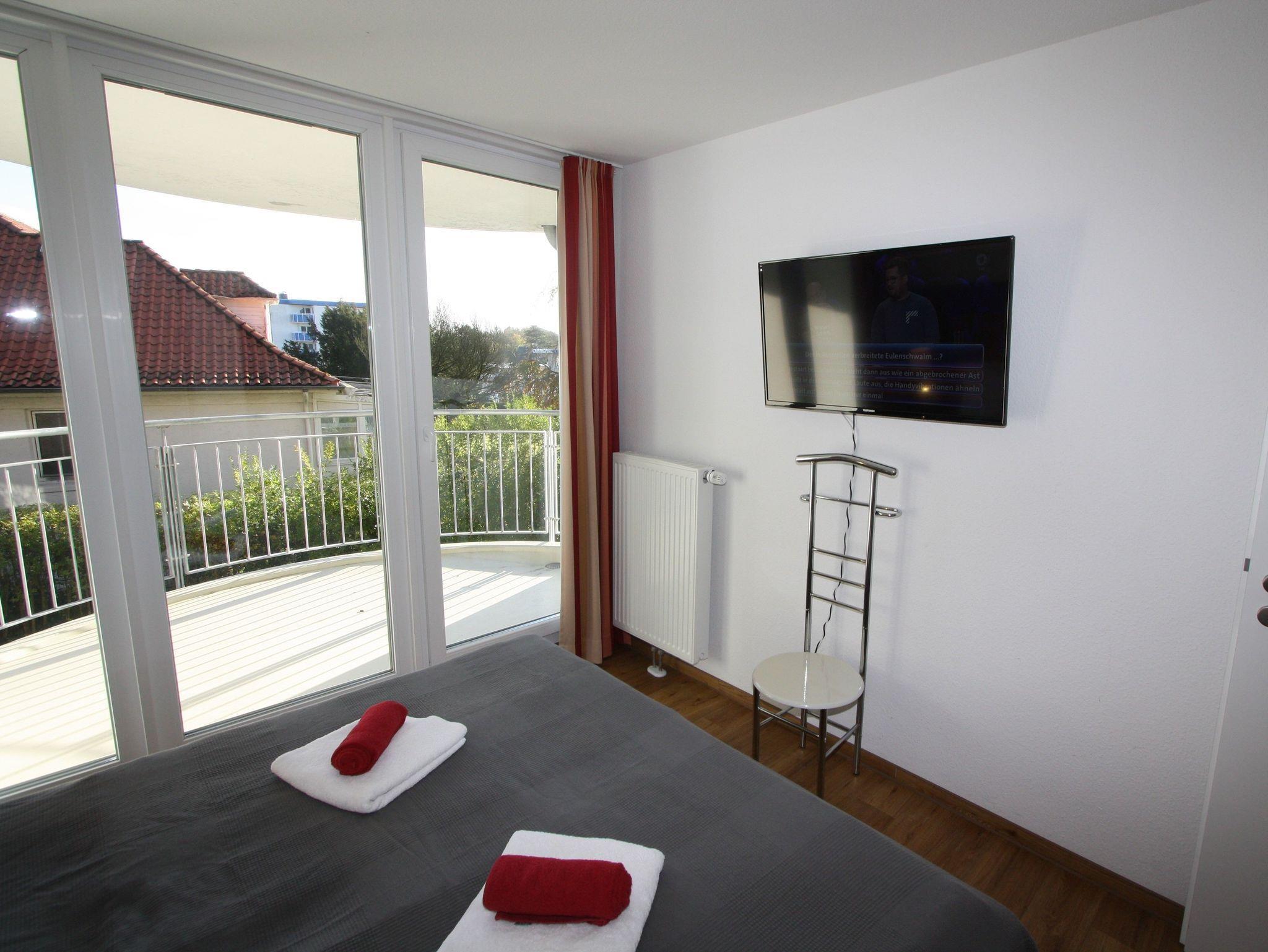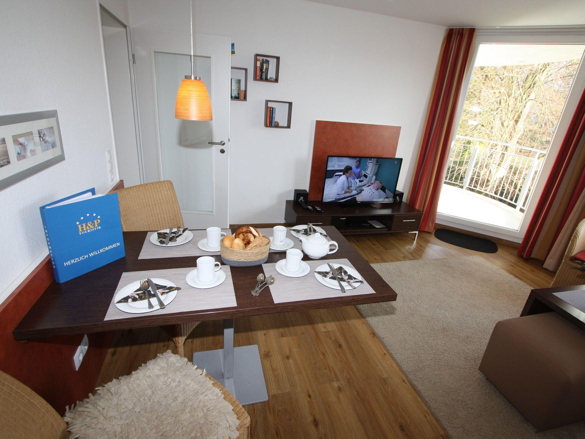 Ein Schlafzimmer mit Doppelbett und SAT-TV (Flachbildschirm), Herrendiener und Safe, großer heller Wohn-/Schlafraum mit bequemer Doppelbettcouch, SAT-TV (Flachbildschirm), Mini-Hifi-Anlage mit USB-Anschluss, DVD-Player, kleine Sammlung von Spielen und Büchern, separater Essplatz, voll ausgestatteter Küchenbereich mit Geschirrspüler und Mikrowelle, Dusche/WC, großer möblierter Balkon, Abstellraum, überdachter und nummerierter PKW-Stellplatz in der Tiefgarage