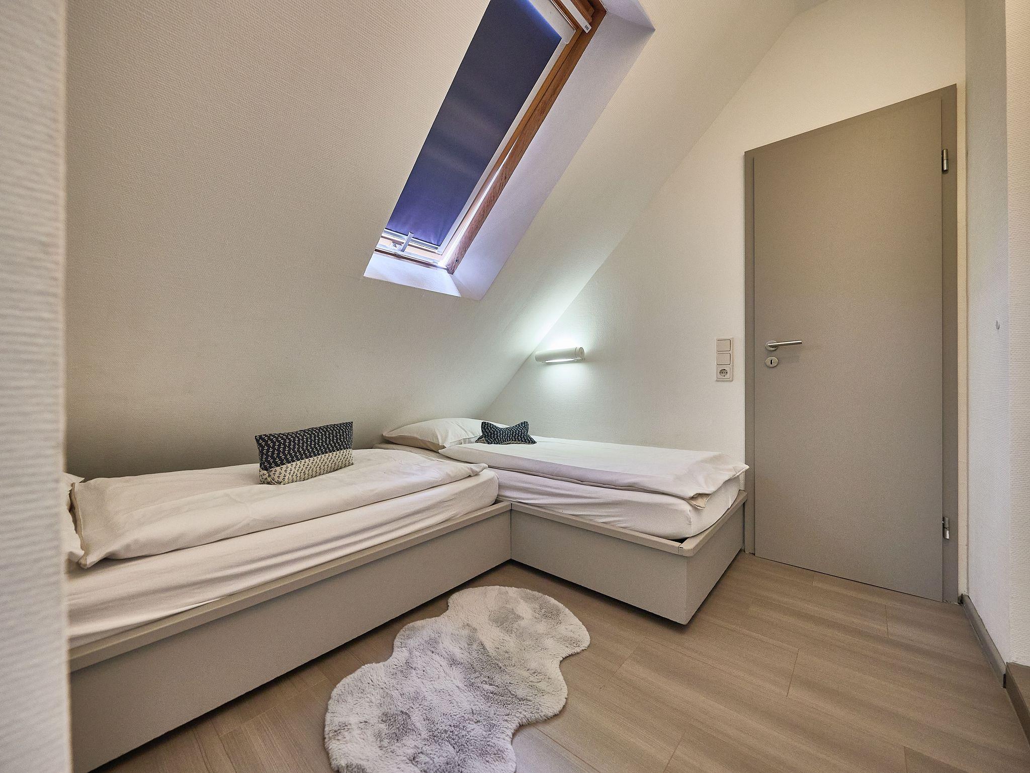 Der ausgebaute Spitzboden beherbergt zwei Schlafzimmer: in der Galerie ein bequemes Doppelbett und ein angrenzendes Zimmer mit zwei Einzelbetten, die optimal für Kinder hergerichtet sind. Eine optimale Belegung ist für 3 Erwachsene plus einem Kind. Ein begehbares Ankleidezimmer steht Ihnen ebenfalls zur Verfügung, um Ihre Garderobe ordentlich zu verstauen. Die Treppe ist bequem zu nutzen.