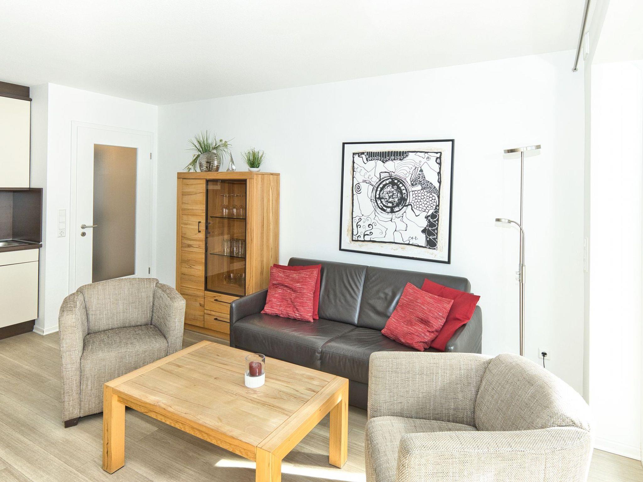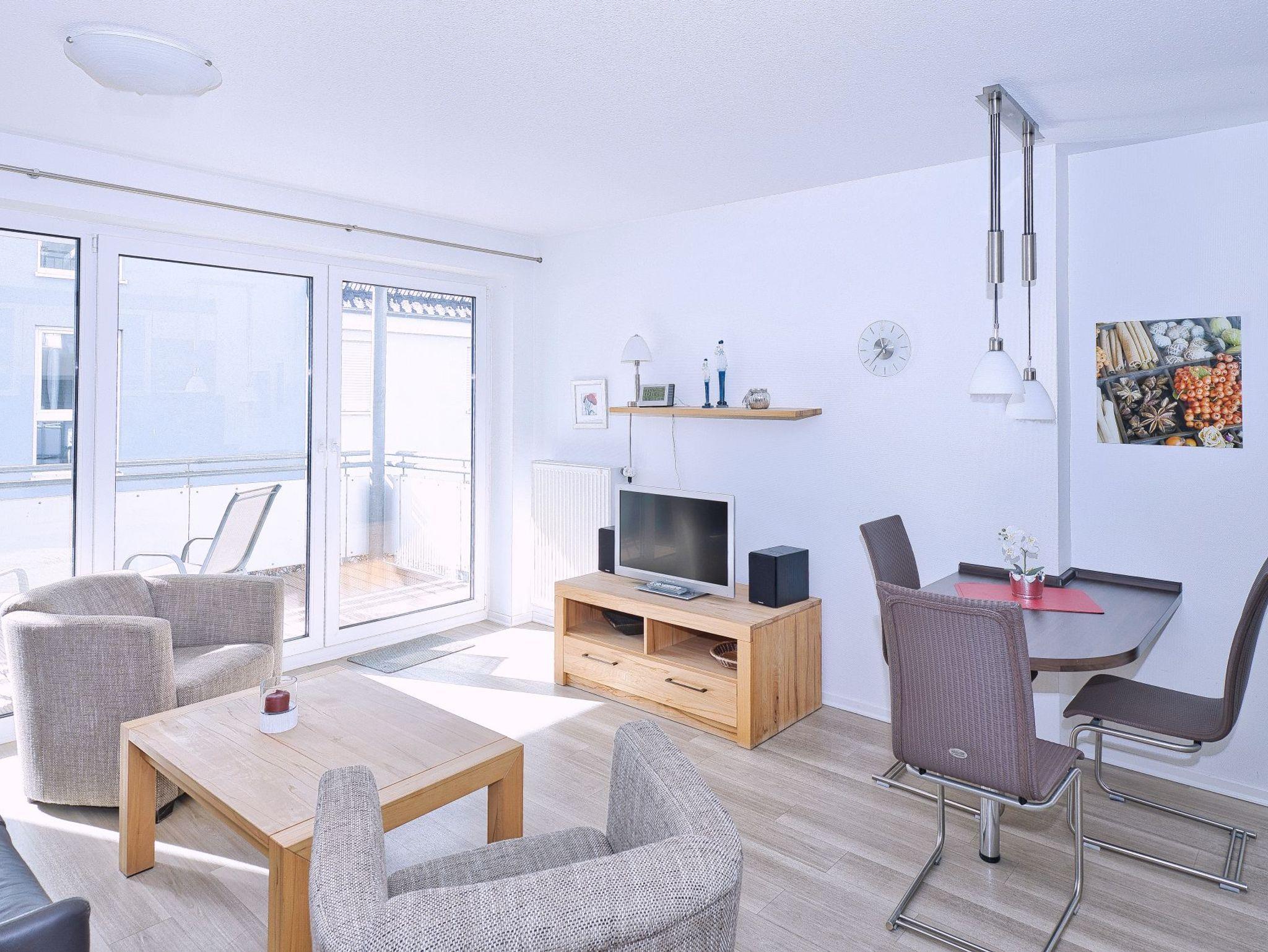 Diese Ferienwohnung wird Sie von der Lage und Ausstattung begeistern. Diese hochwertige und modern ausgestattete 2-Raum Ferienwohnung im 1.OG bietet Ihnen eine hochwertige Einrichtung, mit einem sehr schönen Wohn- und Essbereich und einer vollständig eingerichteten optisch tollen Küchenzeile mit hochwertigen Einbaugeräten. Der Zugang zum Südbalkon erfolgt über eine große Balkontür im Wohnbereich. Diese Wohnung lässt nichts vermissen. Das Schlafzimmer ist eingerichtet mit einen Doppelbett und großem Kleiderschrank. Ein Duschbad mit WC und Fenster fehlt natürlich nicht und ist mit Ablagen und einen Handtuchtrockner ausgestattet. Die gesamte Wohnung ist mit allergikerfreundlichen Bodenbelägen ausgelegt. Eine zweiteilige Garderobe[nbsp] im Flur und ein Abstellraum ist ebenso vorhanden wir ein PKW-Stellplatz, sowie ein abschließbares Fahrradhaus mit reservierten Fahrradabstellplätzen. Eine hochwertige Ferienwohnung in zentraler Lage zum Ortskern und Strand und dennoch in ruhiger Lage erwartet Sie hier. Wir freuen uns auf Sie.