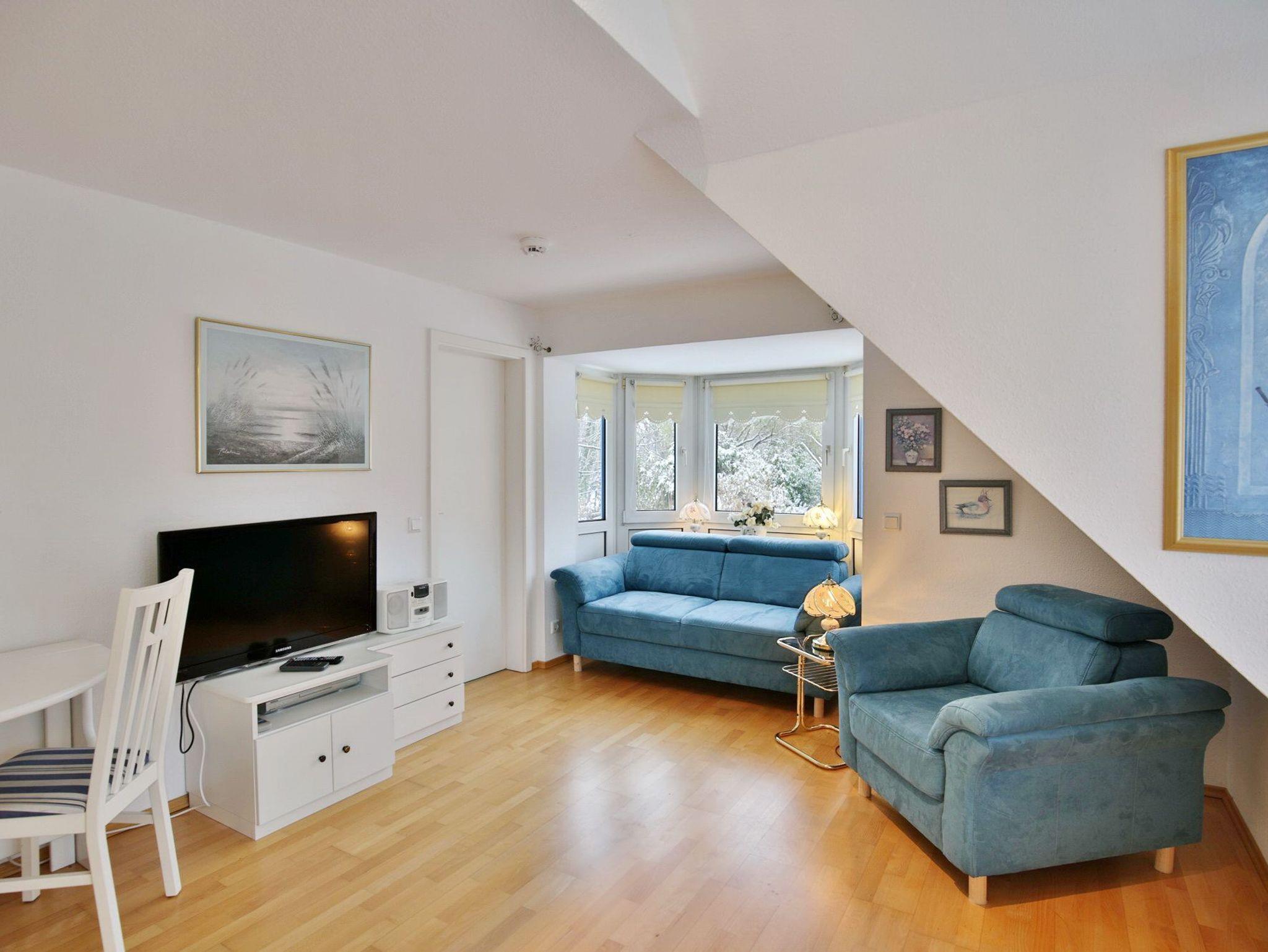 Zentral gelegene 2-Raum-Wohnung in der 1. Etage, ca. 35m², komplett ausgestattet bis 2 Pers., 1 Schlafzimmer mit Doppelbett, 1 Wohnzimmer mit kleinem West-Balkon, Küchenzeile (Backofen, Geschirrspüler und Mikrowelle), Kabel-TV, DVD-Player, Radio, Du/WC, Flur, keine Haustiere, Nichtraucher, allergikergerecht, reservierter Pkw-Stellplatz #12 auf dem Außengelände.