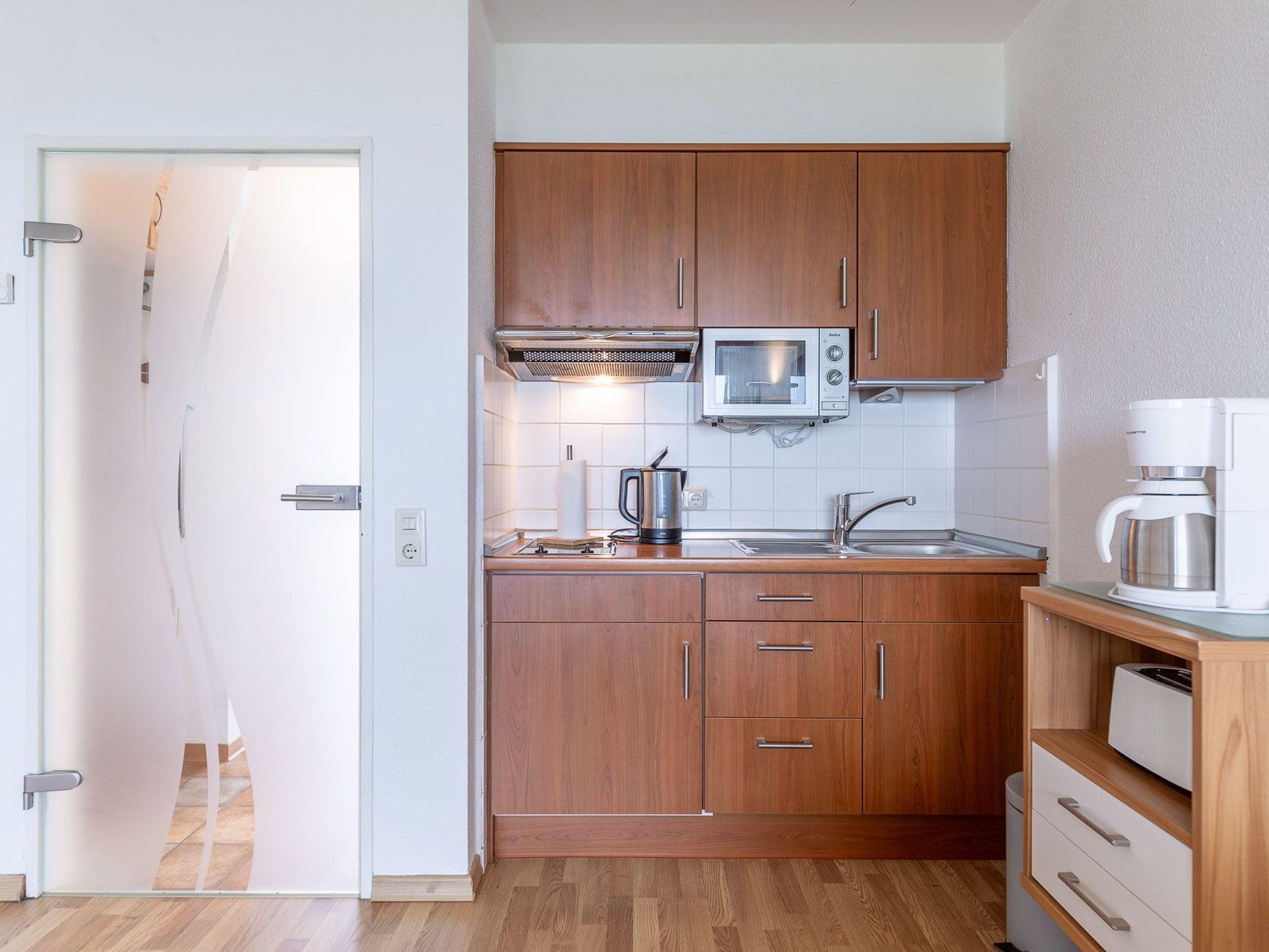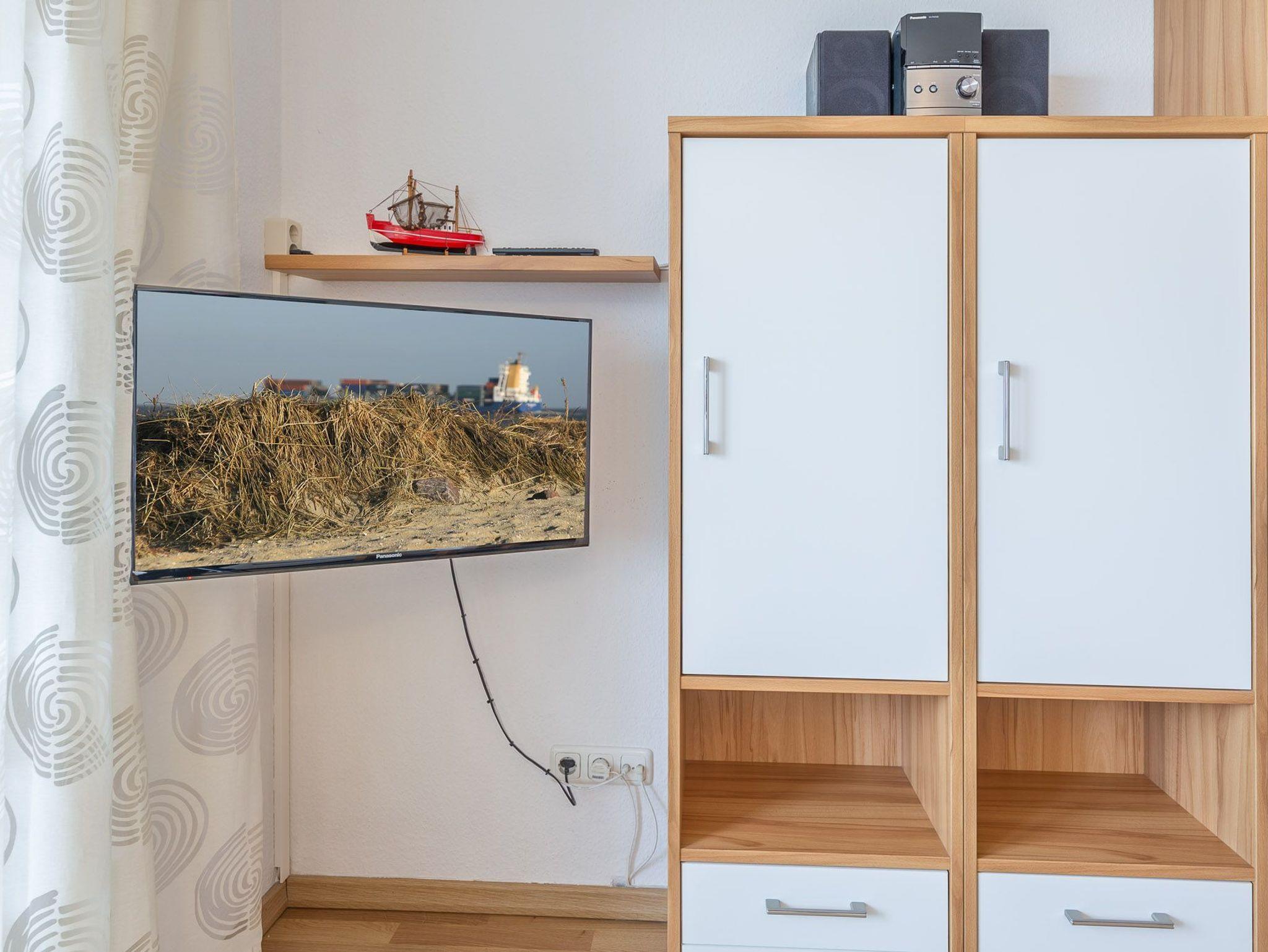 Der Esstisch am Fenster gewährleistet, dass Sie schon beim allmorgendlichen Kaffee den faszinierenden Meerblick auf die vorbeifahrenden Großsegler, Kutter und Kreuzfahrtschiffe genießen können. Ein LCD Fernseher sorgt dafür, dass Sie auch im Urlaub nicht auf Ihre Lieblingsserie verzichten müssen. Eine Küchenzeile ist im Wohnbereich integriert.