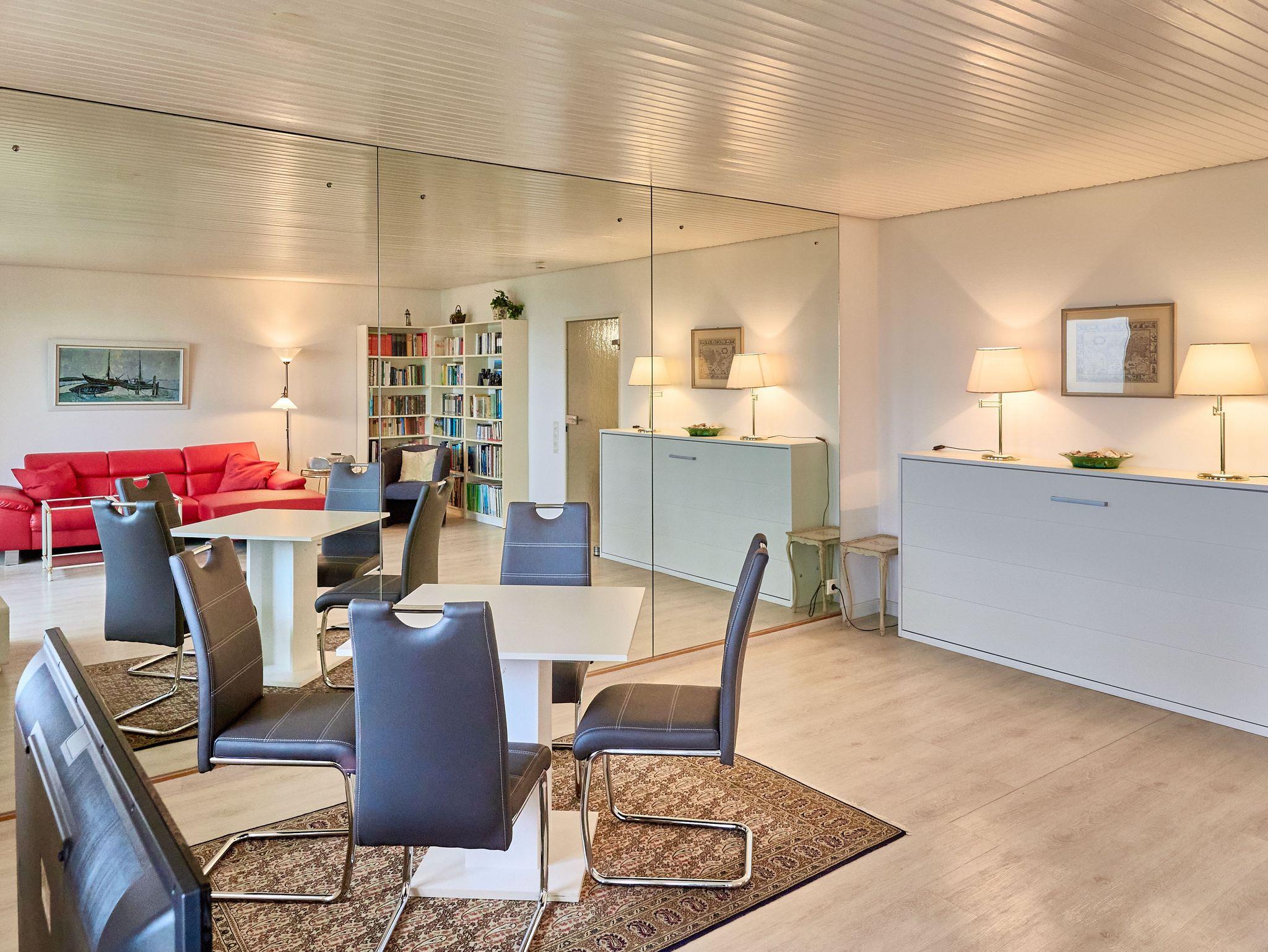 Die moderne Einrichtung mit Fußbodenheizung, großer Spiegelwand, heller Holzdecke sowie der große Wohnraum verleihen der Wohnung ihren besonderen Charme.