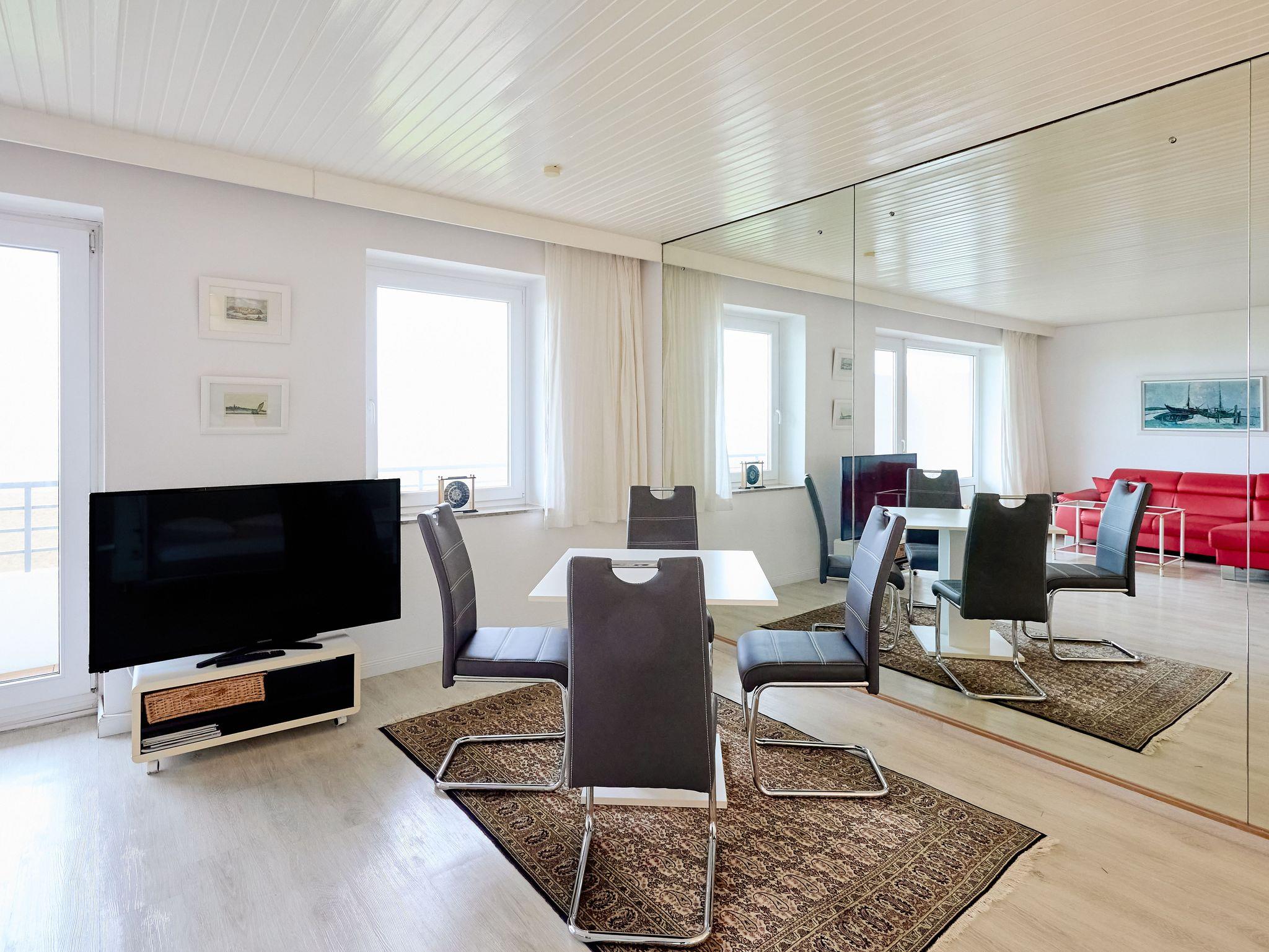 Moderne Ferienwohnung Logenblick mit Panoramablick auf die Nordsee und direkten Zugang zu Strand und Sehenswürdigkeiten.