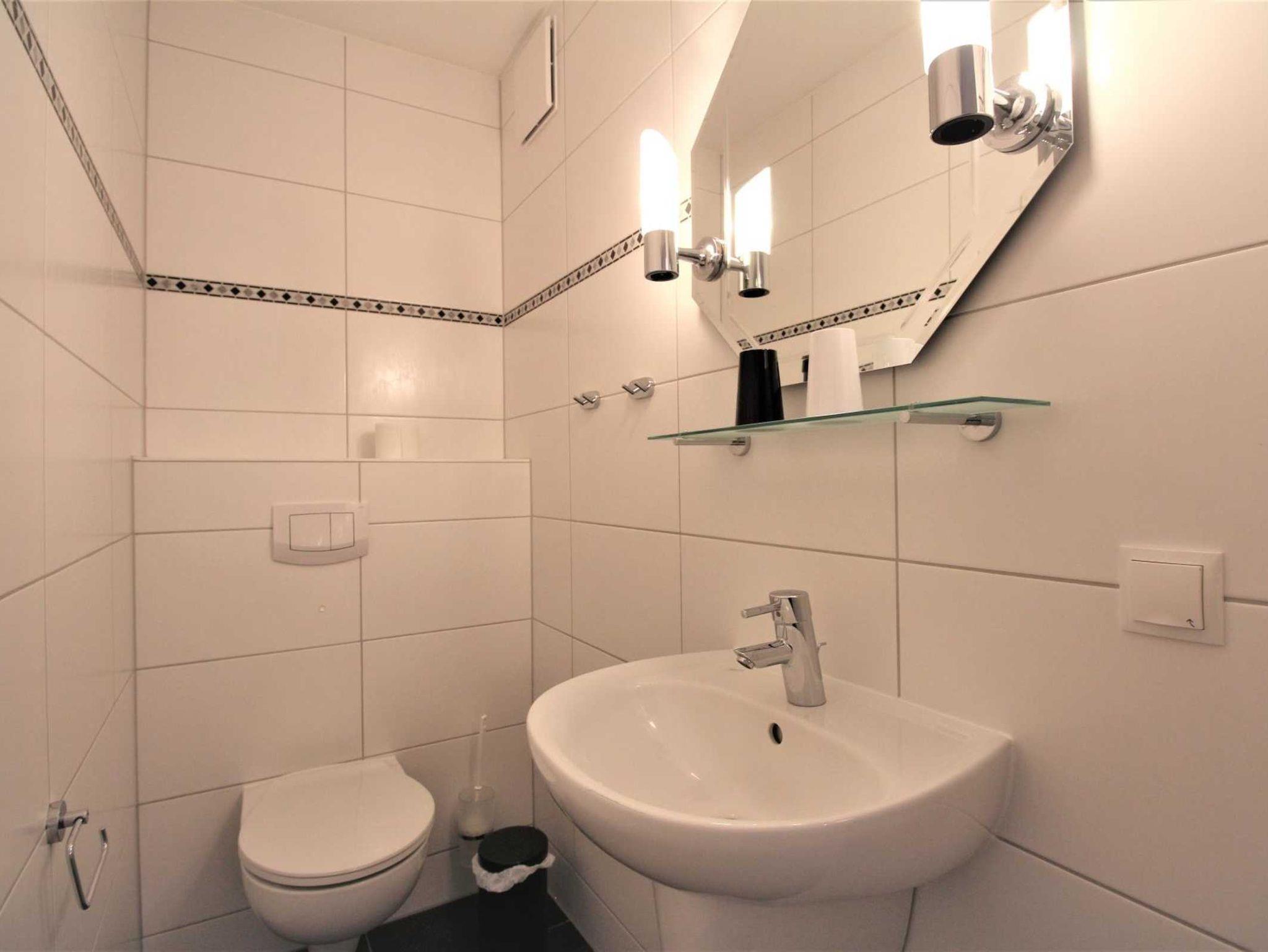Ein zusätzliches Gäste-WC mit großem Waschbecken ist ebenfalls vorhanden. Im Abstellraum runden Bügeleisen, Bügelbrett und Wäscheständer das Angebot ab.
