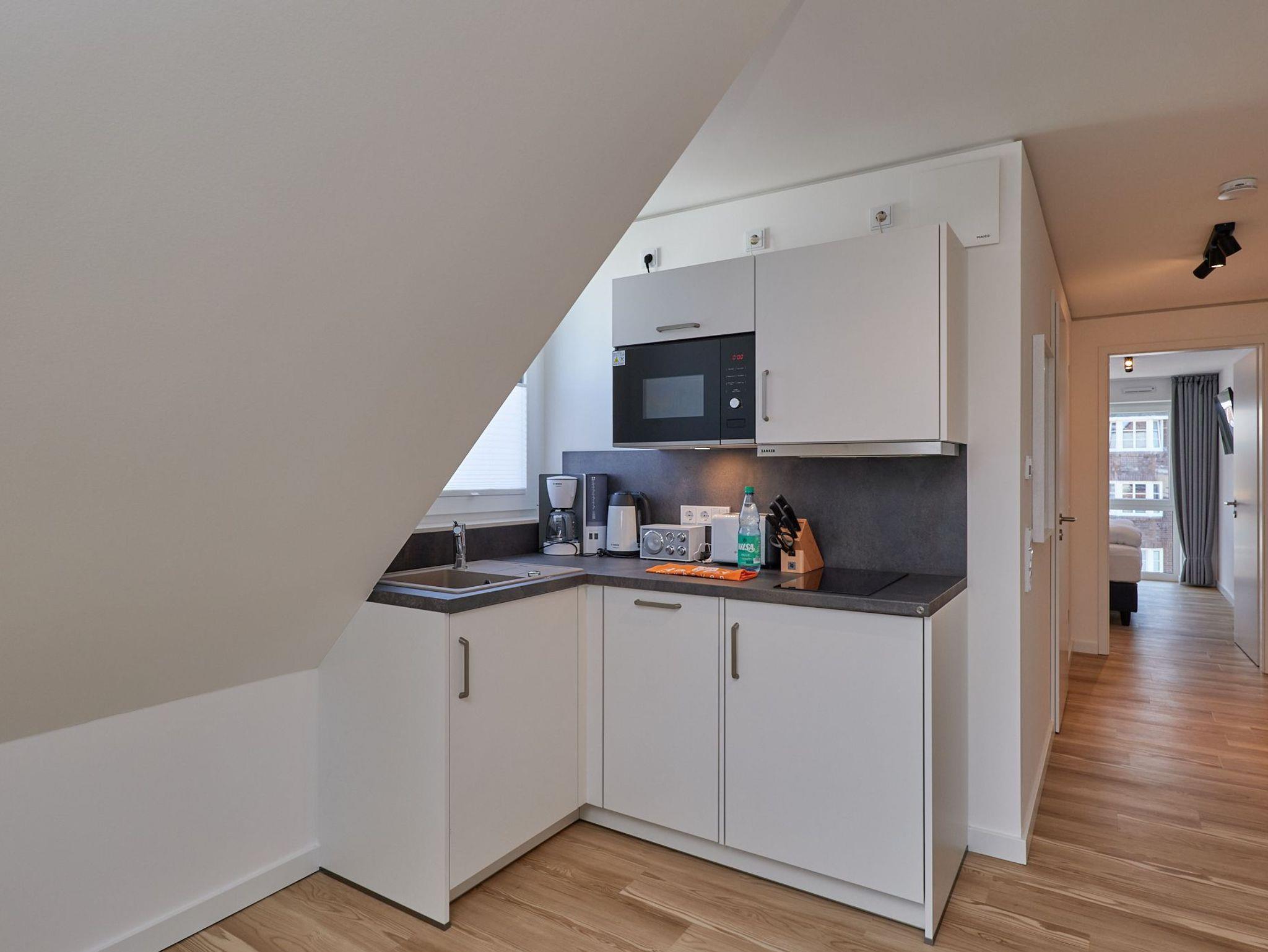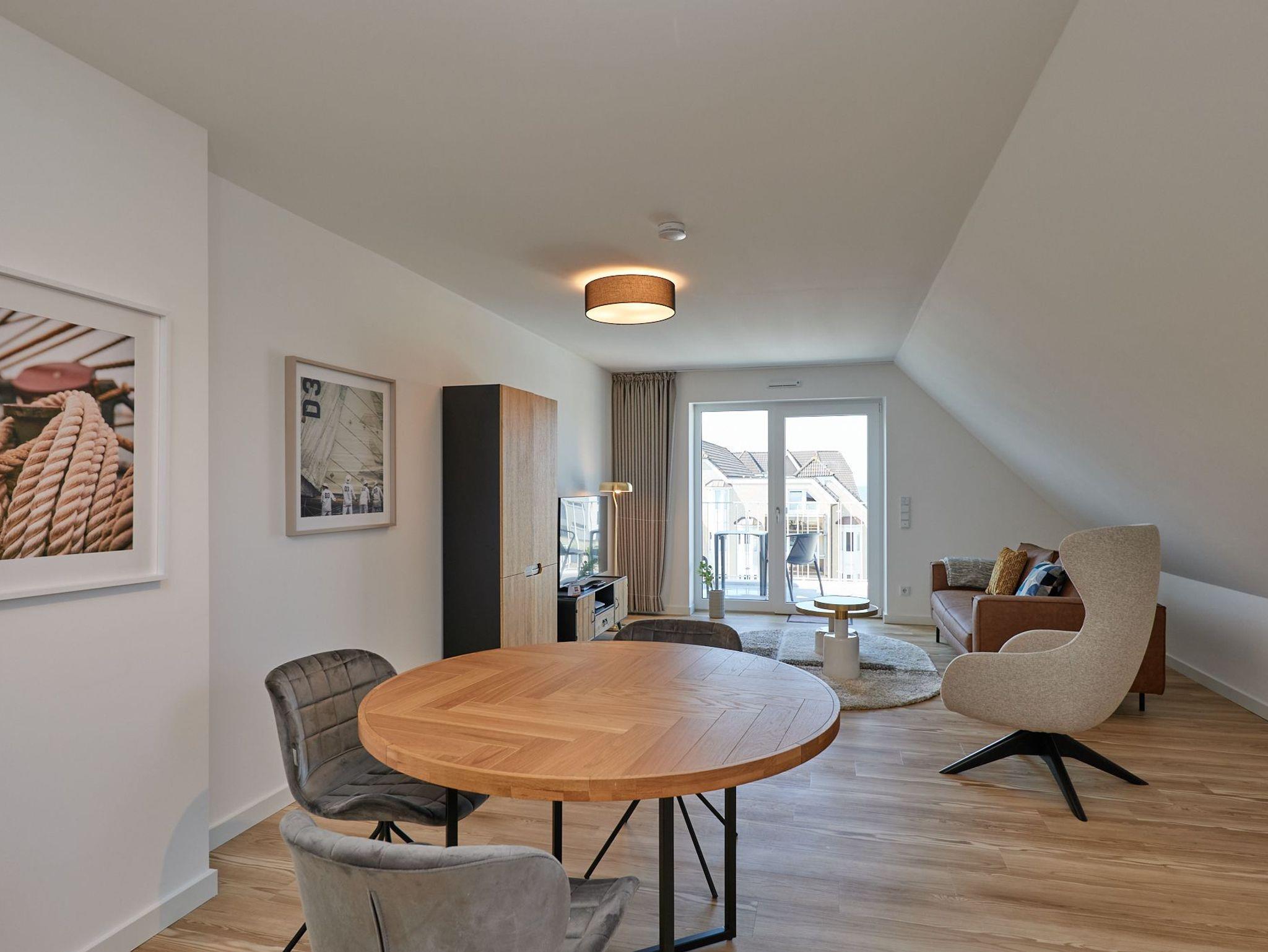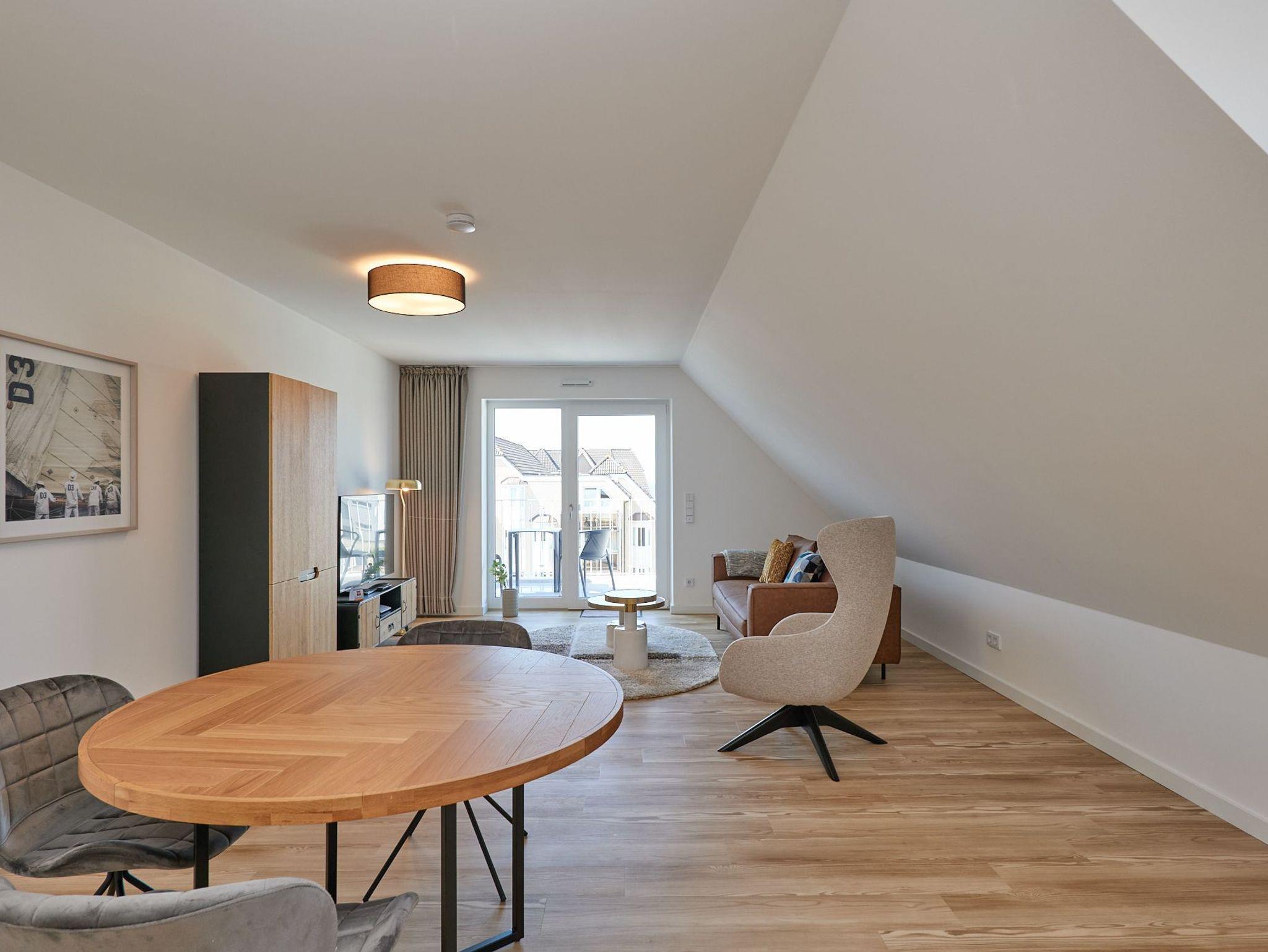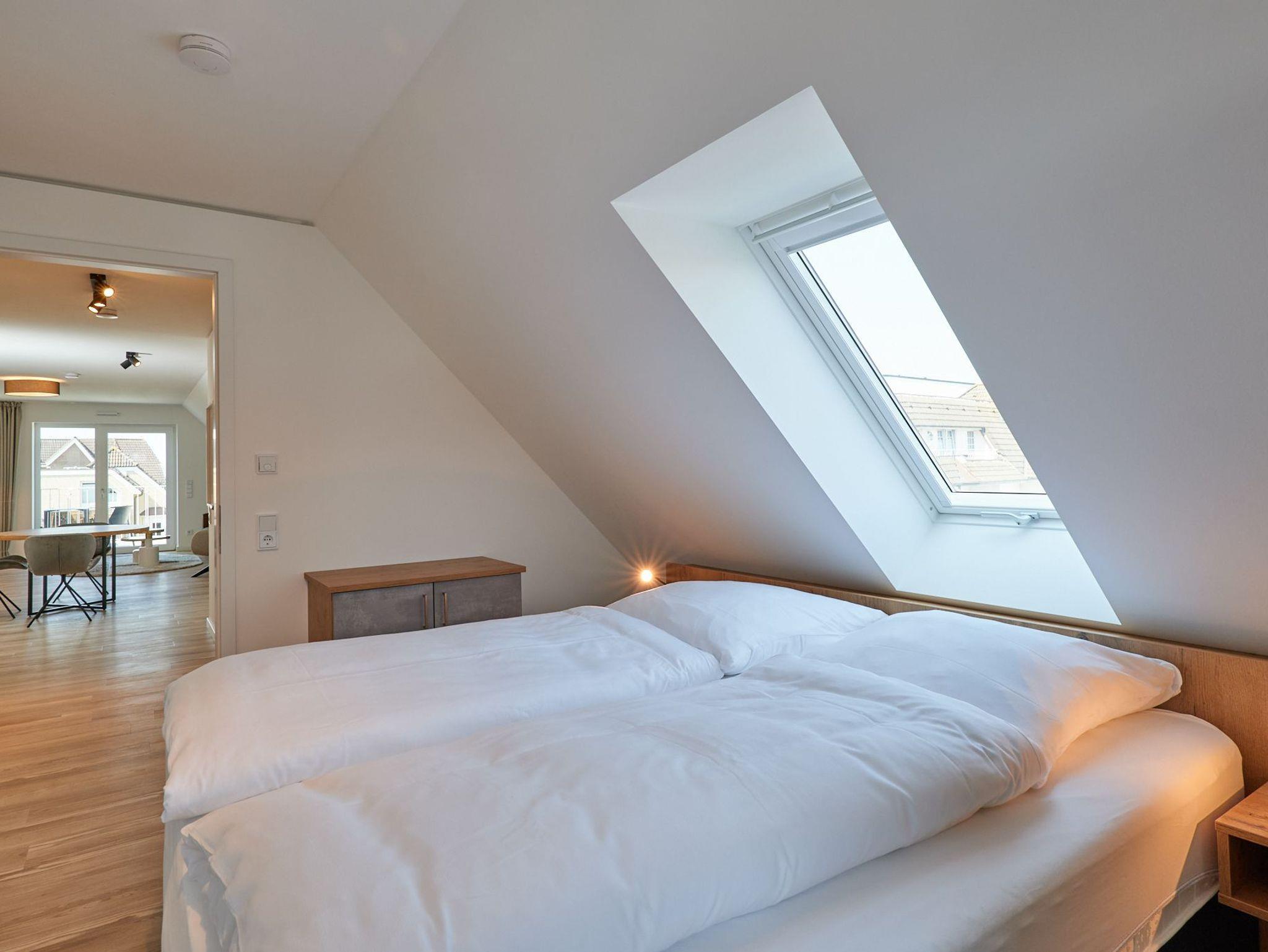 Neubau Mai 2023! Sehr schöne, moderne 2-Raum-Wohnung bis 2 Pers. voll ausgestattet auf ca. 49 m² in der 3.Etage gelegen, 1 Schlafzimmer mit komfortablen Doppelbett (Bettwäsche inkl.) und Außenjalousien an allen Fenstern (Veluxfenster mit Rollo innen), ebenerdige Dusche/WC, Wohnzimmer mit Küchenzeile (2 Platten, Mikrowelle/Backkombi, Geschirrspüler) 2x Kabel-TV, Radio, kostenfreies W-LAN-Internet, großer Balkon mit Teilseesicht (nord/west), beide Zimmer mit Dachschrägen, Personenaufzug, die Wohnung ist barrierefrei erreichbar, reservierter Pkw-Stellplatz in der Tiefgarage inkl., es sind keine Haustiere erlaubt und natürlich Nichtraucher. Durchfahrtshöhe Tiefgarage: 2,05m.