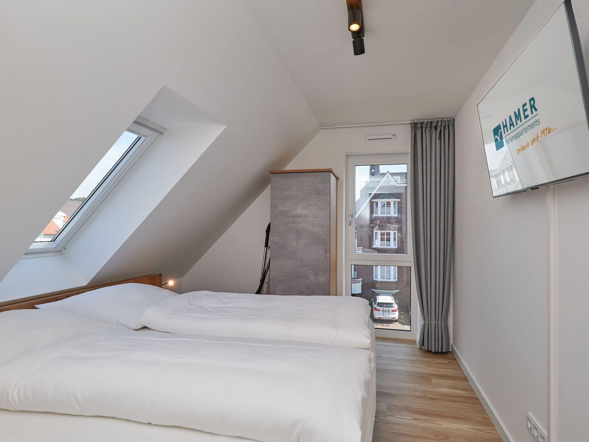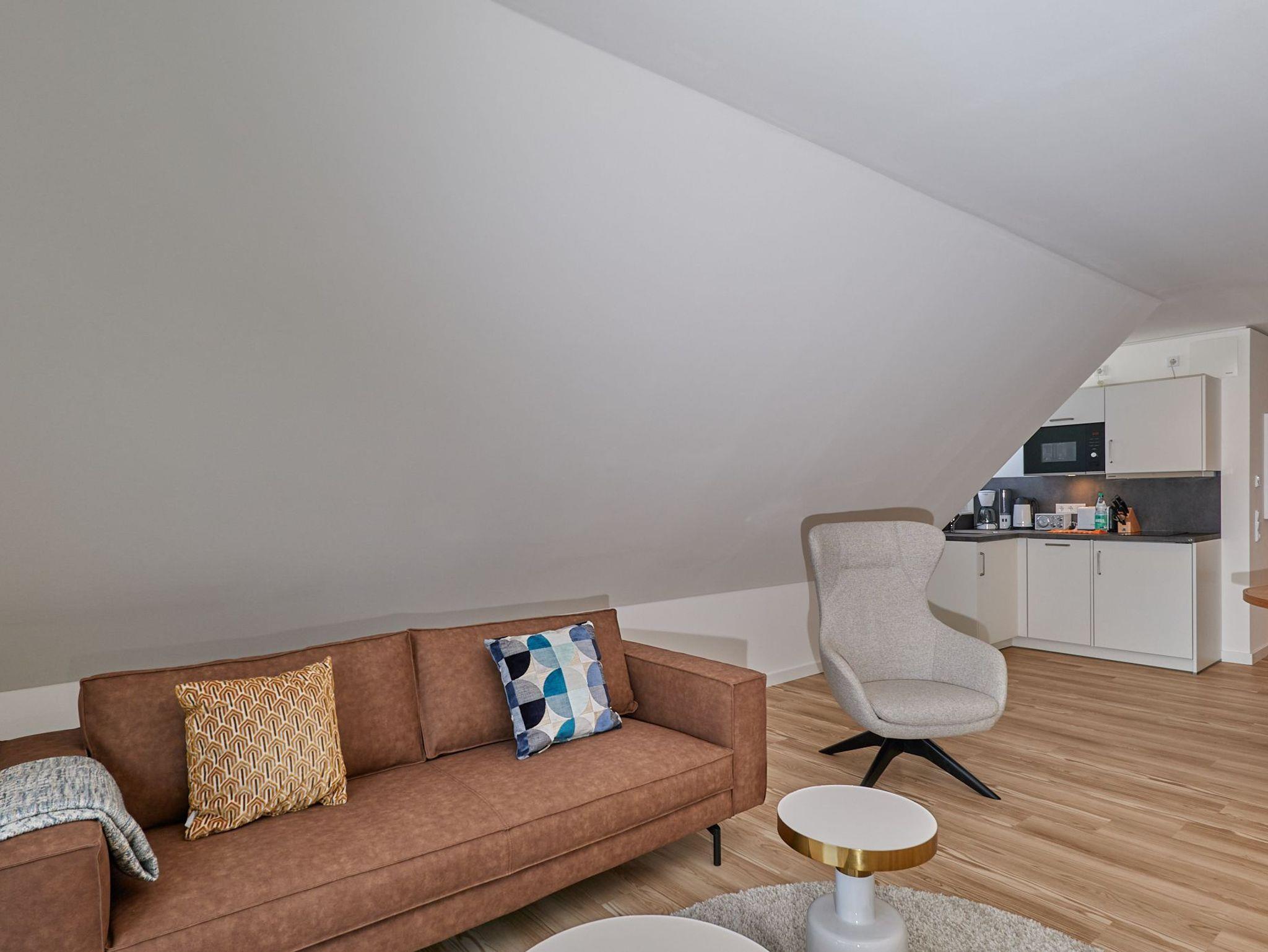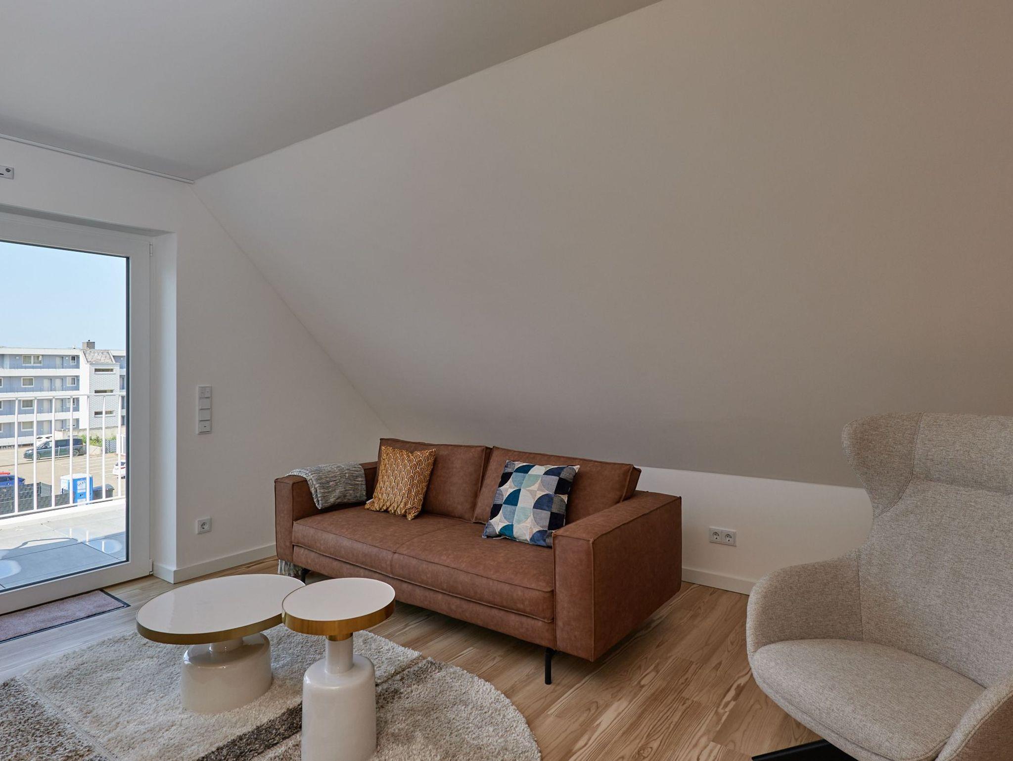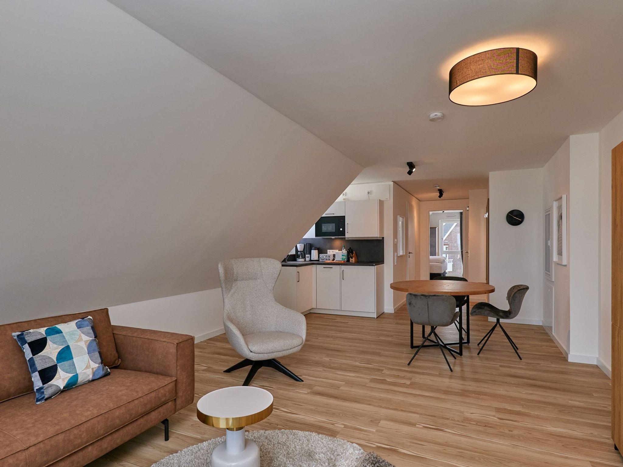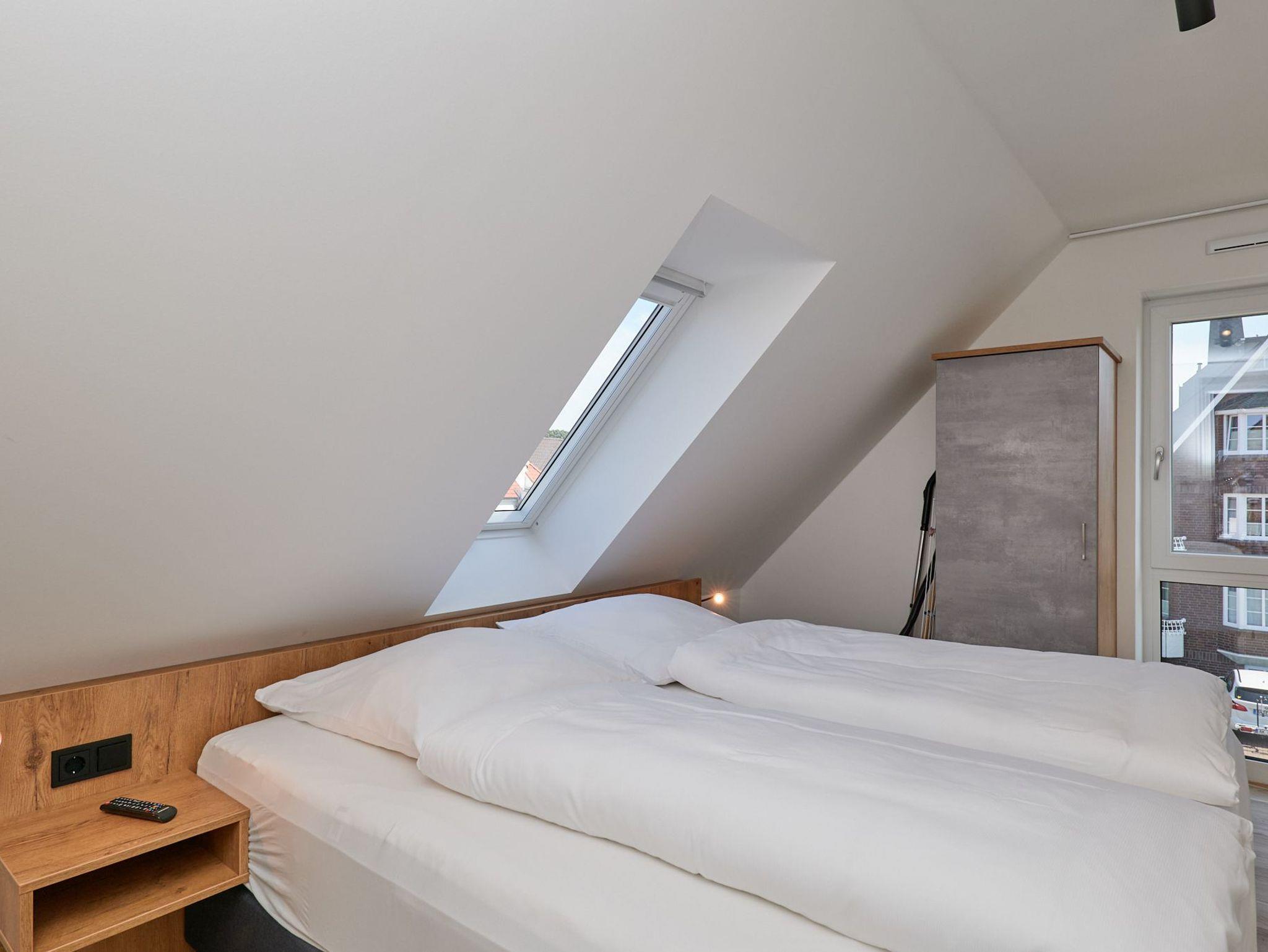 Neubau Mai 2023! Sehr schöne, moderne 2-Raum-Wohnung bis 2 Pers. voll ausgestattet auf ca. 49 m² in der 3.Etage gelegen, 1 Schlafzimmer mit komfortablen Doppelbett (Bettwäsche inkl.) und Außenjalousien an allen Fenstern (Veluxfenster mit Rollo innen), ebenerdige Dusche/WC, Wohnzimmer mit Küchenzeile (2 Platten, Mikrowelle/Backkombi, Geschirrspüler) 2x Kabel-TV, Radio, kostenfreies W-LAN-Internet, großer Balkon mit Teilseesicht (nord/west), beide Zimmer mit Dachschrägen, Personenaufzug, die Wohnung ist barrierefrei erreichbar, reservierter Pkw-Stellplatz in der Tiefgarage inkl., es sind keine Haustiere erlaubt und natürlich Nichtraucher. Durchfahrtshöhe Tiefgarage: 2,05m.