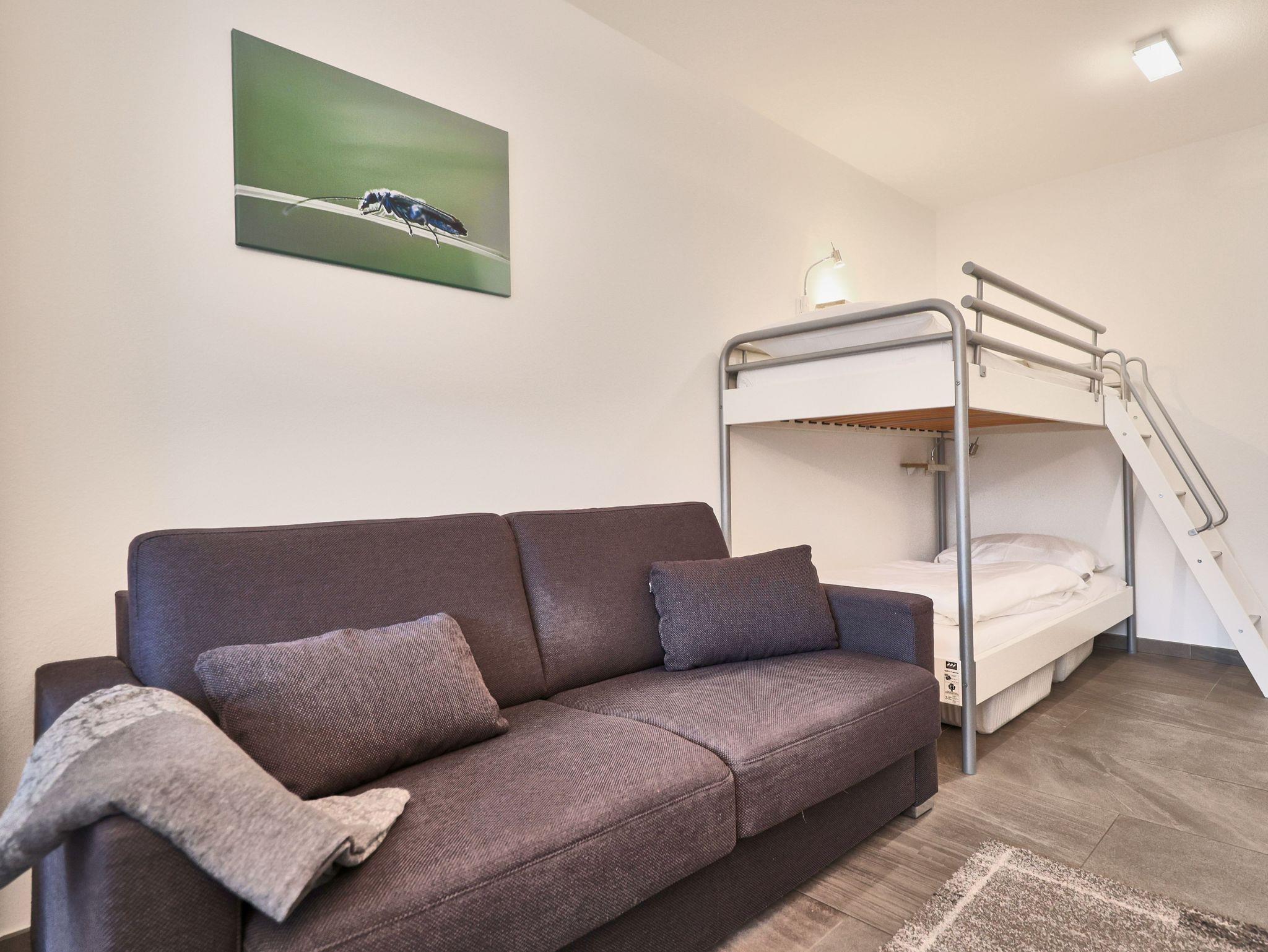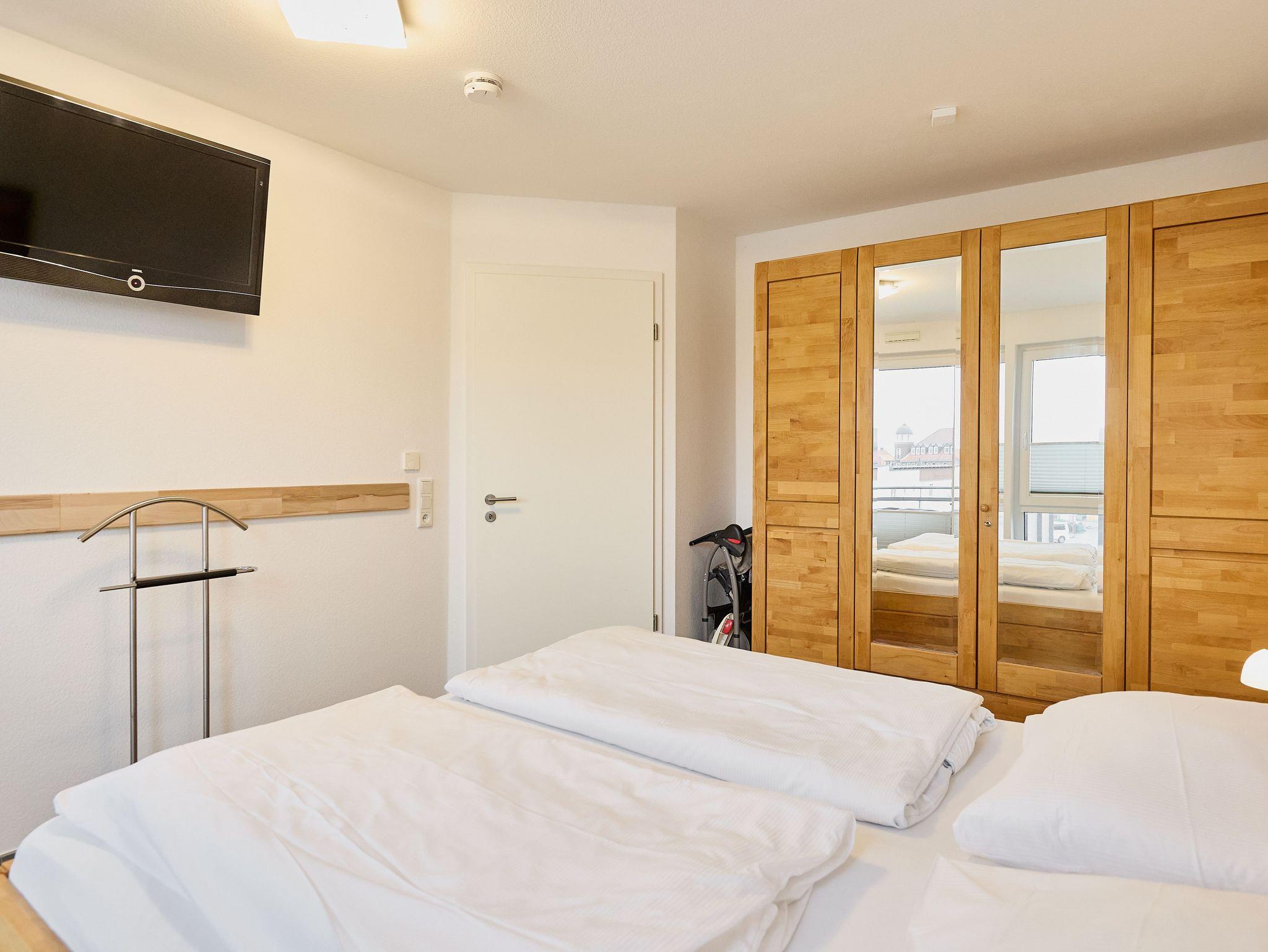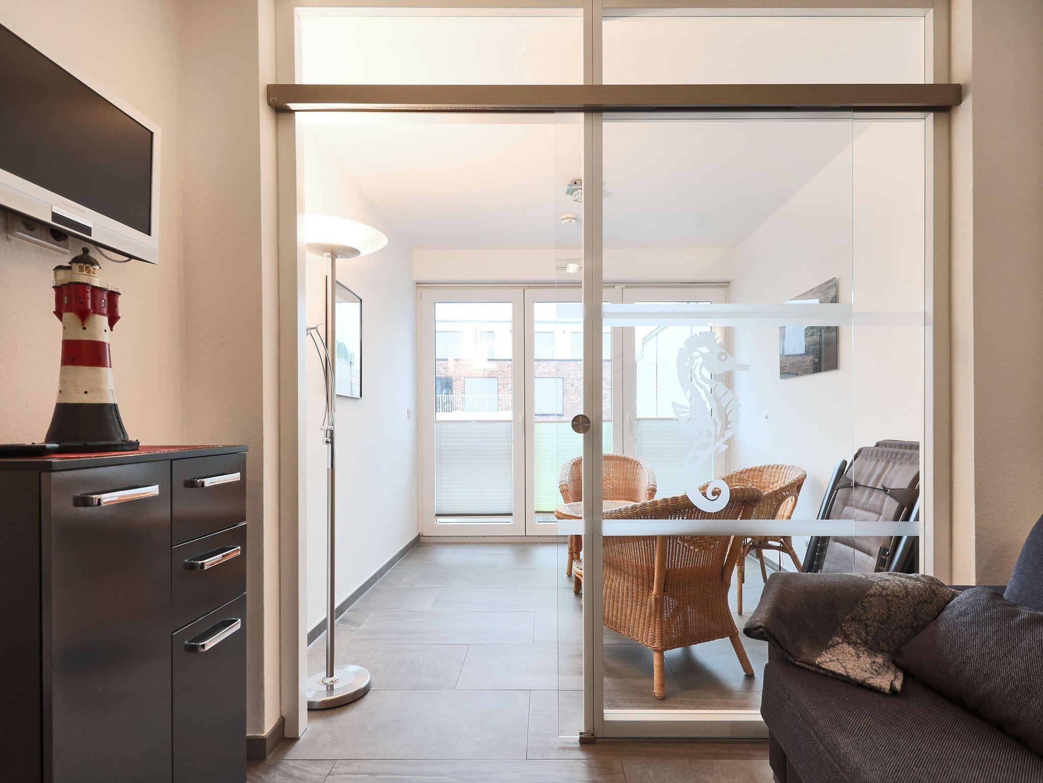 Nordico, Nordstrasse 8a, FeWo 4, 2. OG, 3-Zimmer / Räume plus kleiner zusätzlicher Wintergarten, ca. 70m², bis zu 6 Personen (max. 4 Erwachsene), Kleiner Seeblick über den Hof der Neuwerkfuhrwerke auf das Watt und die schöne Nordsee mit deren Schiffsverkehr auf der Elbe. Diese großzügige und hochwertige Neubau - Ferienwohnung mitten in Duhnen (keine 100 Schritte zum Strand / zum Ahoi Bad oder zum Ortskern ) mit einem großem Balkon und einen zusätzlichen Wintergarten bietet Ihnen und Ihrer Familie einen tollen Komfort und verspricht Ihnen einen schönen Urlaub. Die Ferienwohnung ist mit einem großzügigem Wohn- und Essbereich, sowie mit einer hochwertigen Einbauküche ausgestattet. Der Esstisch bildet den Mittelpunkt. Dadurch das der Balkon überdacht ist, können Sie hier geschützt sitzen. Vom Flur aus kommen Sie in das Duschbad mit WC und in die 2 weiteren Schlafbereiche. 1 Schlafzimmer ist mit einem Doppelbett und einen großen Kleiderschrank ausgestattet. Der 2. Schlafbereich mit einem Etagenbett (1 Erwachsener kann auch hier gut schlafen) und einer weiteren Schlafcouch (zum verweilen oder auch für 2 weitere Personen zum schlafen, hochwertig mit eigener Liegefläche!) ausgestattet. Der Zugang zum Wintergarten lässt sich über eine Glastür separat öffnen und wäre so nach Öffnung der Fenster vom Schlafbereich getrennt oder zusammenhängend. So wie Sie es wünschen. Der Richtung Westen gelegene Wintergarten kann selber auch geöffnet werden und ist somit auch als Loggia zu nutzen. Eine tolle Ferienwohnung für den Familienurlaub. Nah zum Strand und doch ruhig gelegen.
