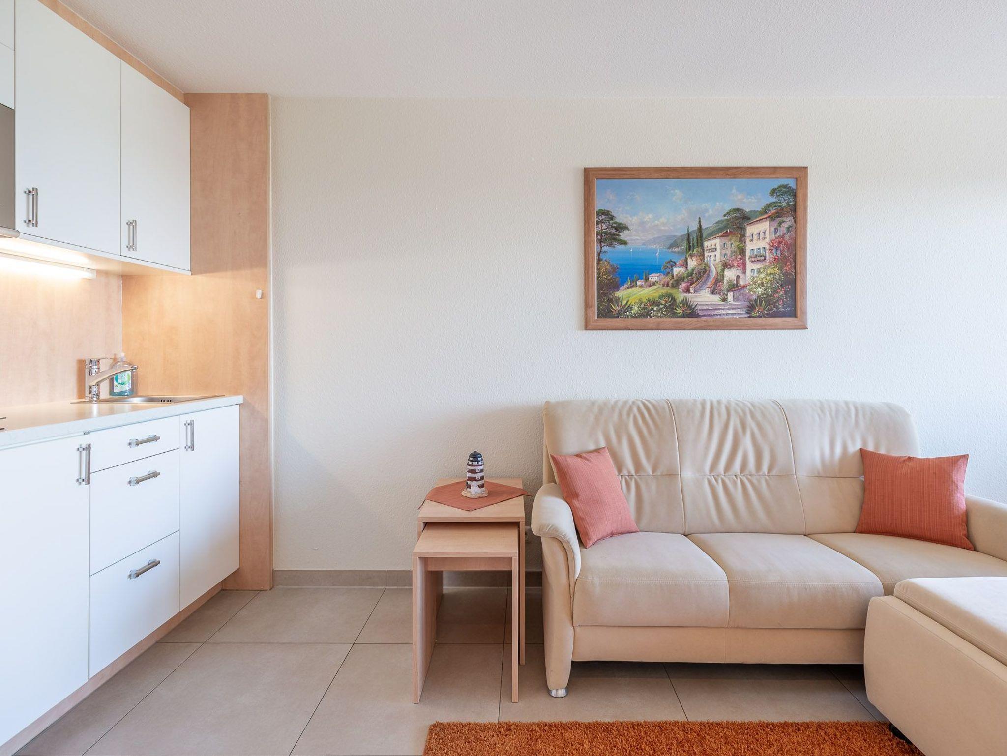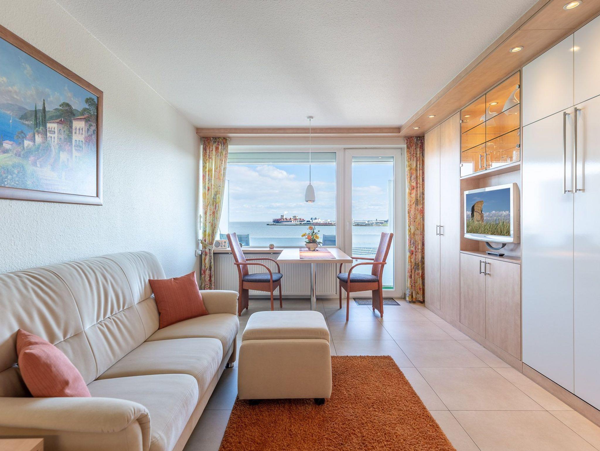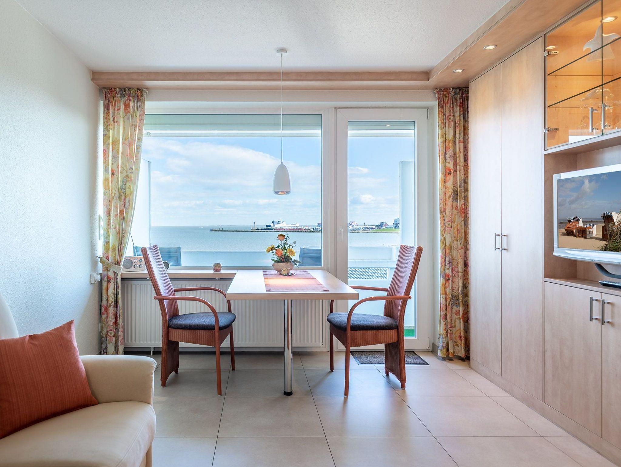 Nach einem langen und erlebnisreichen Tag können Sie in den extra breiten und äußerst komfortablen Armlehnstühlen entspannen und die Parade der vorbeiziehenden Segelschiffe, Krabbenkutter und Luxus Liner beobachten. Der Esstisch am Fenster gewährleistet, dass Sie schon beim Frühstück den spektakulären Meerblick genießen können. Ein LCD Fernseher sorgt dafür, dass Sie auch im Urlaub nicht auf Ihre Lieblingsserie verzichten müssen. Eine kleine, komplett ausgestattete Küchenzeile ist im Wohnbereich integriert.