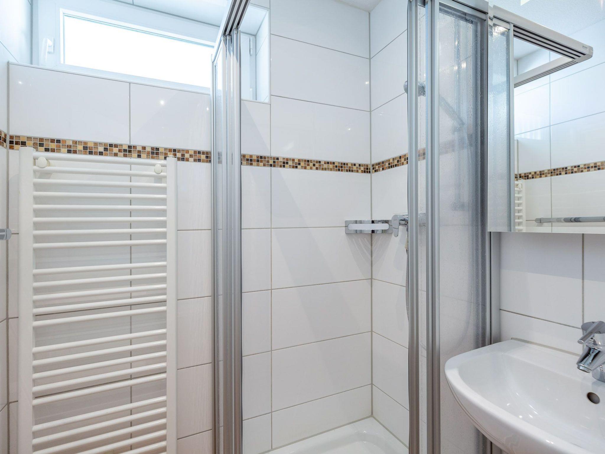 Die hochwertigen Schrankbetten (2x90x200) im Wohnbereich lassen sich getrennt nutzen. Außerdem bietet ein separates Einzelbett (90x200) im Vorraum eine vom Wohnbereich abgetrennte Schlafmöglichkeit. Die Ferienwohnung ist mit elektrischen Außenjalousien ausgestattet, sodass Sie nicht von der Morgensonne geweckt werden. Auch vom möblierten Balkon genießen Sie den faszinierenden Meerblick. Das modern sanierte Bad mit Dusche und WC verfügt über ein Fenster zum Belüften.