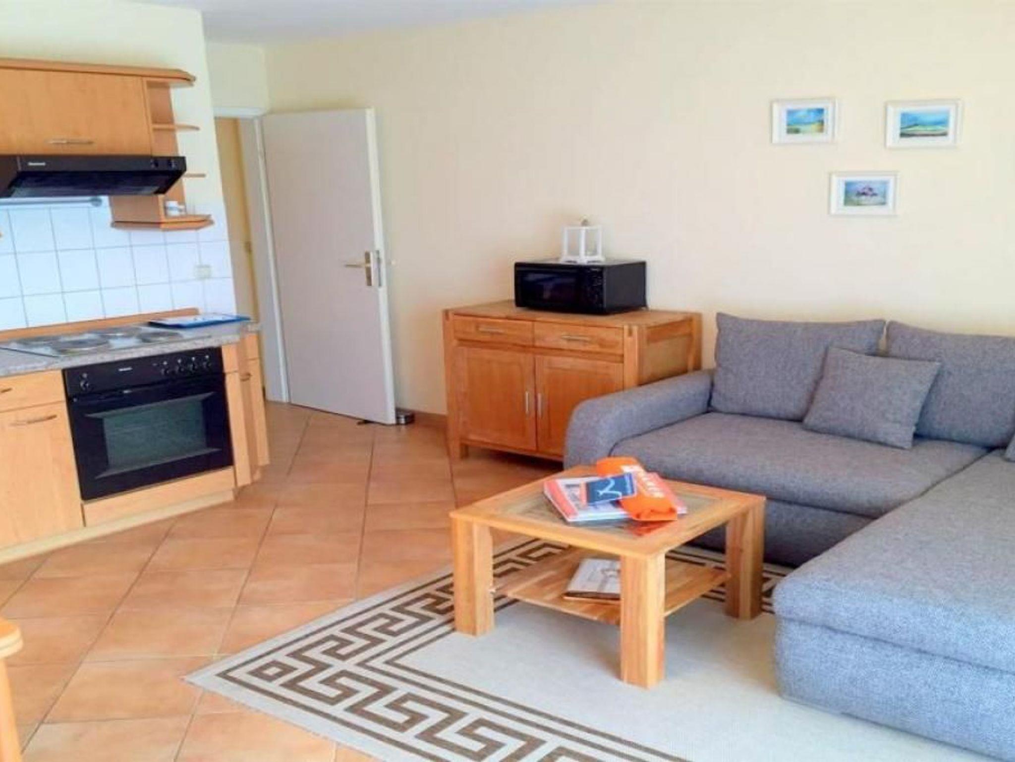 2-Raum-Parterrewohnung mit ca. 52m², komplett ausgestattet bis 4 Pers., 1 Schlafzimmer mit Doppelbett, 1 kombiniertes Wohn/Schlafzimmer mit Doppelbettcouch, alles gefliest, Kabel-TV, DVD, Radio/CD, W-Lan kostenfrei, Terrasse (west), Du/WC (neu in 2015), Küchenzeile mit 4 Pl., Backofen, Mikrowelle, Geschirrspüler, Senseo, Gefrierfach, Flur, Abstellraum, keine Haustiere, Nichtraucher, Pkw-Stellplatz