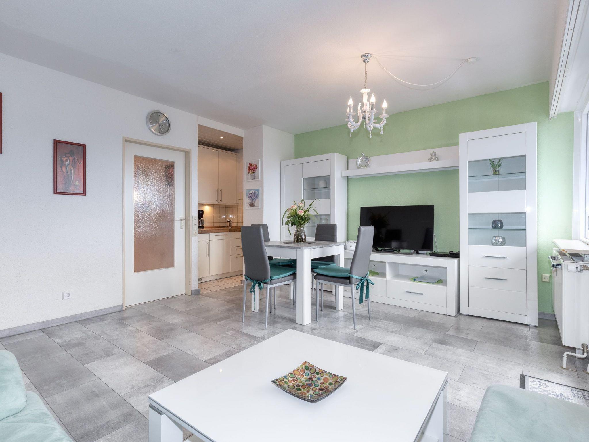 Das Apartment 66 ist ein 2-Raum-Apartment im 5. Obergeschoss für bis zu 4 Personen mit 38 qm. Der möblierte Ostbalkon bietet morgens Sonne und nachmittags Schatten.