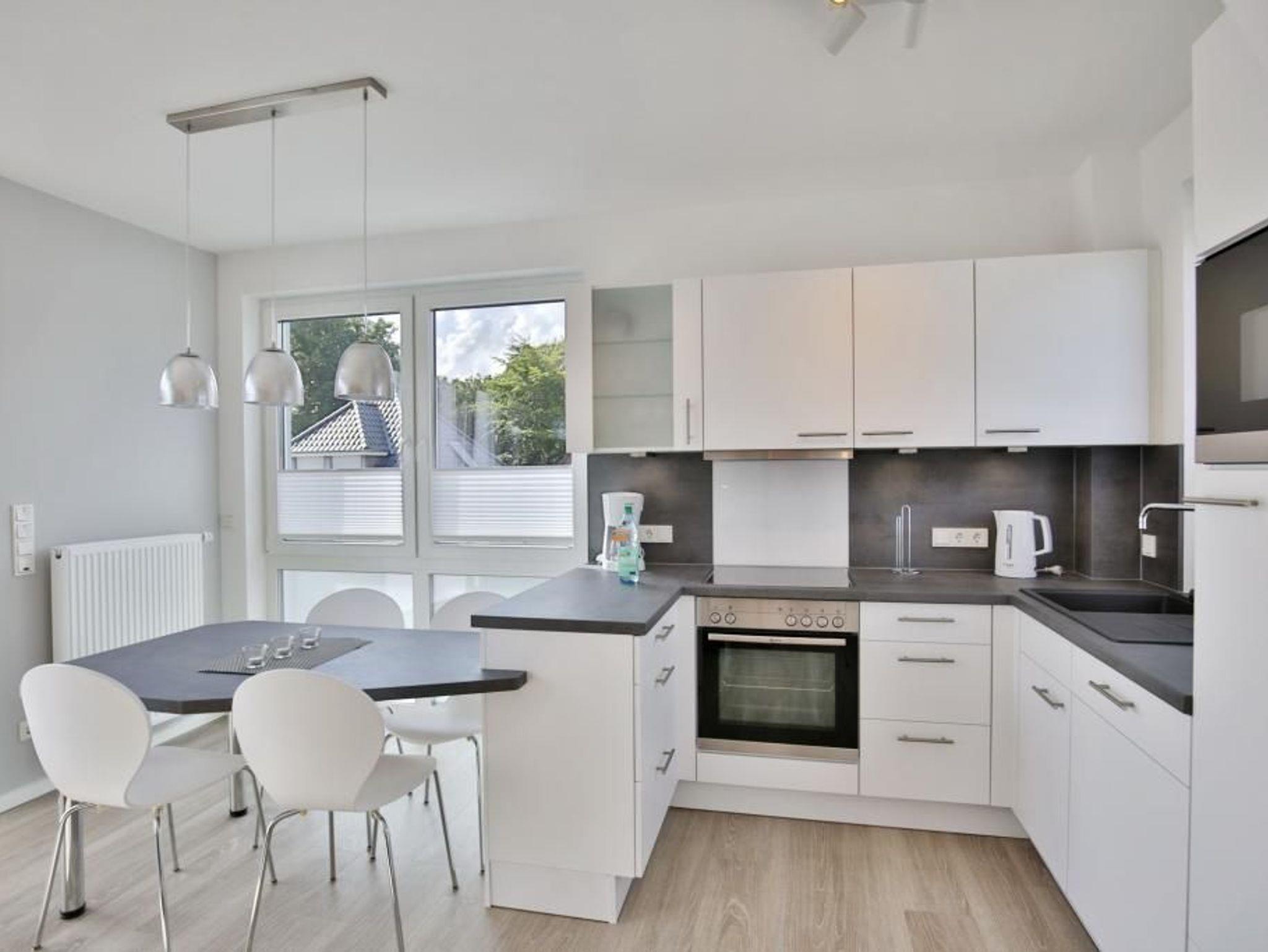 Schöne, moderne Ferienwohnung auf ca. 72m² bis 4 Pers. im 2.OG mit Personenaufzug. Balkon (süd), 2 Schlafzimmer mit TV (1x Doppelbett und 1x 2 Einzelbetten), Wohnzimmer mit vollständiger Küchenzeile (Geschirrspüler, Gefrierfach, Backofen, Mikrowelle), TV, Blue-Ray-DVD, kostenfreies W-LAN, ebenerdige Dusche/WC mit Föhn, Rollladen, reservierter Pkw-Stellplatz #8 am Haus, Nichtraucherwohnung, keine Haustiere gestattet.