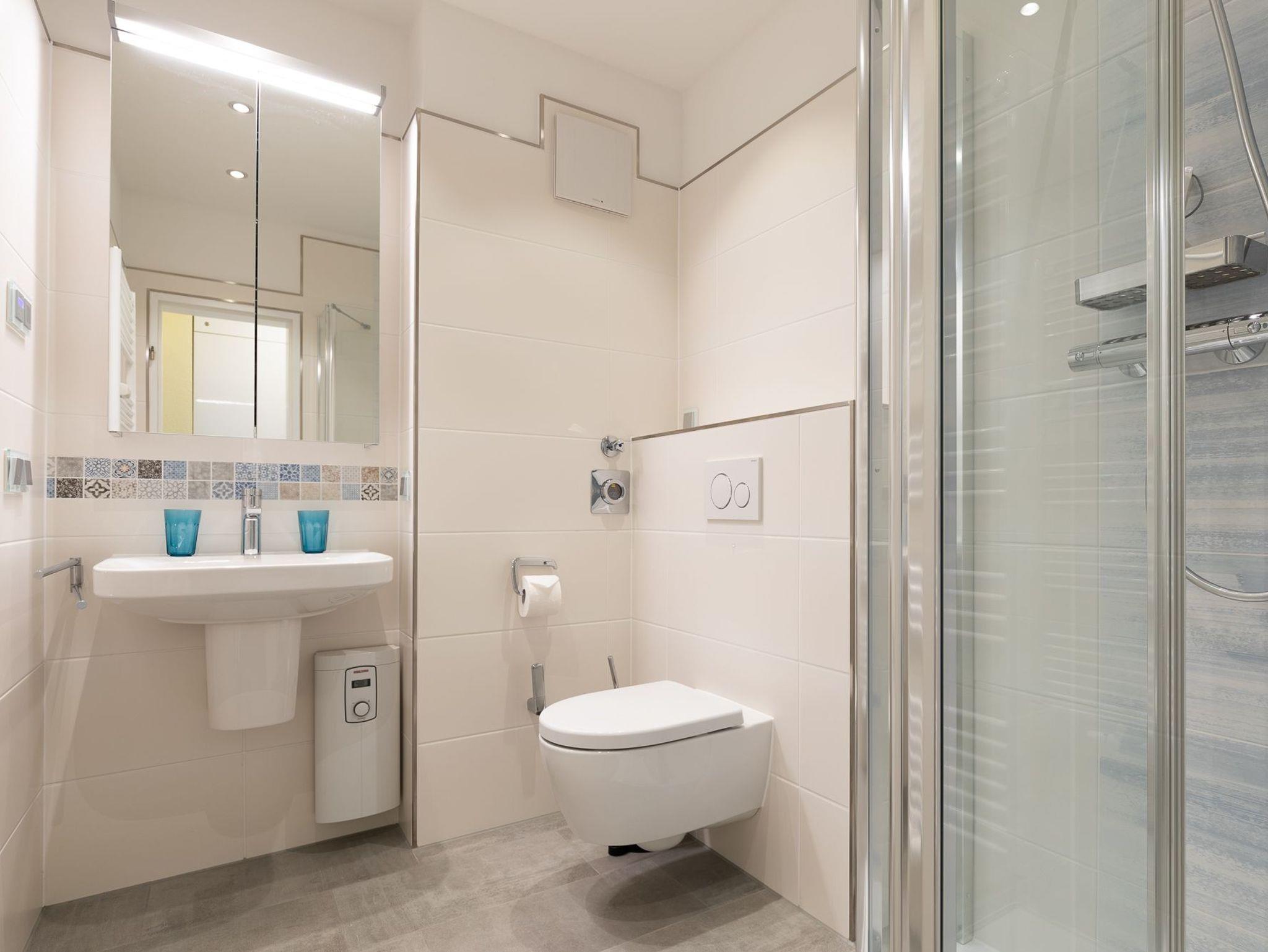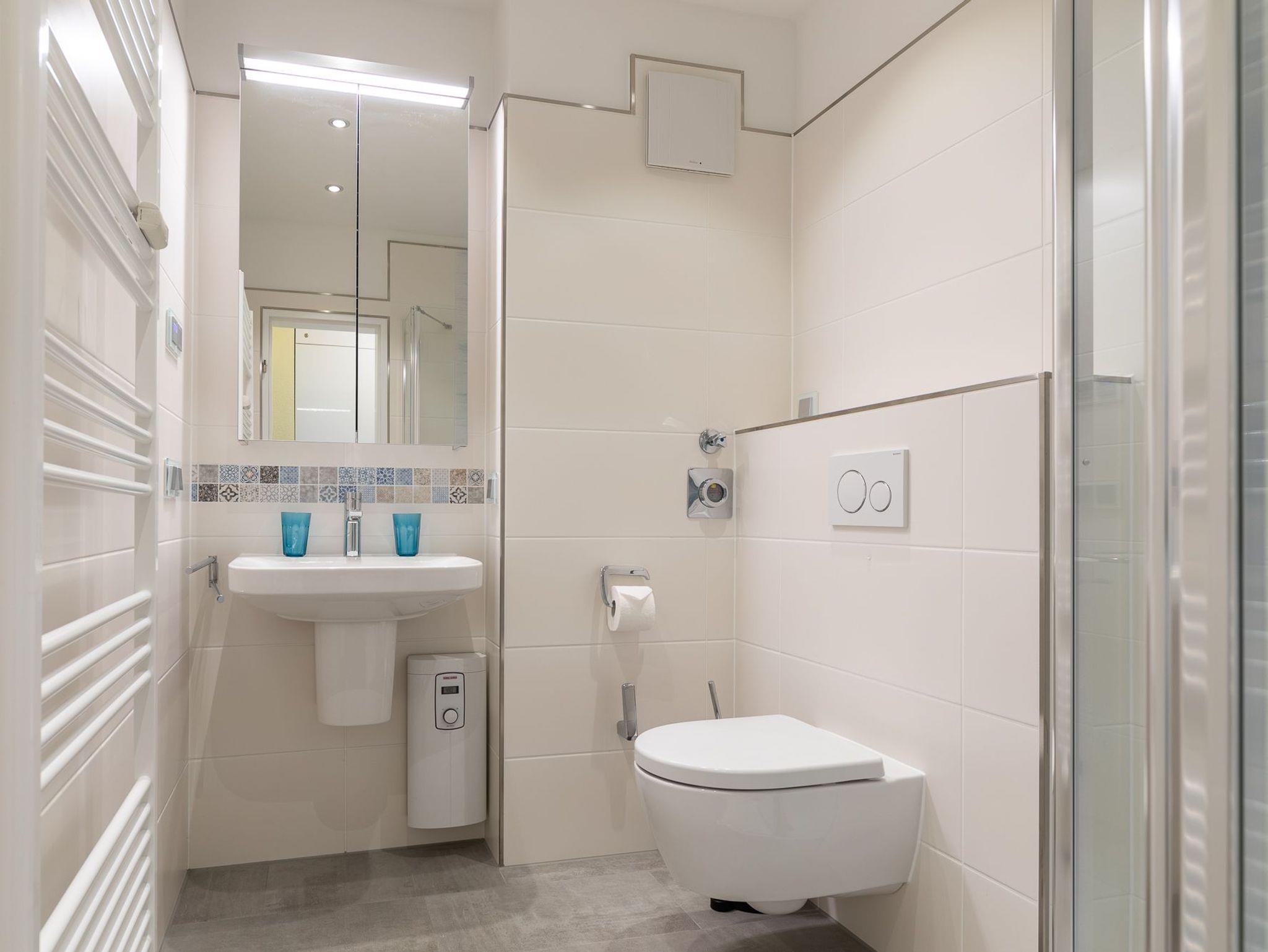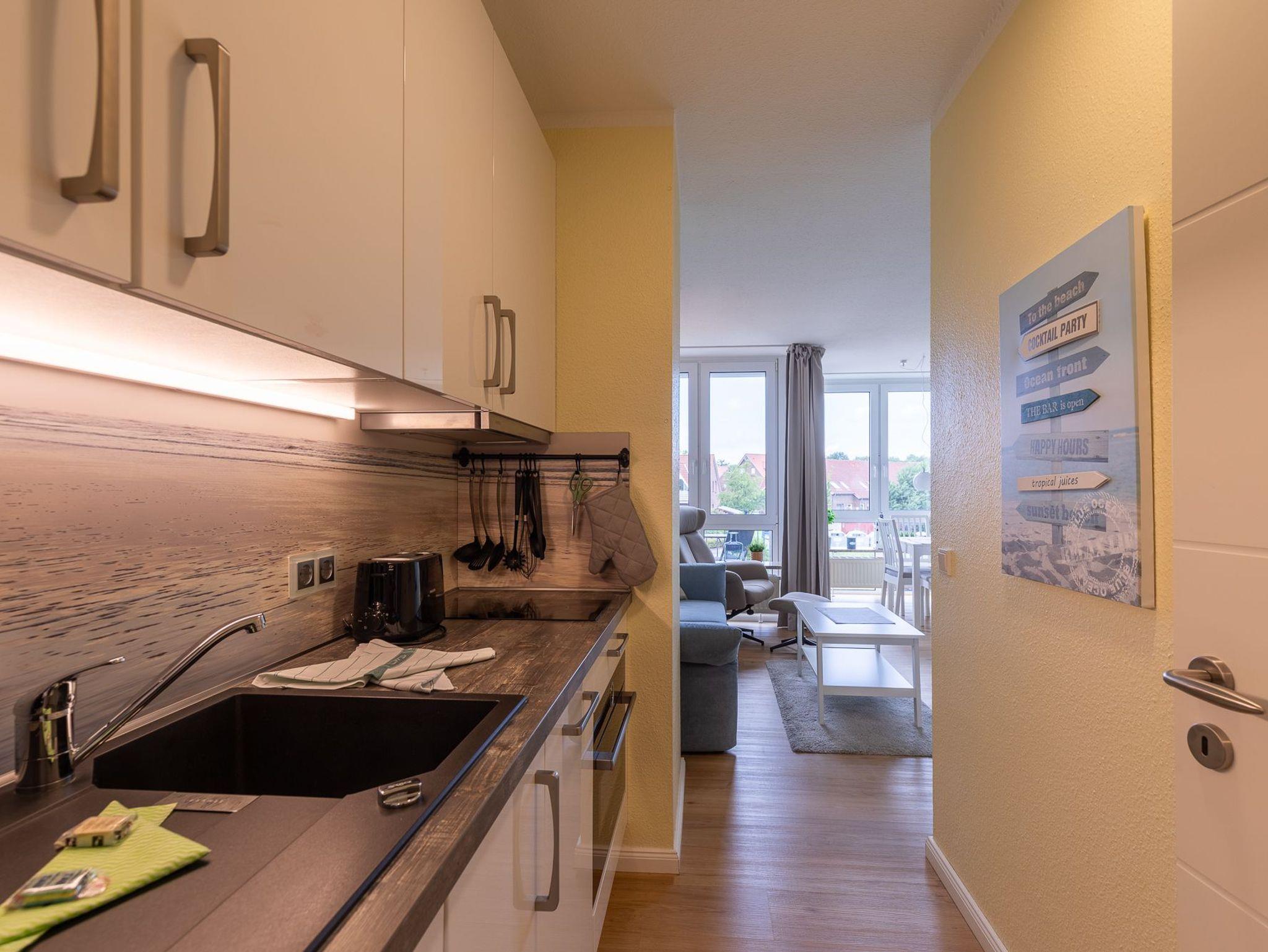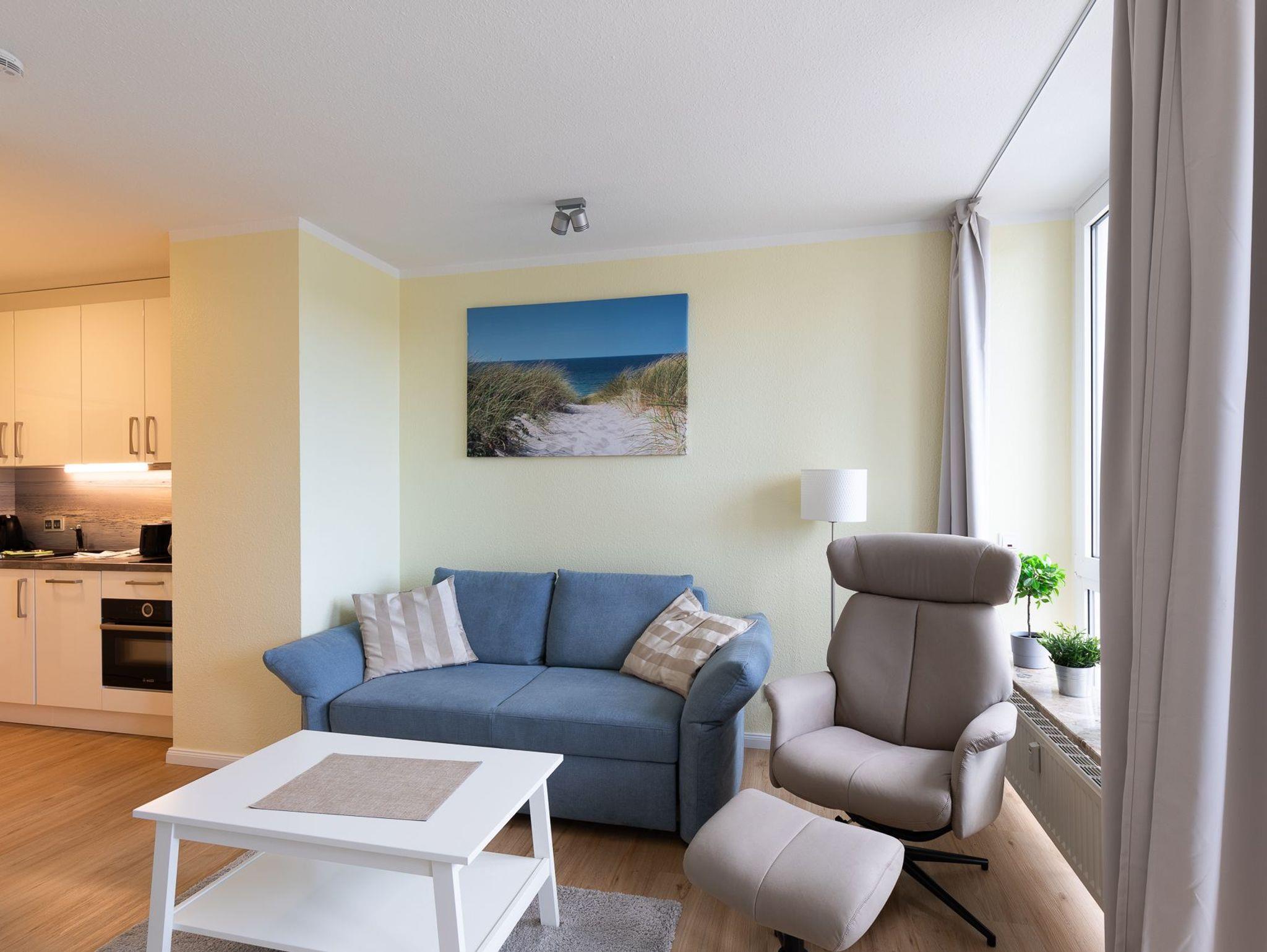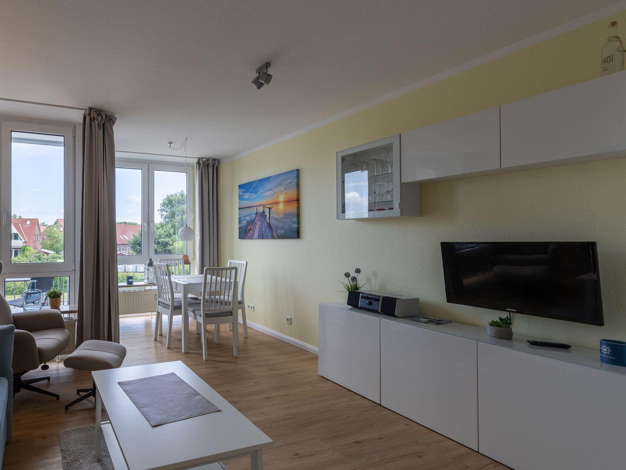 Die 1 Zimmer Wohnung, ca. 35m² ist für bis zu 3 Personen ausgestattet, helles Wohnzimmer mit Sofa (Schlafsofa), Sessel mit Fußteil, Flatscreen TV, Essplatz mit 4 Stühlen, abgetrennter Schlafbereich (Schlafnische, ohne Tür) mit 2 Einzelbetten (jeweils 90 x 200 cm) und Zugang zum Balkon (kleiner Nordbalkon - bietet Platz für 2 Personen, mit Gartenmöbel), Küchenzeile (Ceranfeld mit 2 Kochstellen, Mikrowelle, Kühlschrank - mit Gefrierfach, Geschirrspüler, Kaffeemaschine, Wasserkocher, Toaster), 1 Bad mit Dusche (mit Regenschauerdusche) und WC, Flur, WLAN inkl., PKW-Stellplatz am Haus, Nichtraucher, es sind keine Tiere erlaubt.