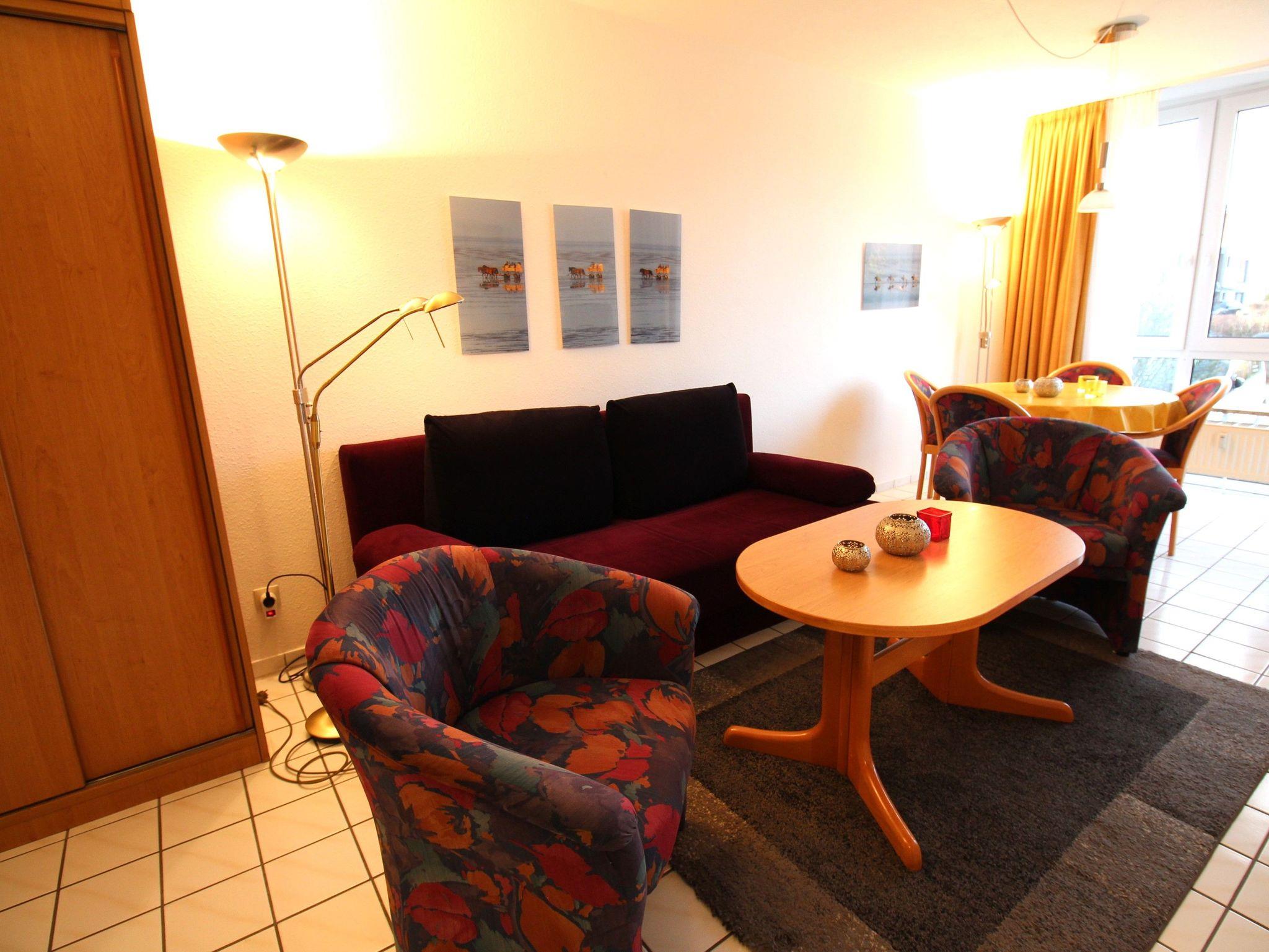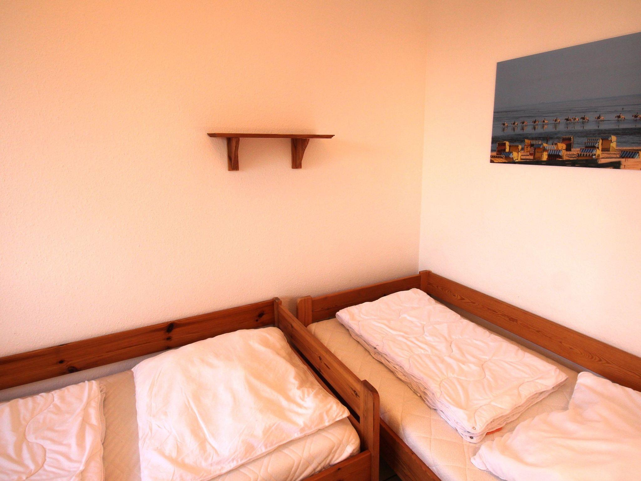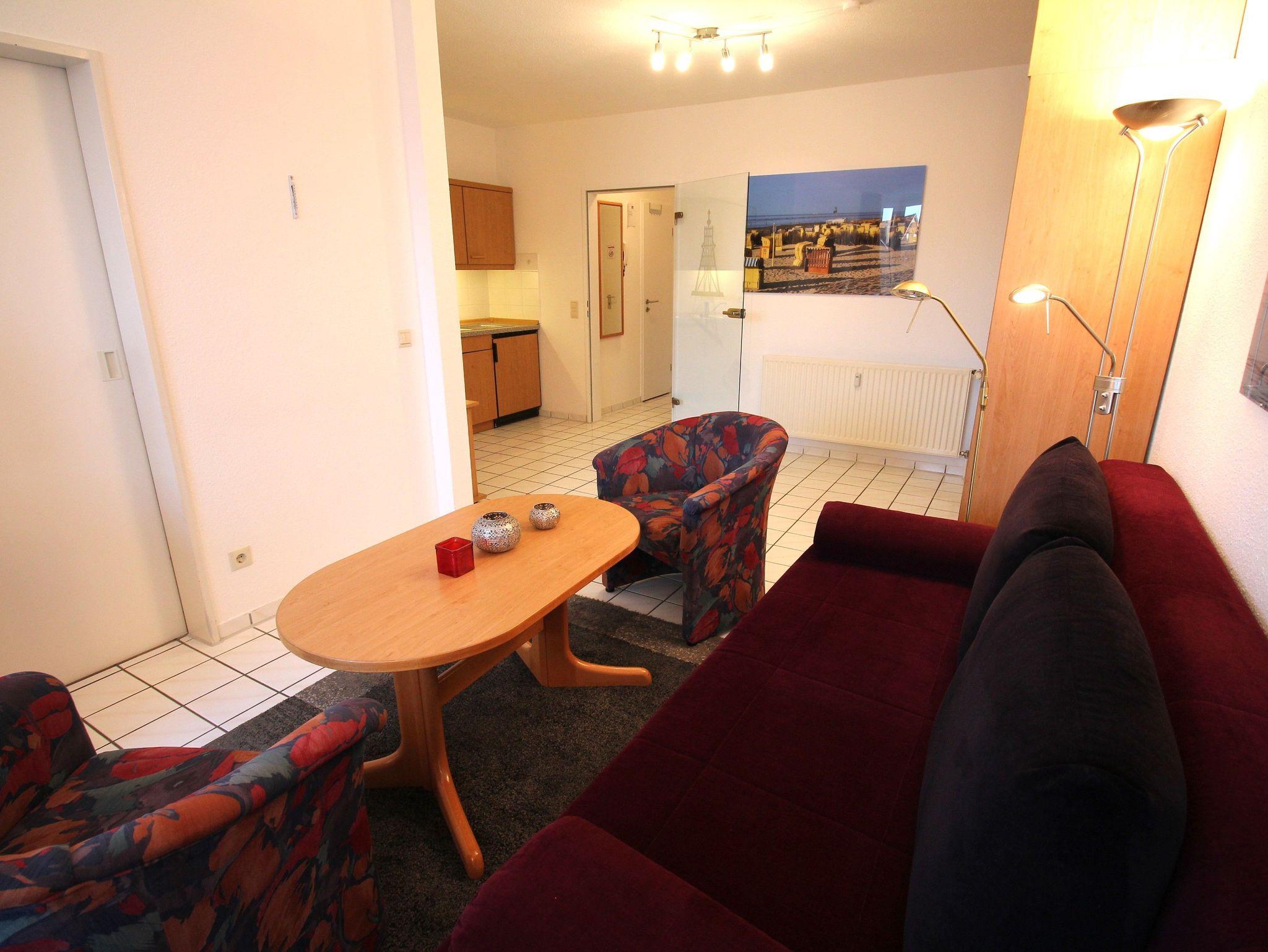 Sie wohnen in einem 2-Zimmer-Appartement für bis zu 2 Personen, ca. 40 m². EIn Schlafzimmer mit zwei Einzelbetten. Ein Bett hat eine Länge von 180 cm. Der Wohnraum ist mit einer bequemen Schlafcouch ausgestattet, separater Essplatz, voll ausgestatteter Küchenbereich, Diele mit Garderobe, Dusche/WC, Terrasse, SAT-LCD-TV und Telefon.