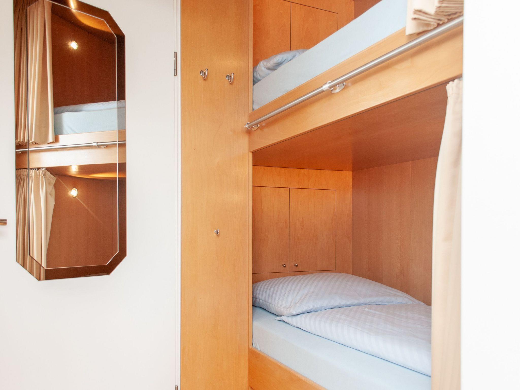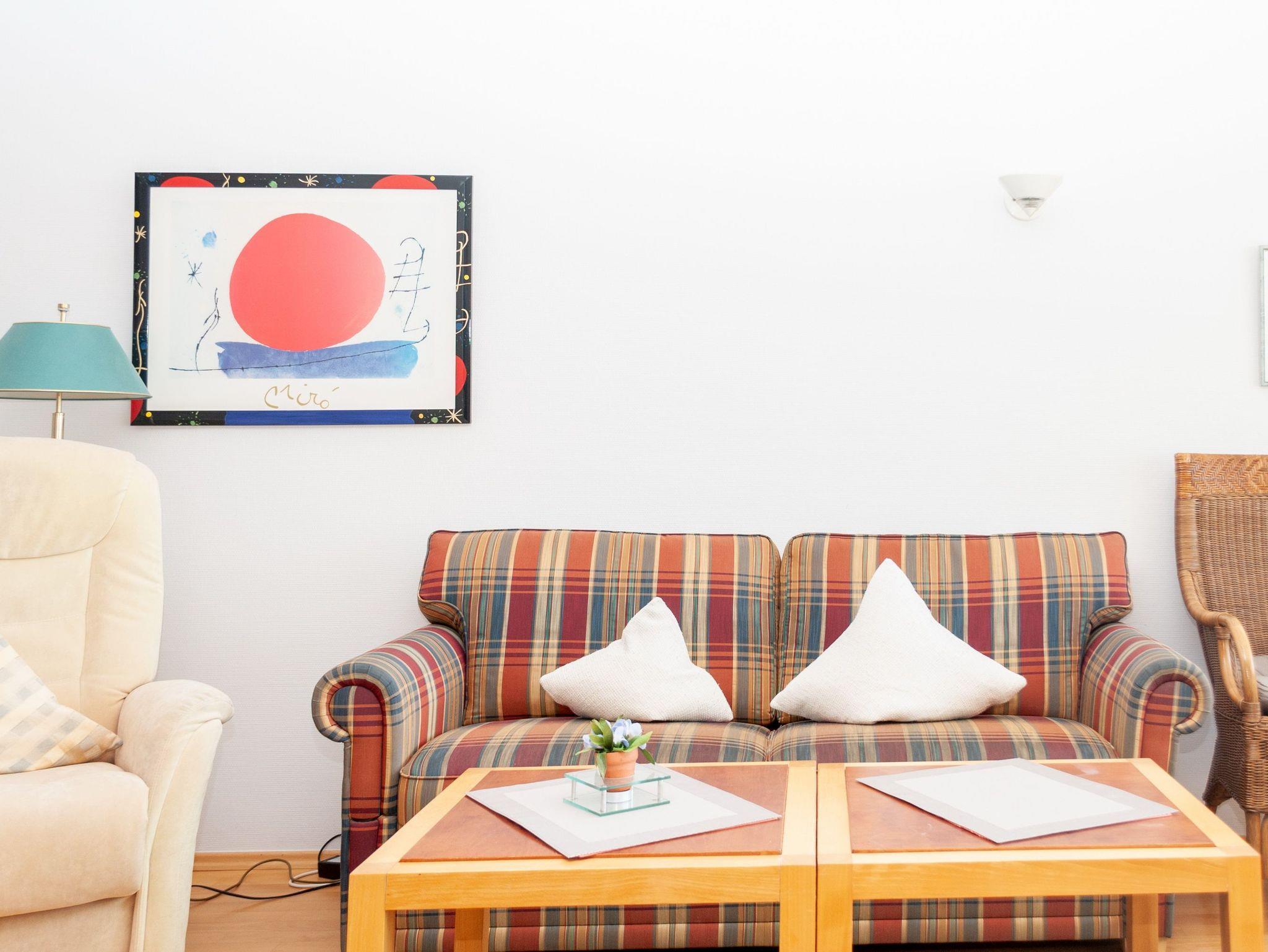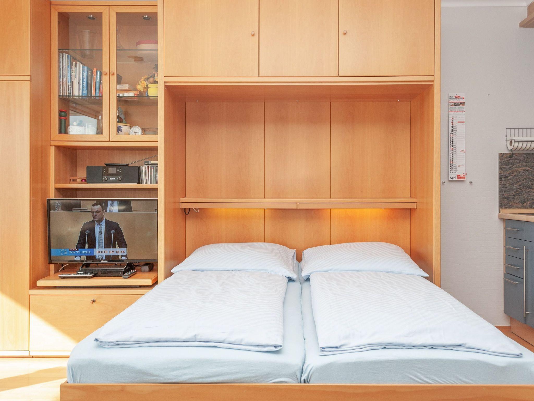 Das Apartment besteht aus einem Wohnbereich mit Schrankbett für 2 Personen ,und einem zusätzlichem Etagenbett in einer Nische im Flur Badezimmer mit Dusche sowie WC. Die Ferienwohnung beinhaltet eine voll ausgestattete offene Küche.