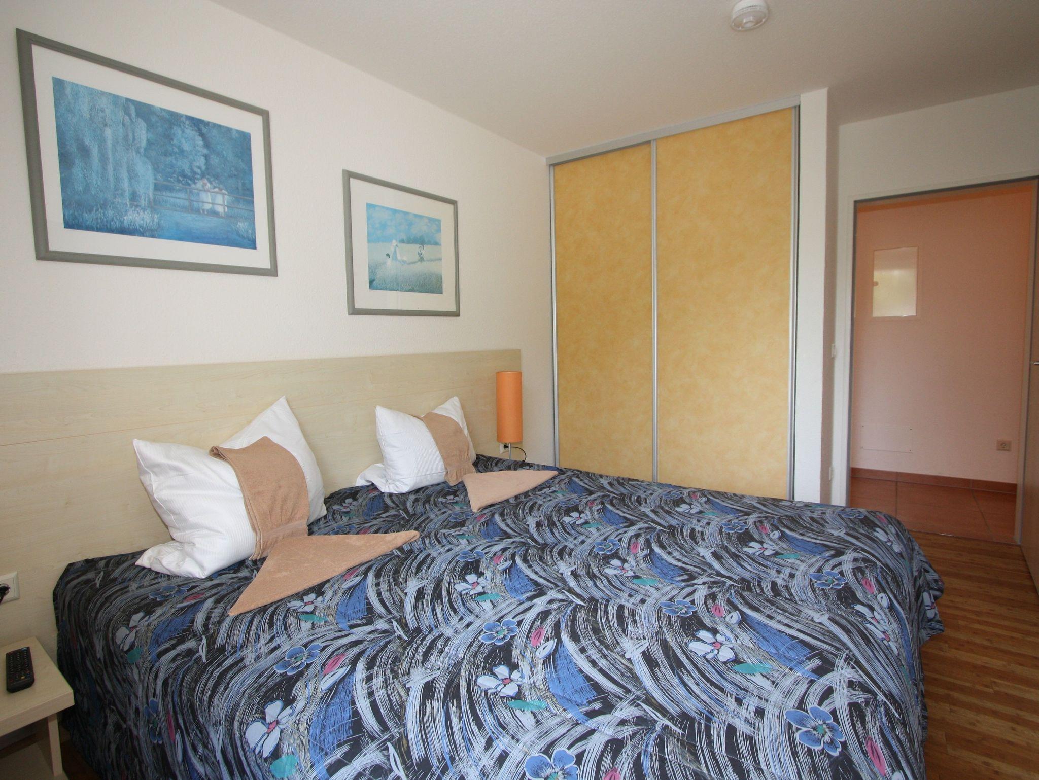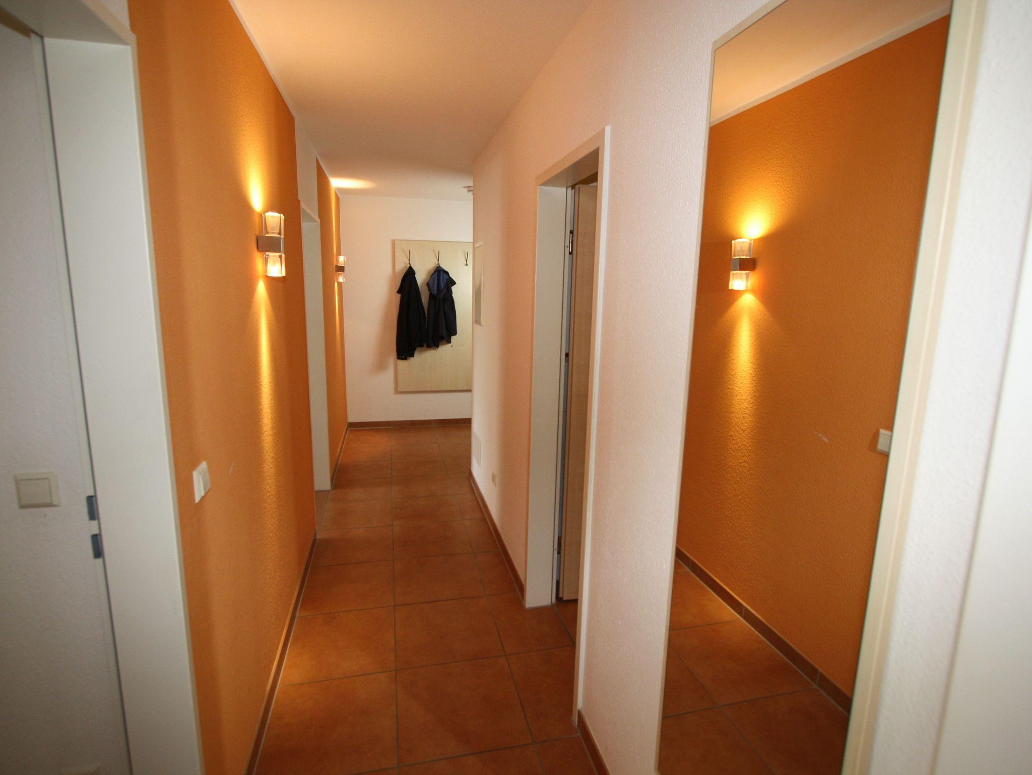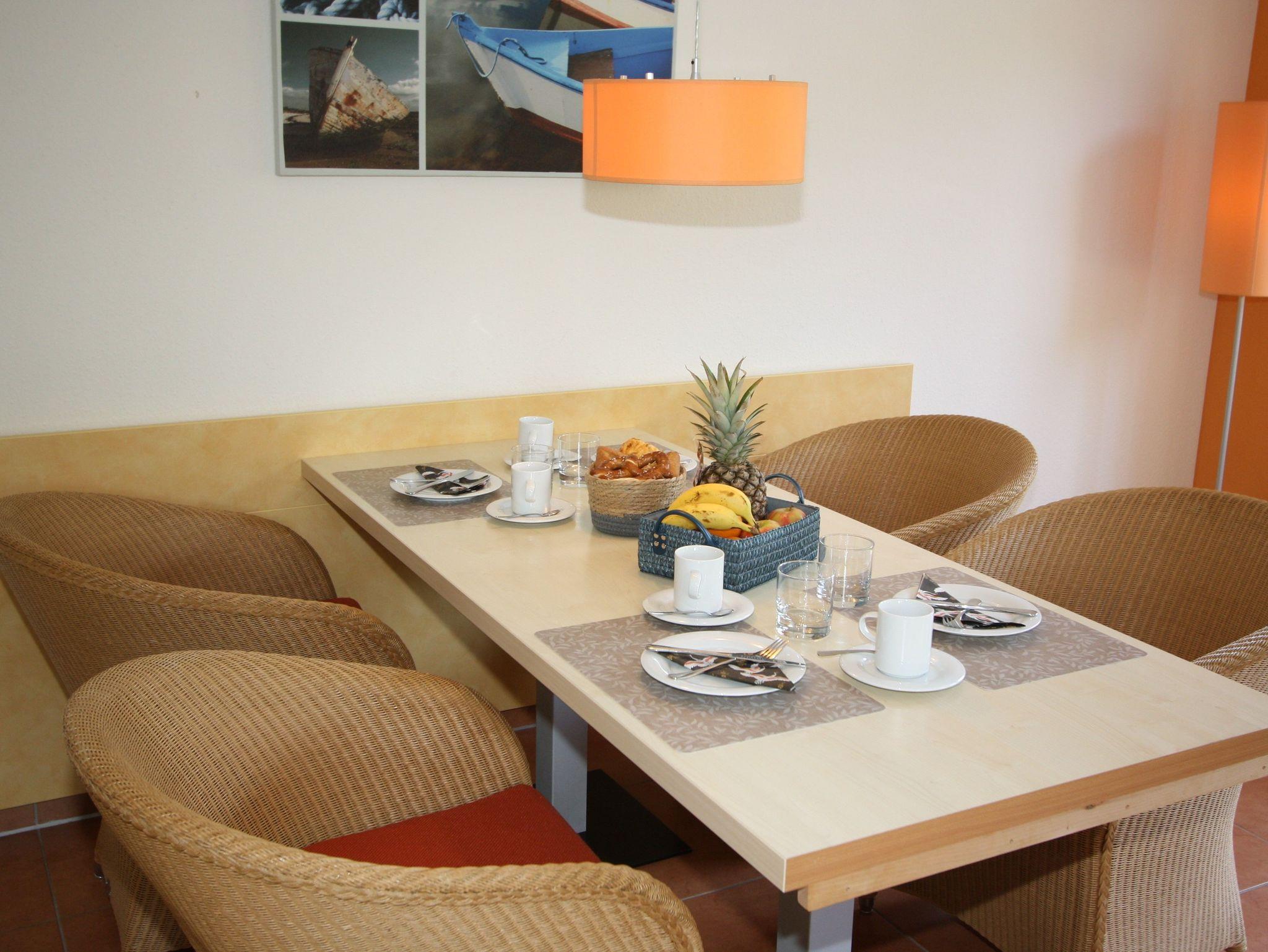Sie wohnen in einem 3-Zimmer-Appartement für bis zu 6 Personen auf 75 m² Wohnfläche im 1. Obergeschoss. Zwei Schlafzimmer mit Doppelbett, großer heller Wohn-/Schlafraum mit bequemer Doppelbettcouch, separater Essplatz, voll ausgestatteter Küchenbereich mit Geschirrspüler und Mikrowelle, Dusche/WC, großer möblierter Balkon, Abstellraum, SAT-TV (Flachbildschirm) und Mini-HiFi-Anlage mit DVD-Player.