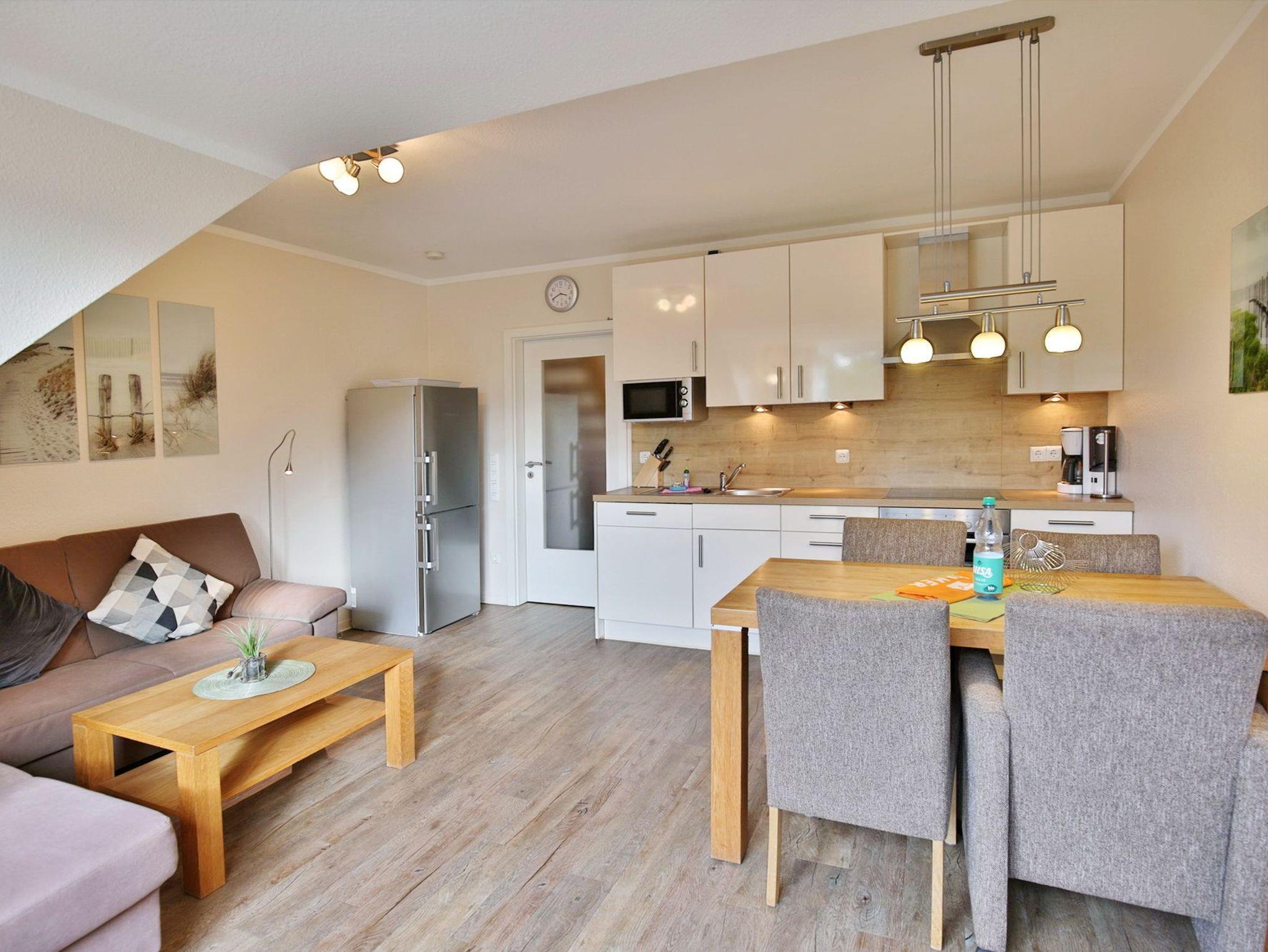 Sehr schöne 3-Raum-Maisonette-Wohnung auf ca. 63m² in der 1.Etage, 1 Schlafzimmer mit Doppelbett und TV, 1 Schlafzimmer im Dachgeschoss mit zwei Einzelbetten u. TV, 2x Du/Wc mit Föhn, Sauna in der Whg. geg.Geb. (Münzer), Wohnzimmer mit großer Küchenzeile (Back., Mikrow., Geschirrspüler) mit SAT-TV, Blue-Ray-DVD, Stereo, kostenloses W-Lan-Internet, großer Balkon (süd) mit Sonnenschirm, Rollläden am Schlafzimmer, Insektenschutz in beiden Schlafzimmern und im Wohnzi.,[nbsp] reservierter Pkw-Stellplatz #7 am Haus, keine Haustiere erlaubt und natürlich Nichtraucher.