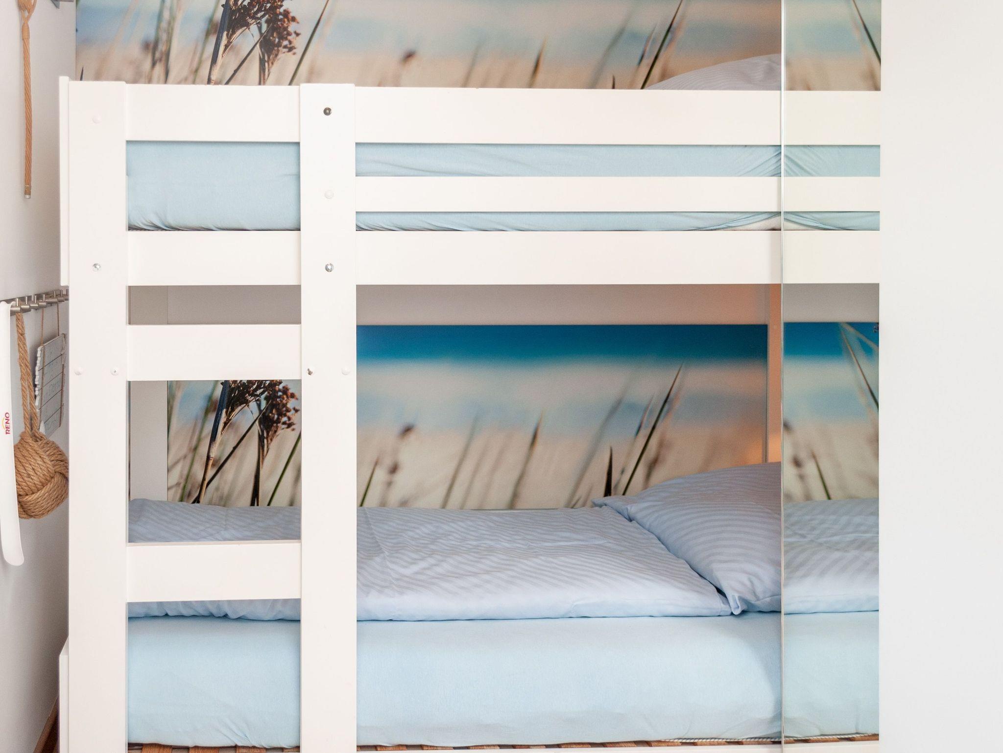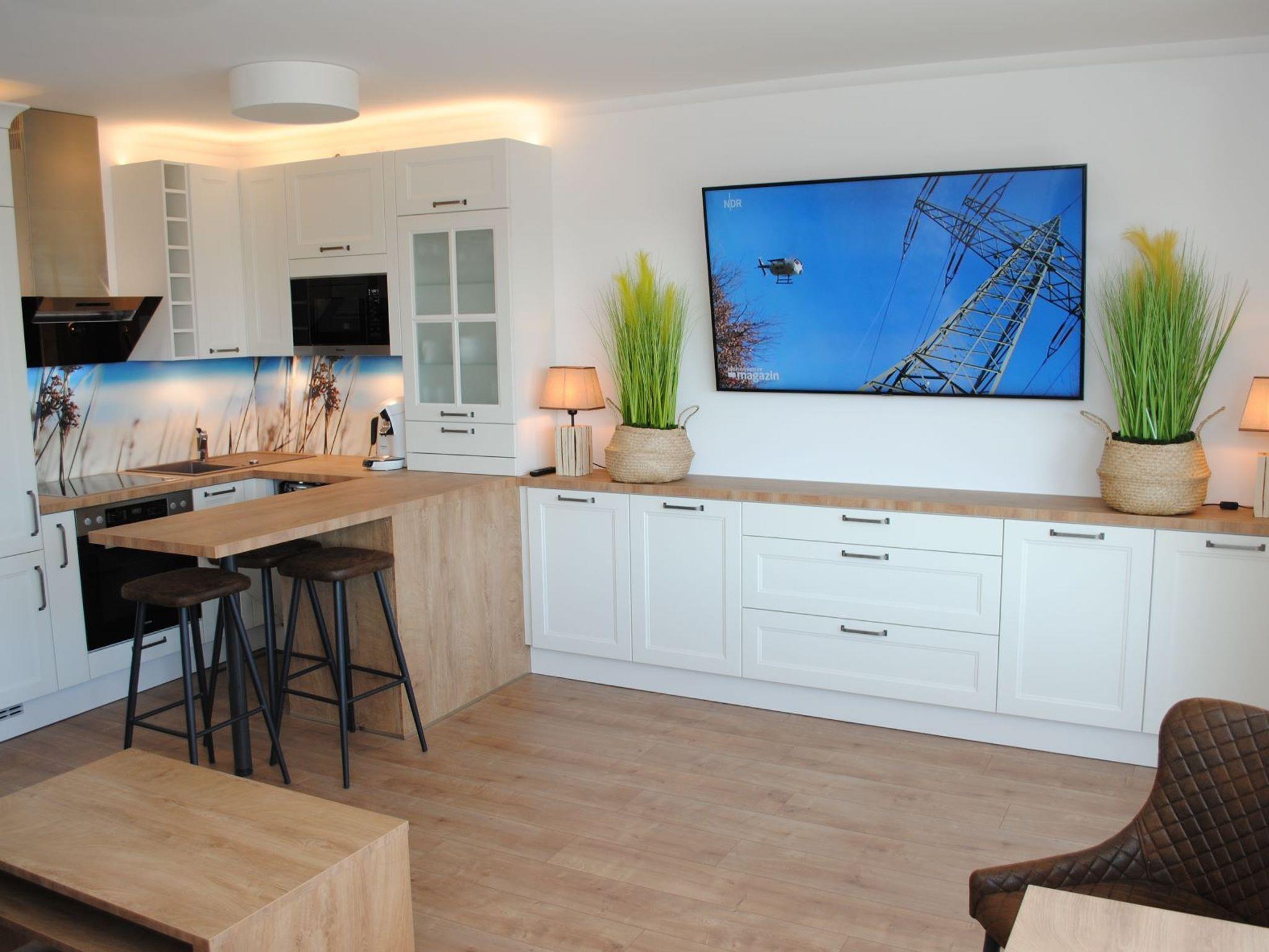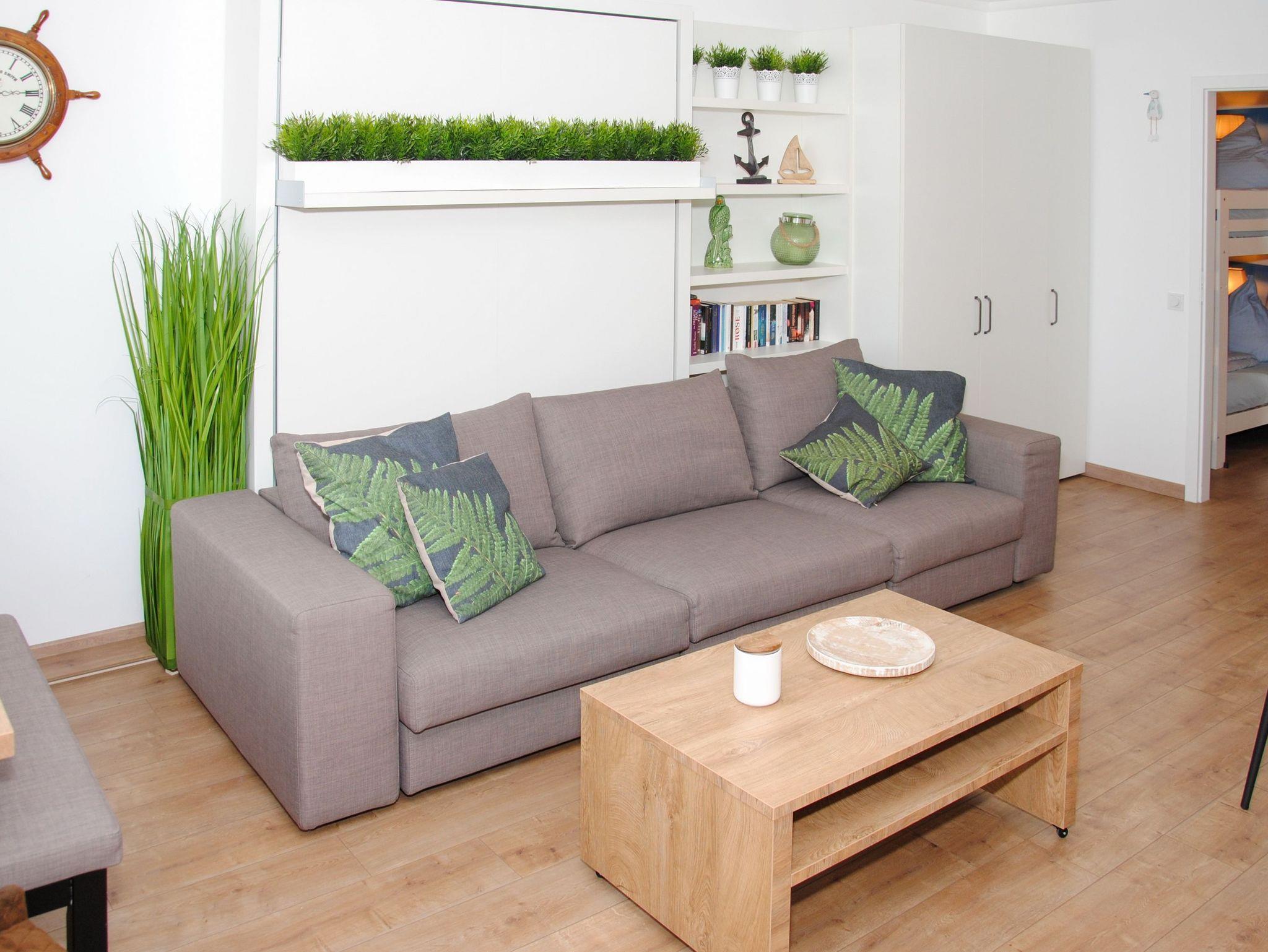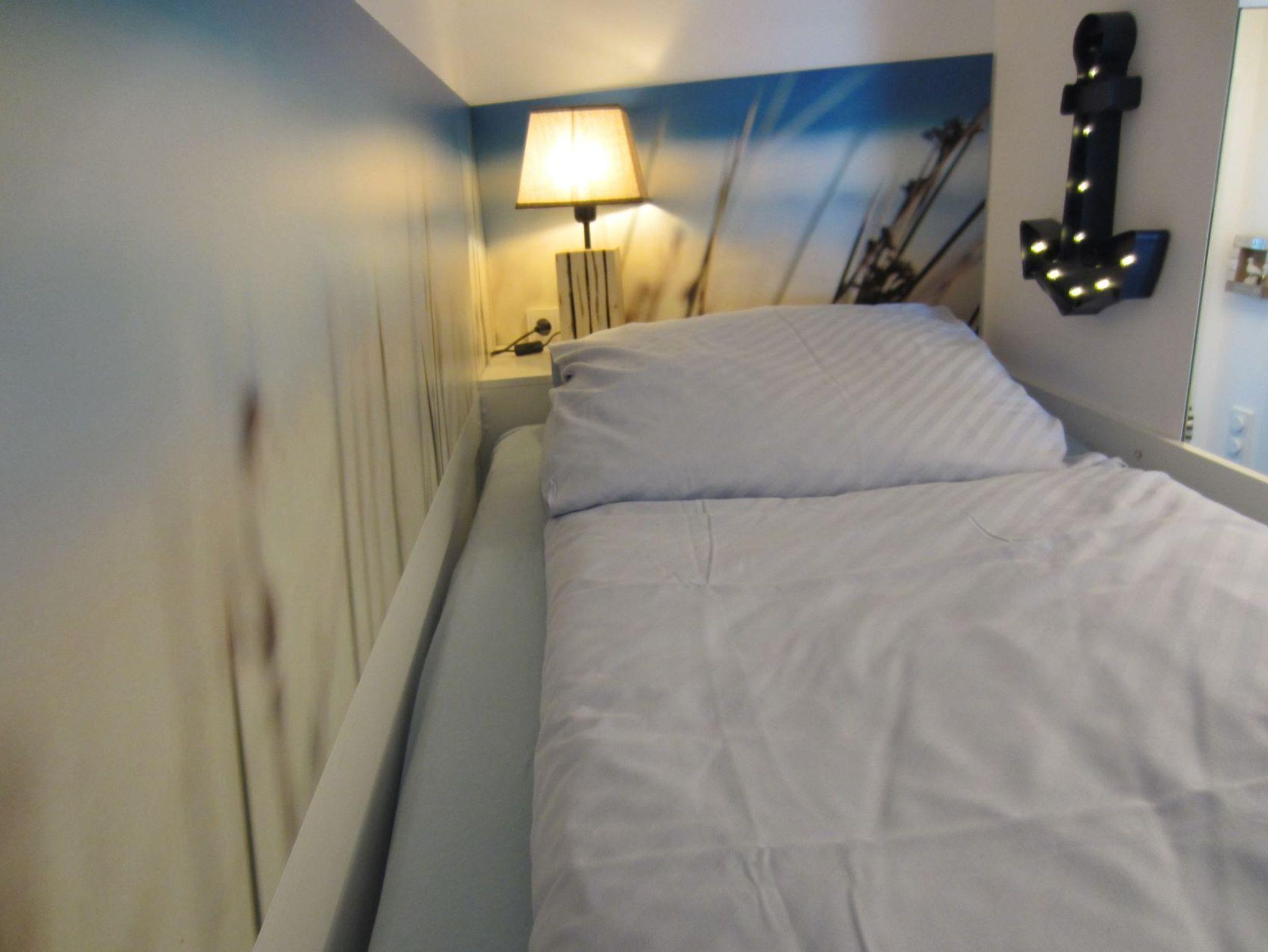 Das Apartment besteht aus Wohnbereich mit Schrankbett für 2 Personen, aus einem zusätzlichem Etagenbett in einer Nische im Flur und einem Badezimmer mit Dusche sowie WC. Die Ferienwohnung beinhaltet eine voll ausgestattete offene Küche.