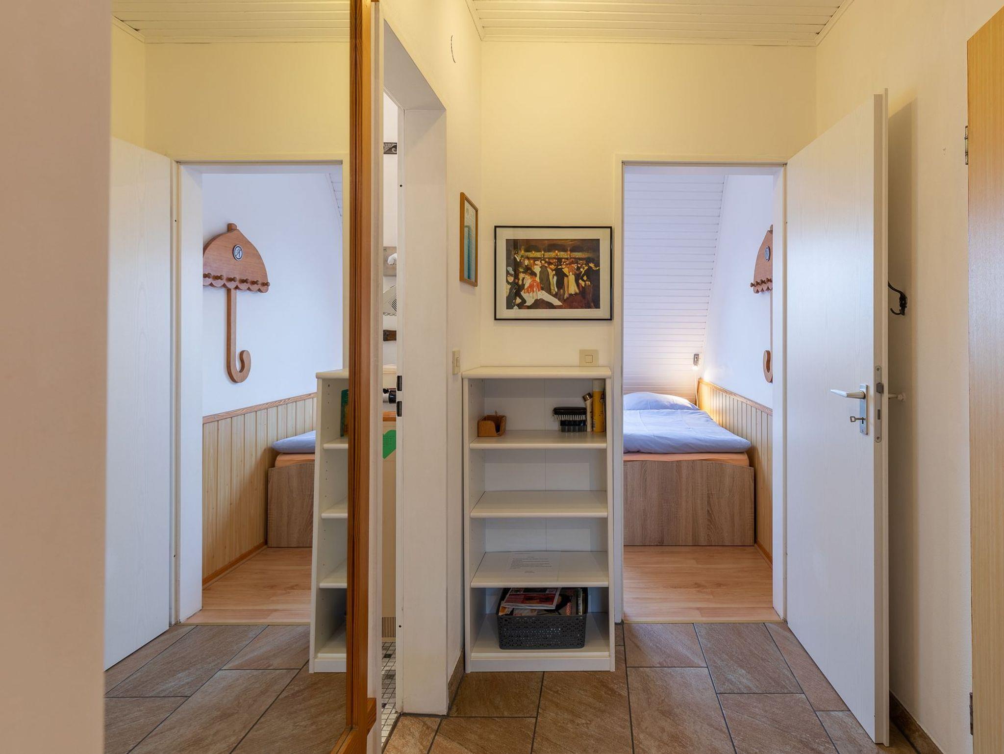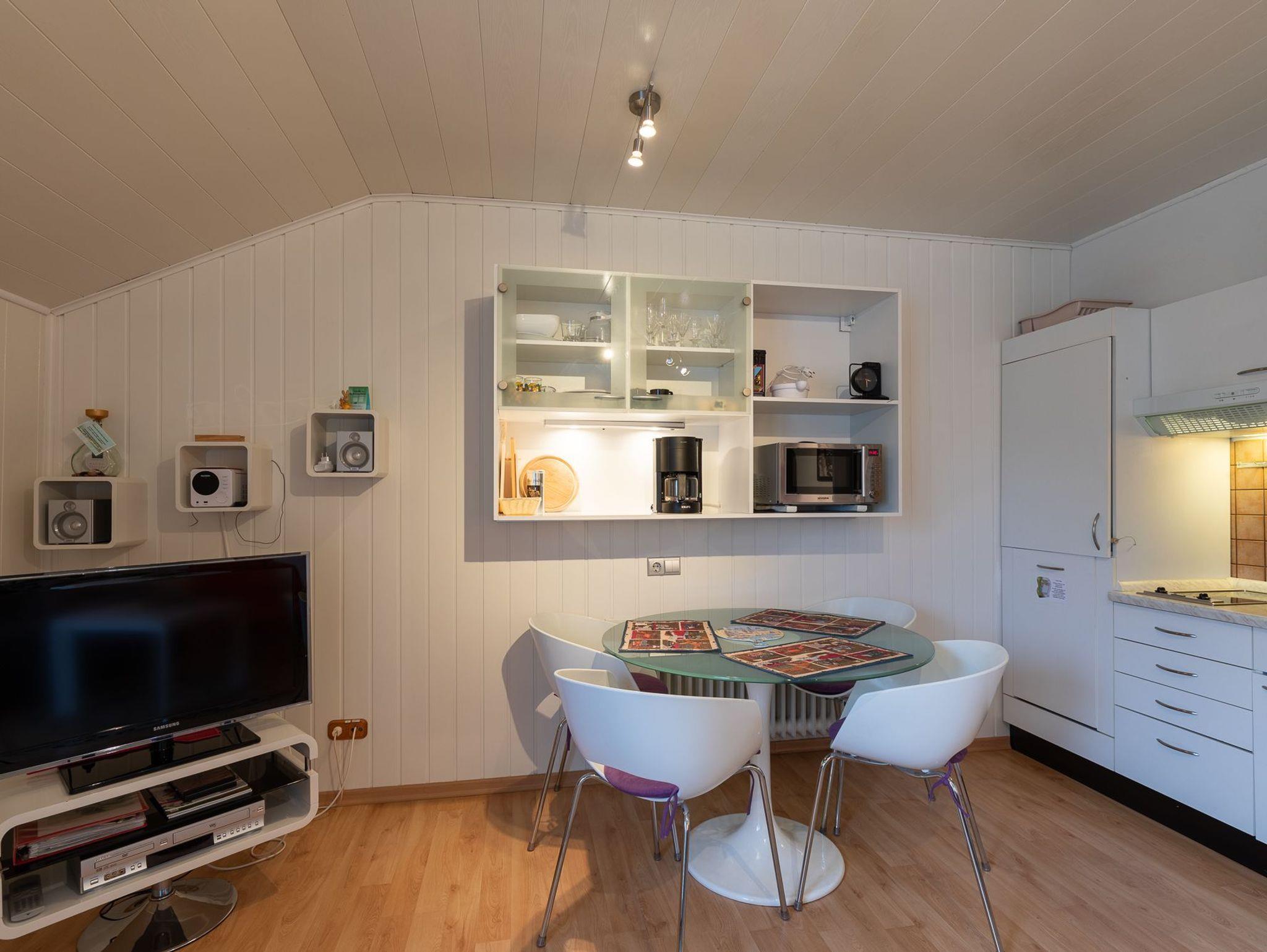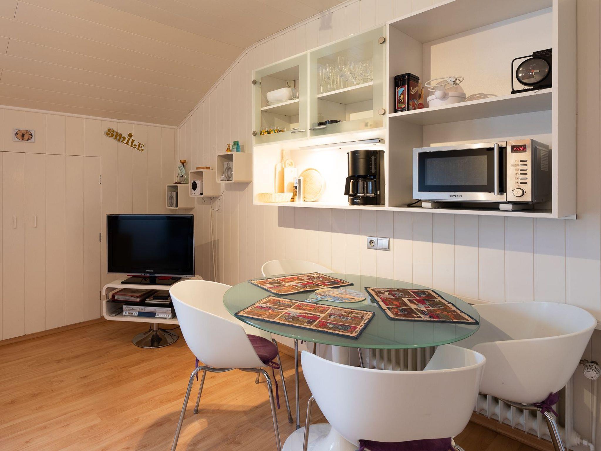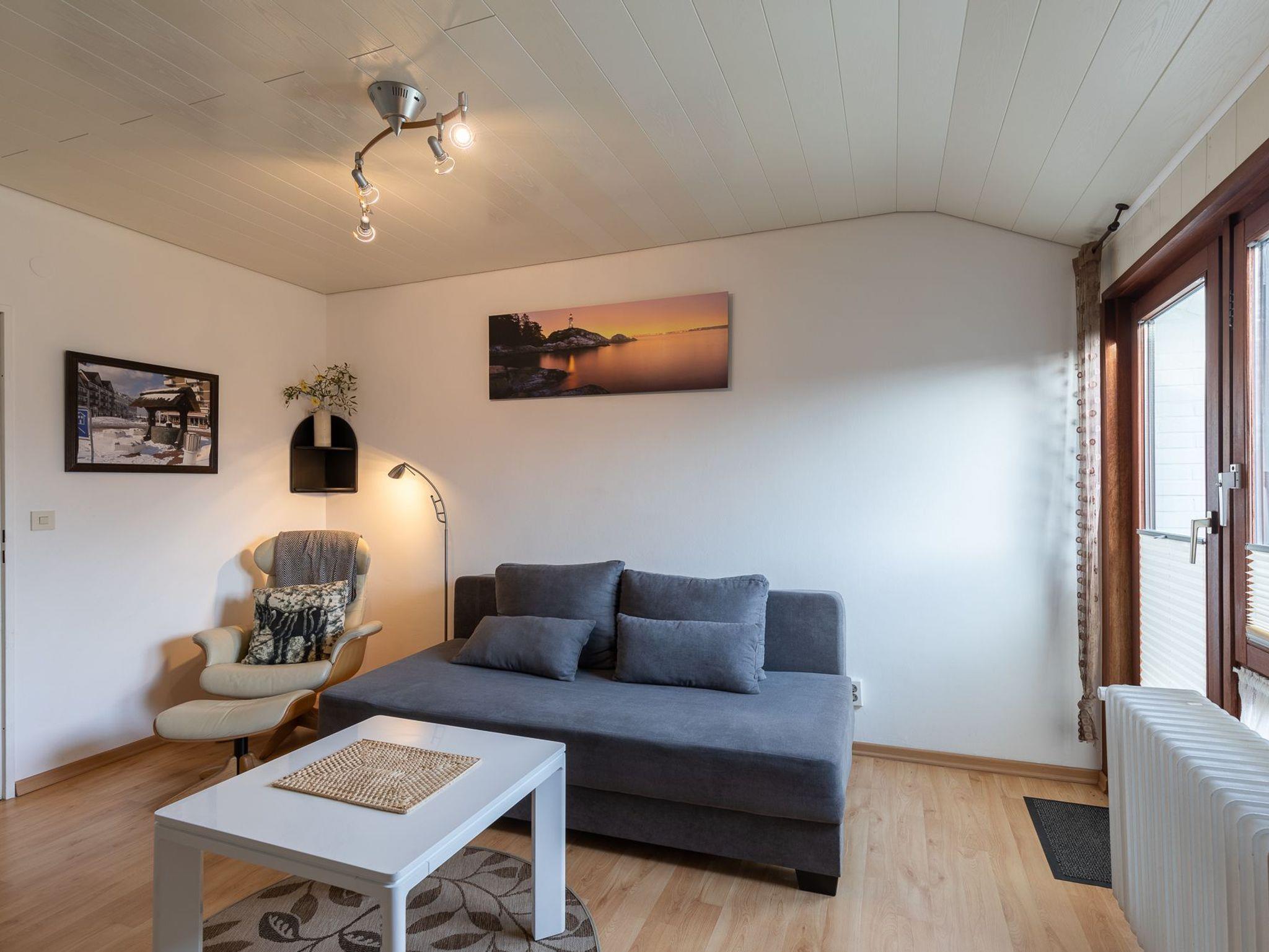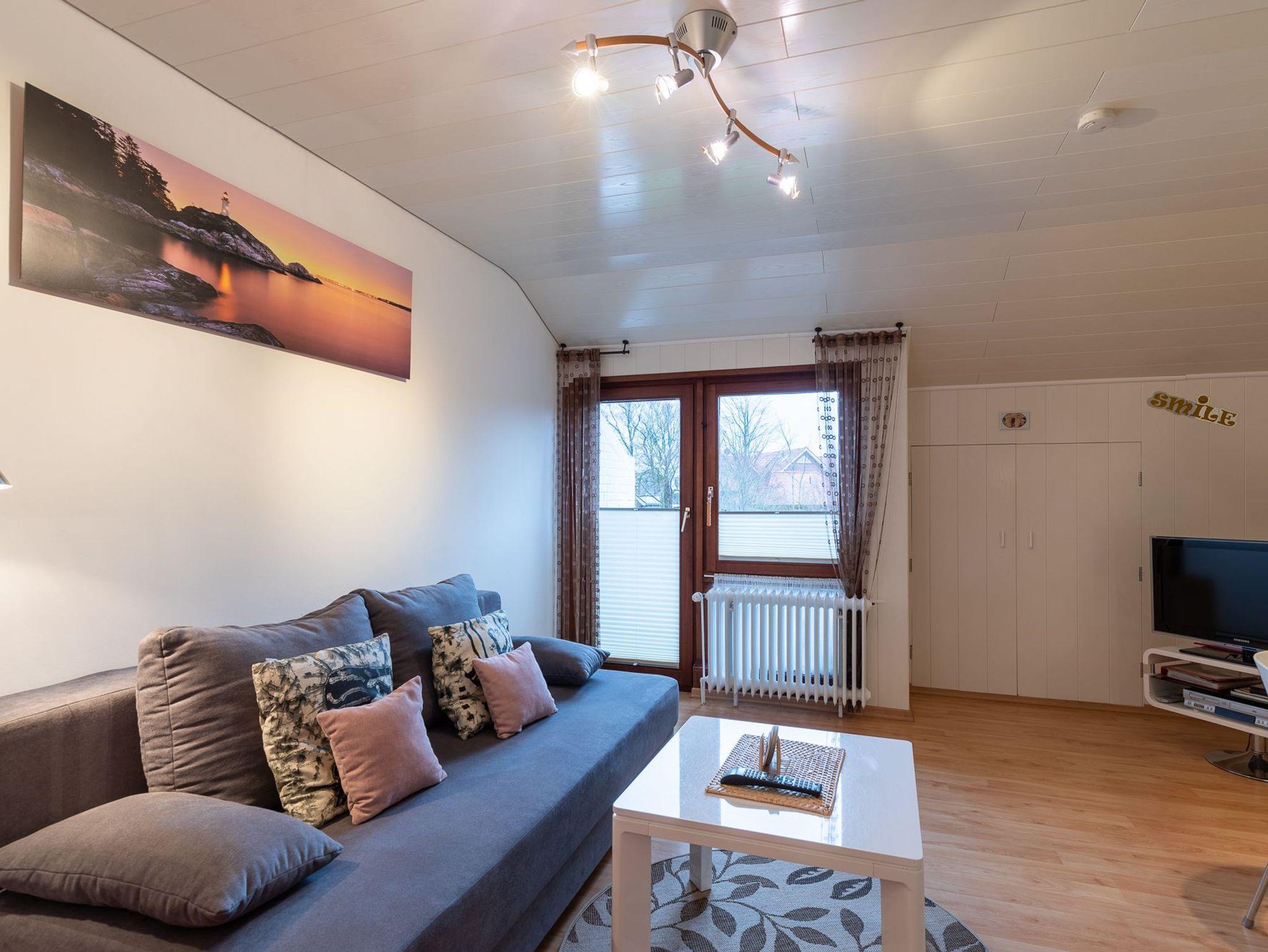 Ein Schlafzimmer mit zwei Einzelbetten + Kommode. Ein Wohnzimmer mit Küchenzeile (Kaffee- und Pad-Maschine, Heißwasser- und Eierkocher, Heißluft/Grill-Mikrowelle, Kühlschrank mit Gefrierfach, Geschirrspülmaschine, 2 Kochplatten), Rundsitz-Essplatz, Lesesessel mit Fußbank, zweitüriger Einbauschrank, Wäscheständer, Staubsauger, Schlaf-Sofa, Sat TV. Balkon mit Sitzmöbel. Bad mit niedriger Duschwanne + Föhn. Gegensprechanlage/Türöffner. Nichtraucherhaus, keine Haustiere, kostenloser PKW-Stellplatz direkt am Haus, Fahrradunterstand hinterm Haus.