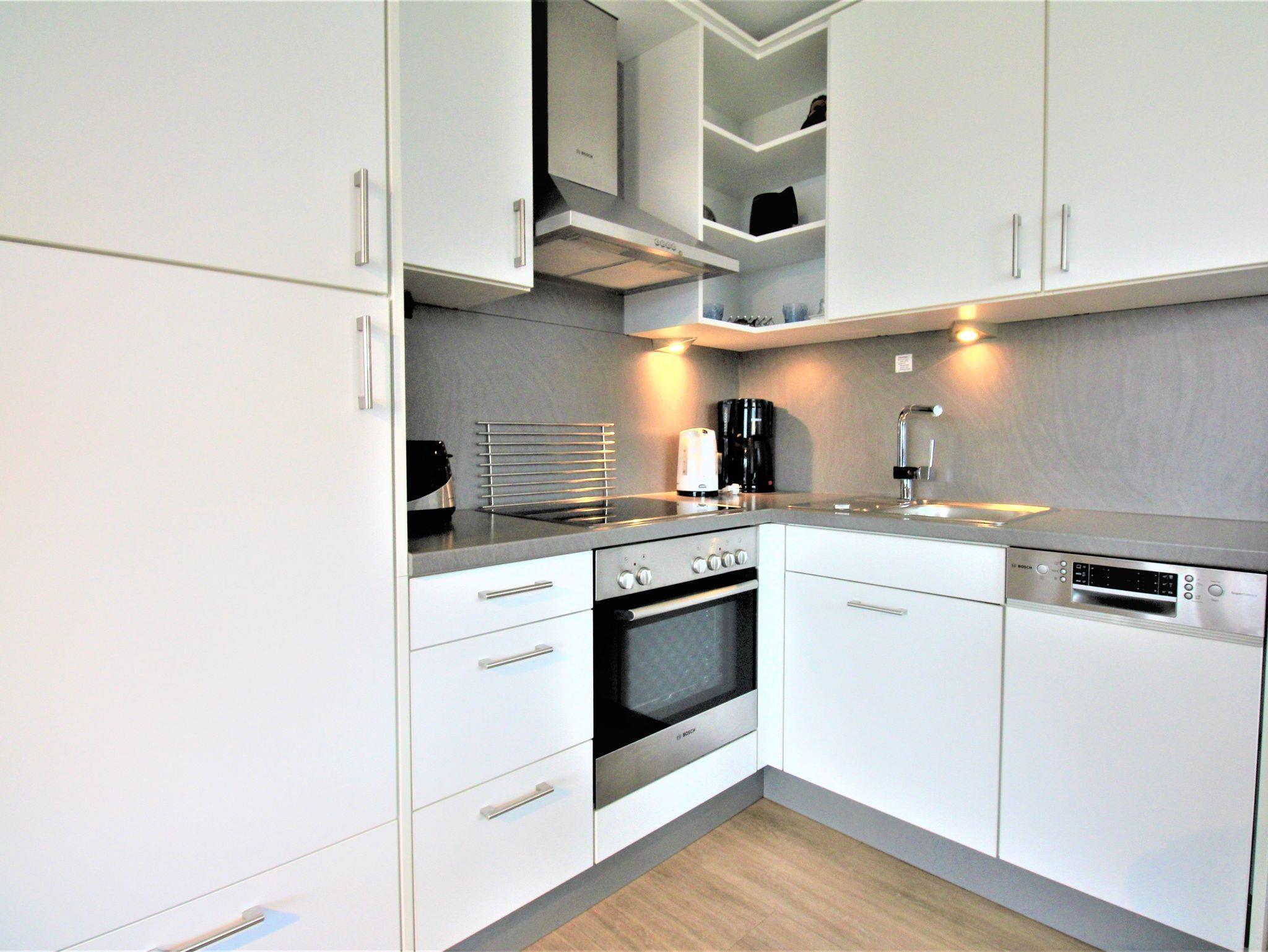 Die Küche in modernem Design ist komplett ausgestattet: Herd mit Cerankochfeld, Dunstesse, Backofen, Mikrowelle, Kühlschrank mit Gefrierfach, Geschirrspüler, Wasserkocher, Toaster, Kaffeemaschine u.v.m.