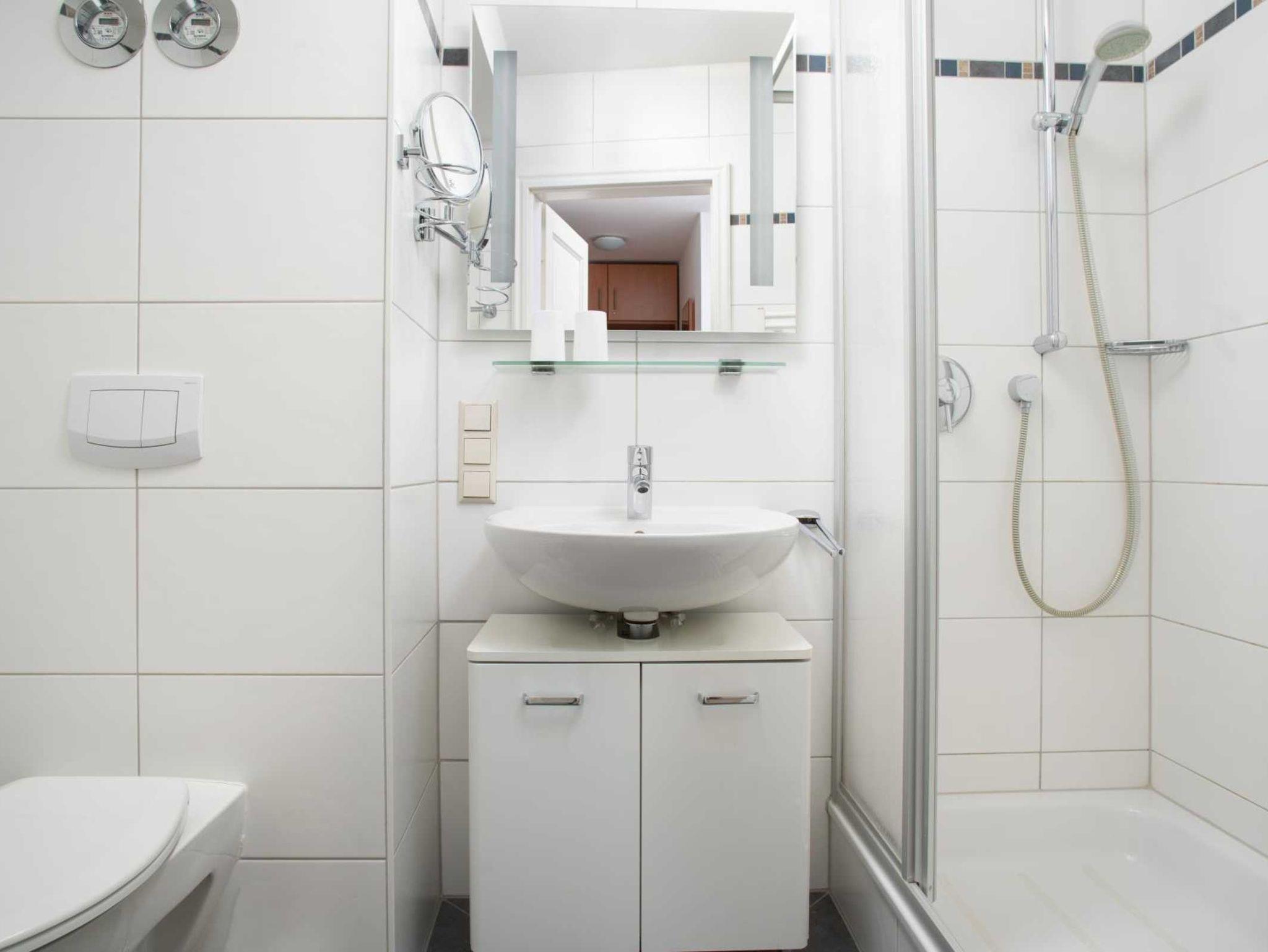 Ein Badezimmer mit Dusche, WC, Kosmetikspiegel, Föhn und Handtuchwärmer. Auf dem Flur befindet sich ein weiterer Kleiderschrank und eine große Garderobe.