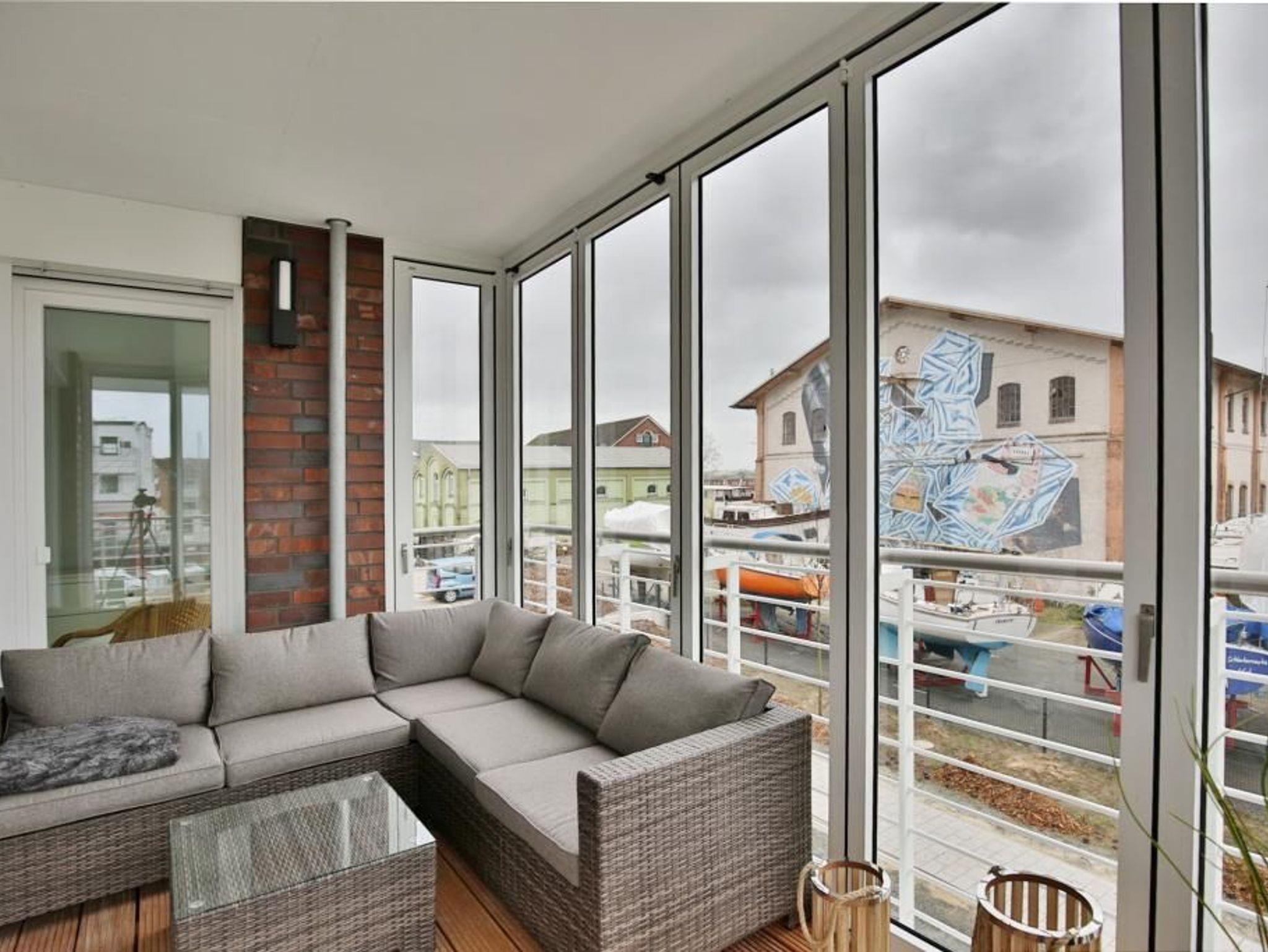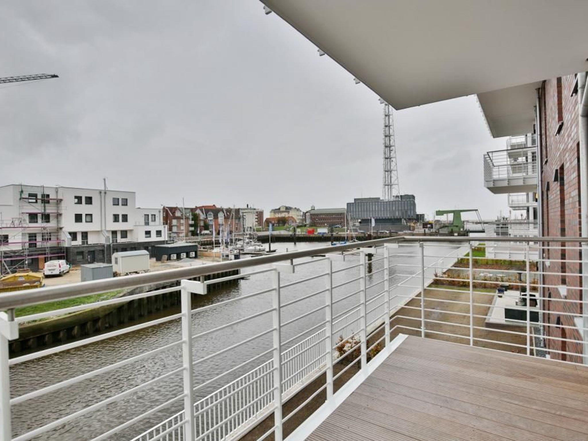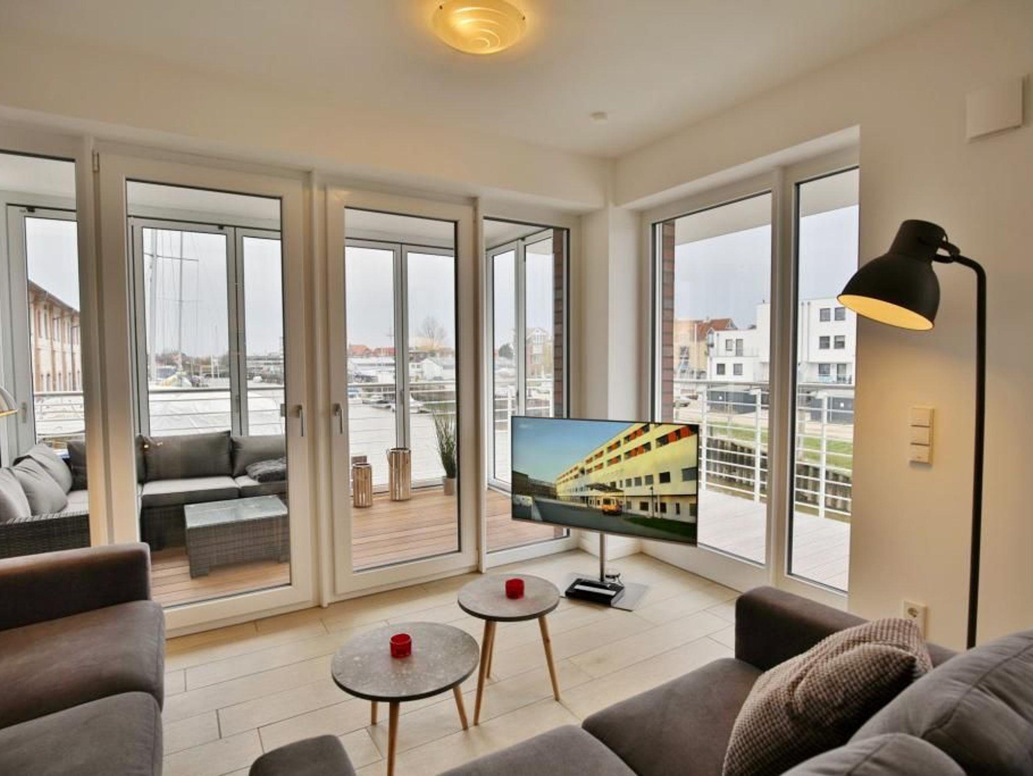Gemütliche 3-Zimmer-Wohnung mit tollem Marina-Blick in Cuxhaven und Balkon mit Lounge-Möbeln.