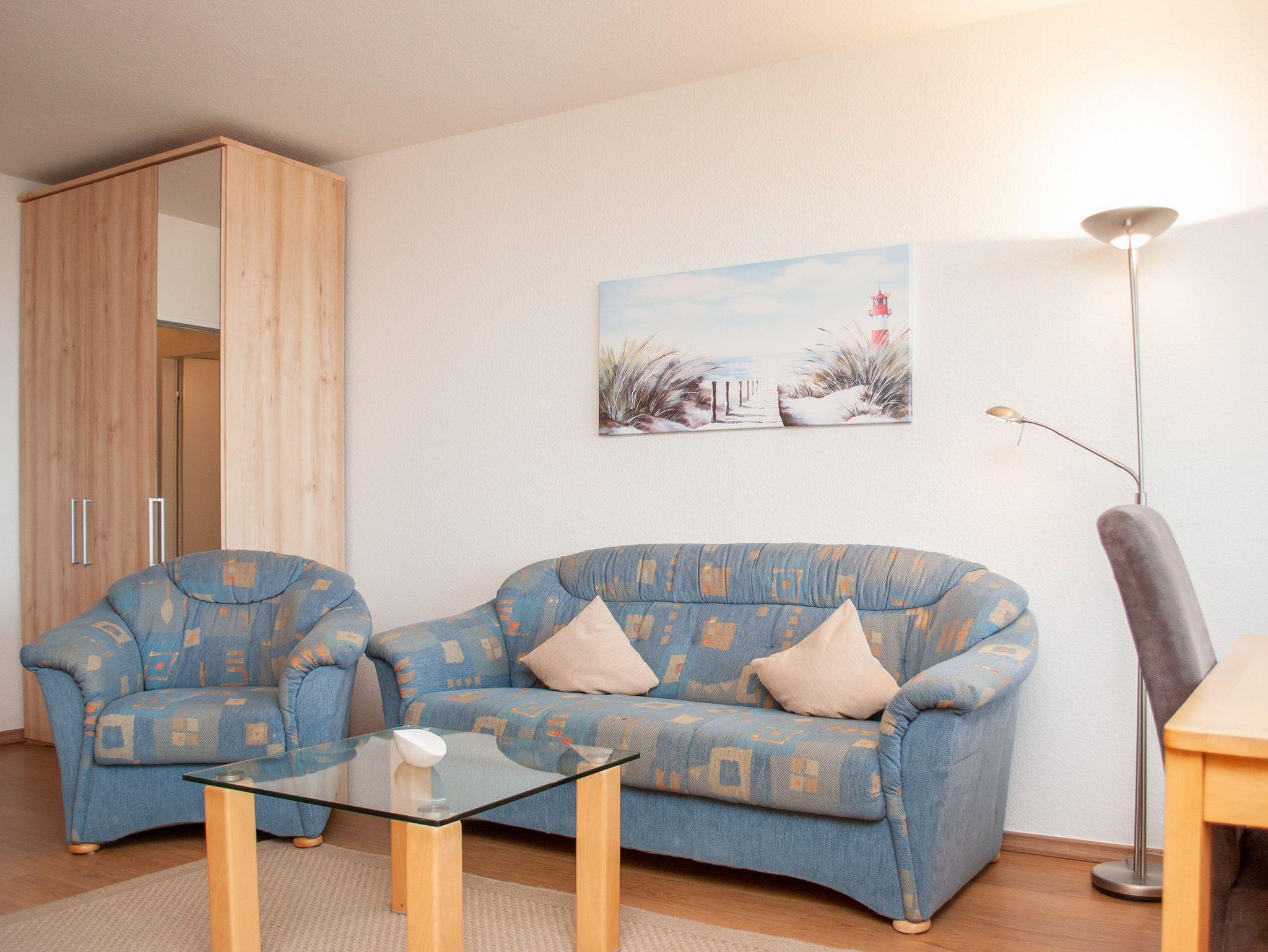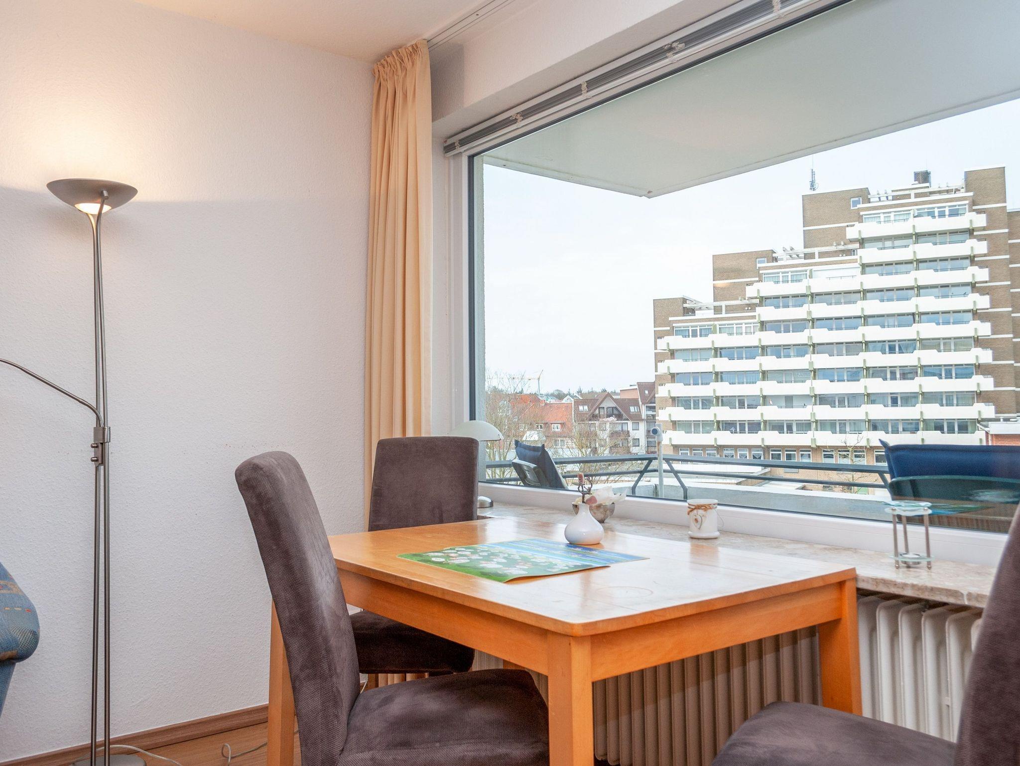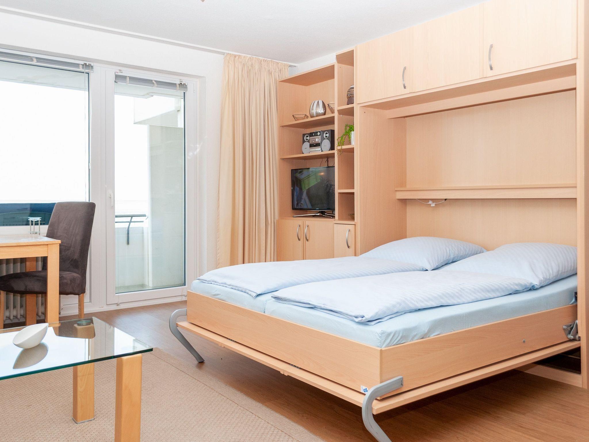 Das Apartment ist ein 1-Raum-Apartment im 4. Obergeschoss für bis zu 4 Personen mit 40 qm. Der Westbalkon mit Meerblick bietet Ihnen vormittags Schatten und nachmittags Sonne .
