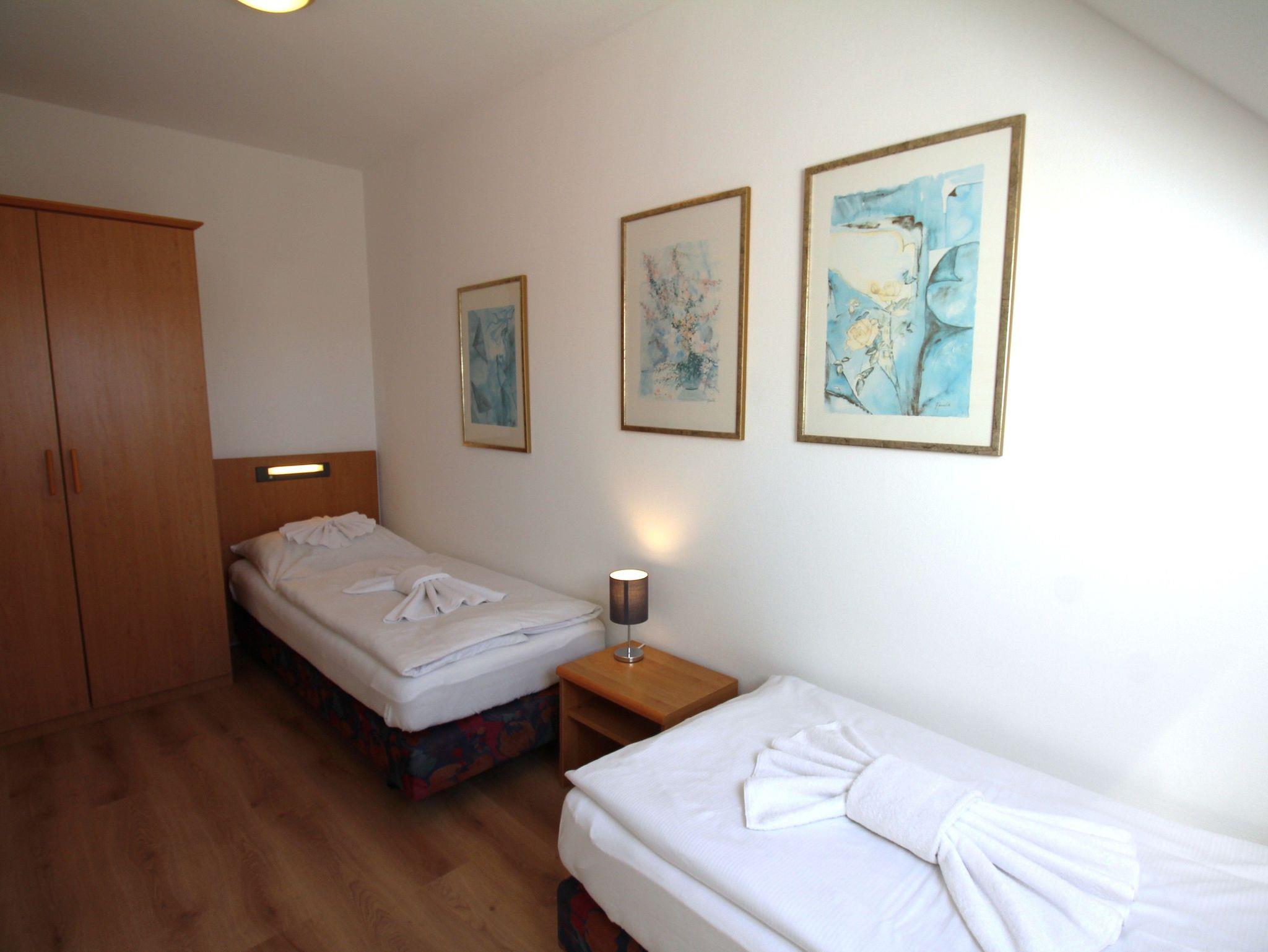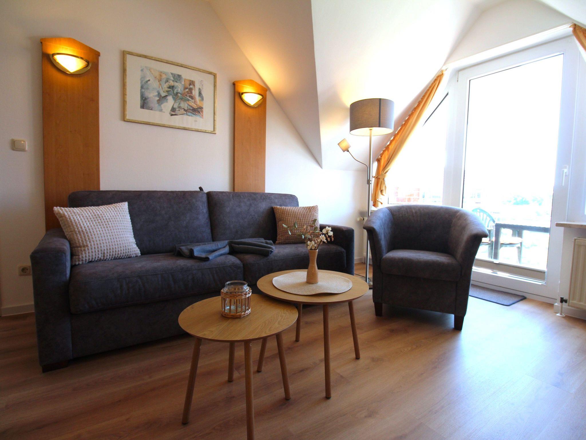Das separate Schlafzimmer bietet zwei Einzelbetten 80 cm x200 cm mit integrierten Leselampen, geräumigem Kleiderschrank und die Schlafcouch im Wohnzimmer bietet außerdem mit 170 cm x 200 cm Liegefläche Platz für eine dritte Person. Die Wohnung verfügt über einen voll ausgestatteten Küchenbereich und ein lichtdurchflutetes Tageslichtbad.