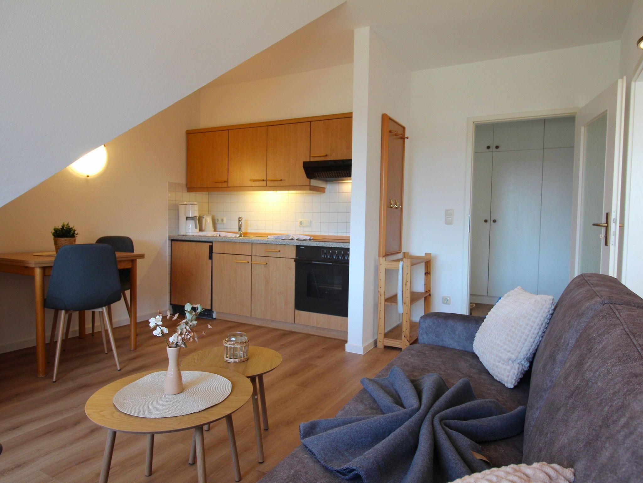 Diese charmant moderne Ferienwohnung bietet Ihnen alles, was Sie für einen entspannten Kurzurlaub benötigen. Durch den offenen Küchen-Wohnbereich lässt sie sich optimal nutzen, trotz der kleinen Größe von 35qm wirkt sie geräumig und luftig.