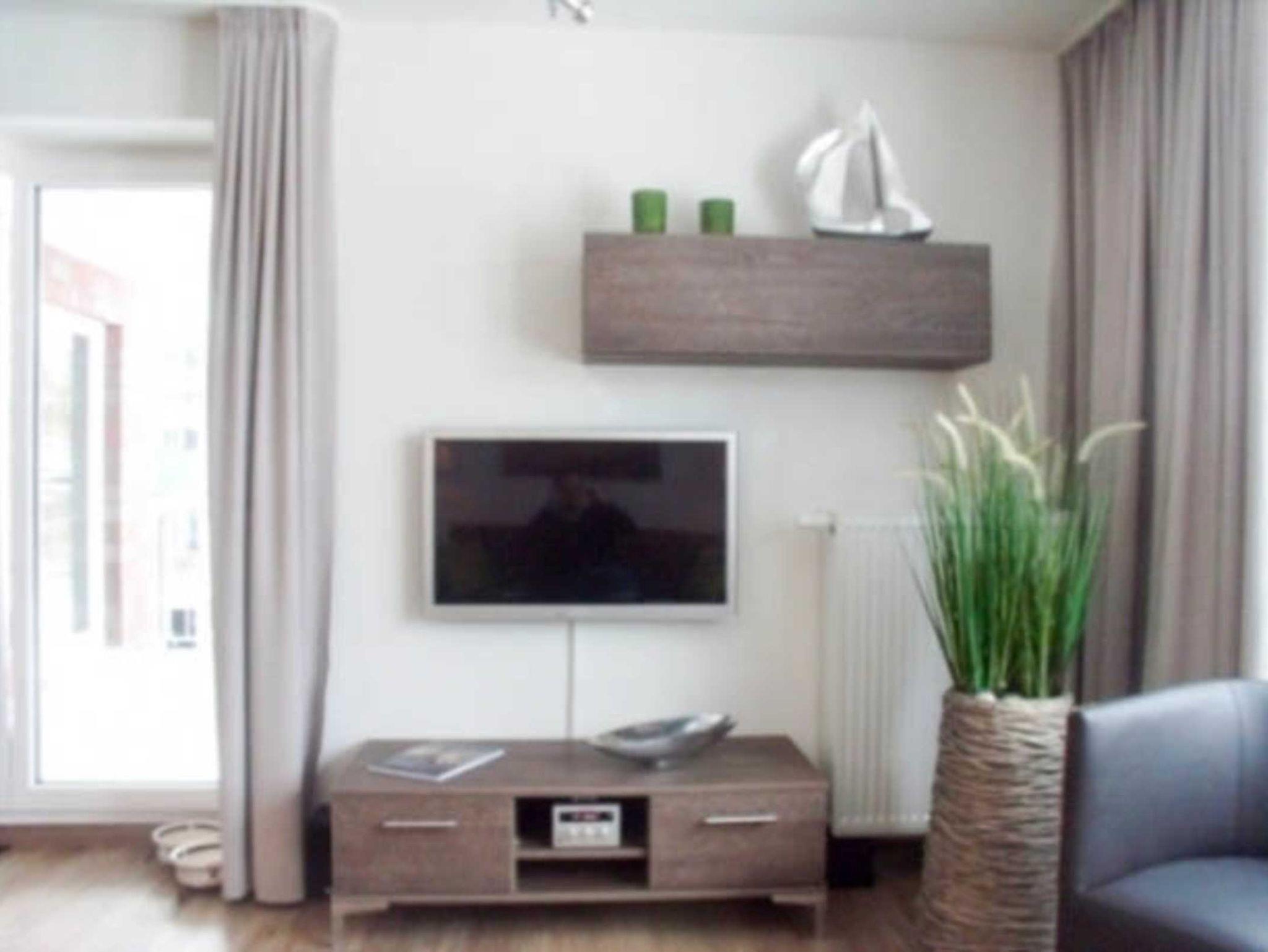 -Wohnzimmer mit LCD-TV, CD/DVD-Hifi-Kombination mit Ipod-Dockingstation, Bücherecke und CDs/DVDs