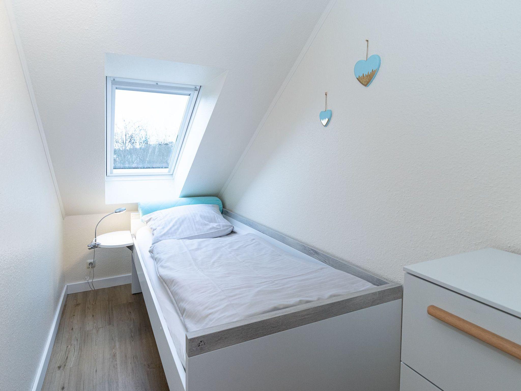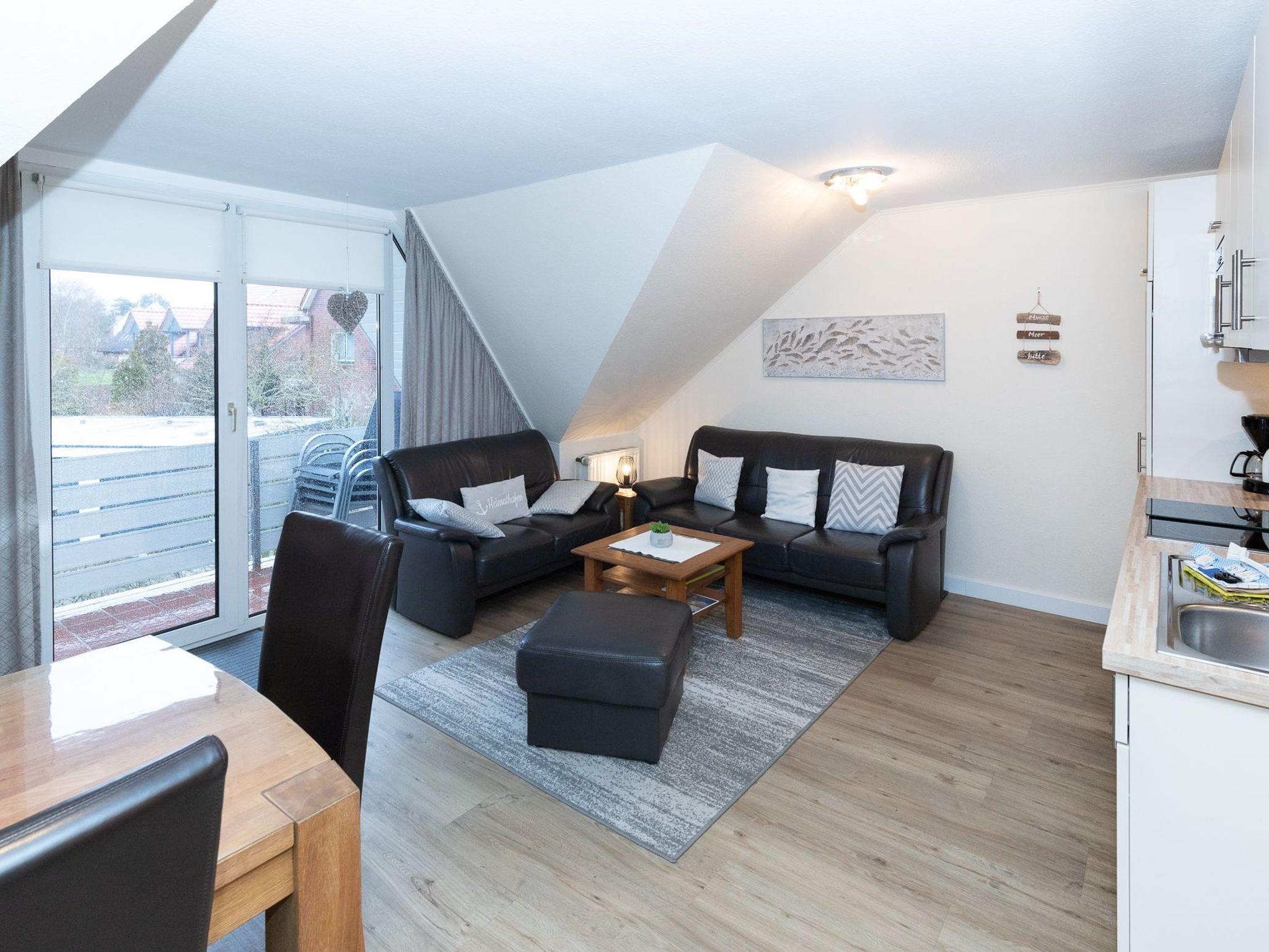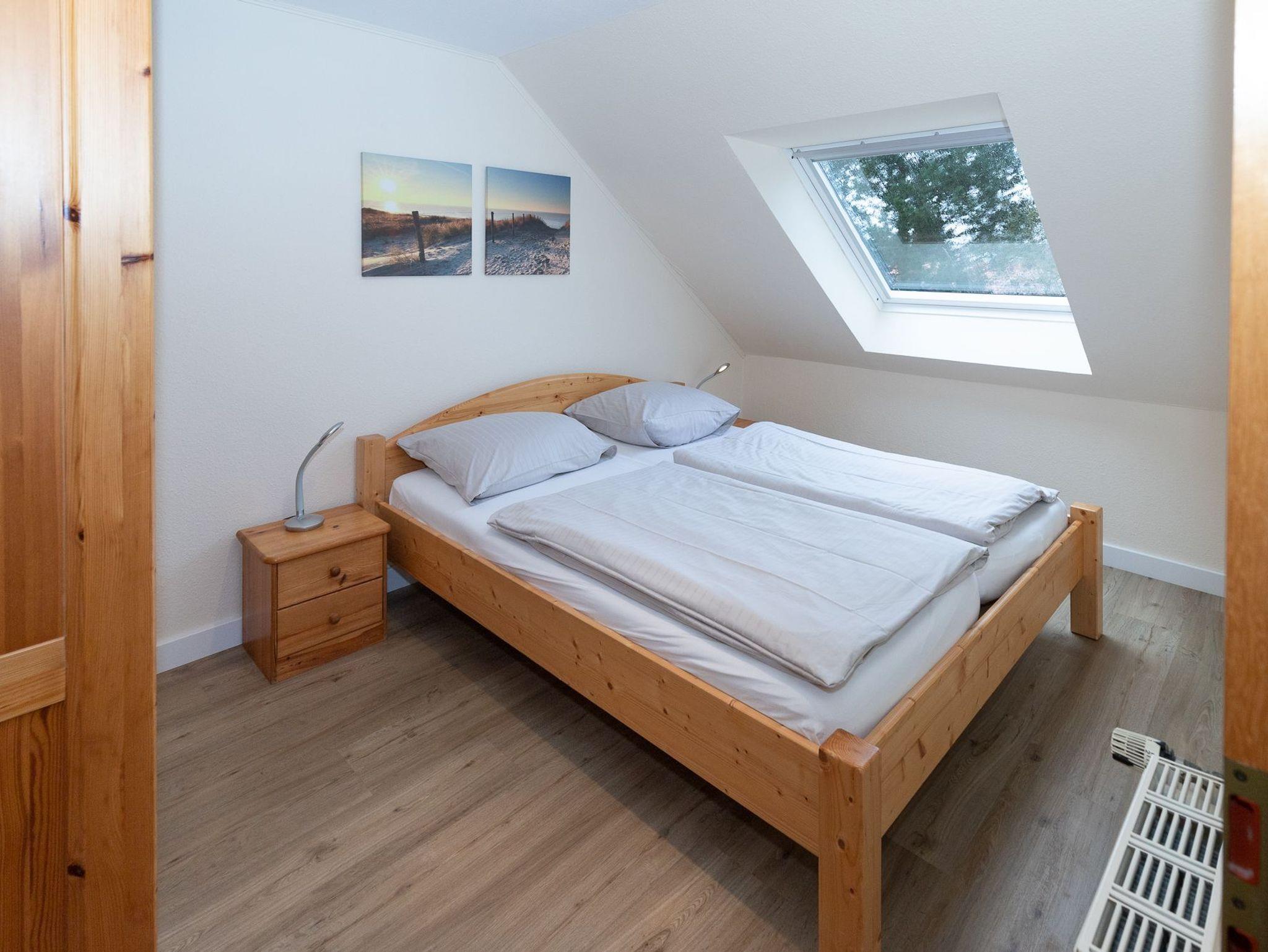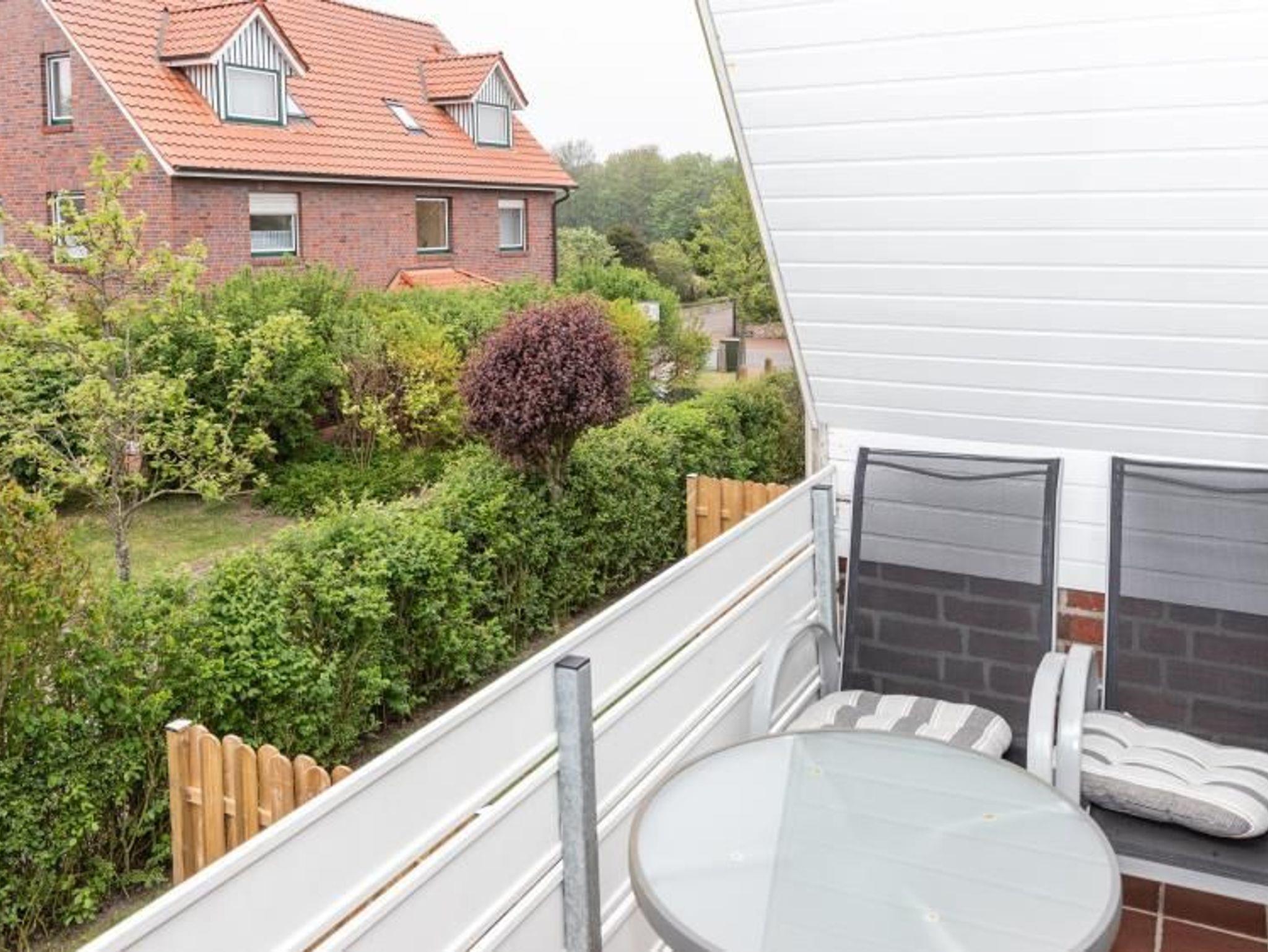 Maike 11b, 4-Raum, ca. 69m², 1. Obrgeschoss und Dachgeschoss, bis zu 5 Personen. Kostenfreier Strandkorb zum wohlfühlen am Duhner Strand. Die gemütlich und modern ausgestattete Ferienwohnung empfängt Sie im 1. Obergeschoss des Hauses und ist aufgeteilt mit einem kleinen Flur, Duschbad (Dusche/WC), Schlafzimmer mit Doppelbett und Kleiderschrank und einem weiteren Schlafbereich mit einem Einzelbett und einer Kommode, dem Wohnbereich mit großem Esstisch und der gut ausgestatteten Einbauküche. Vom Wohnbereich geht es auf den sonnigen Balkon (mit Balkonmöbeln). In dem sehr schönen ausgebauten Dachgeschoss (erreichbar über Treppe mit Sparstufen, für kleinere Kinder nur bedingt geeignet), mit Dielenboden ausgelegt, befindet sich ein weiteres Schlafzimmer mit 2 Einzelbetten und einer Sitzmöglichkeit. In diese Wohnung ist ein Baby-Reisebett leider nur sehr ungünstig zu stellen.