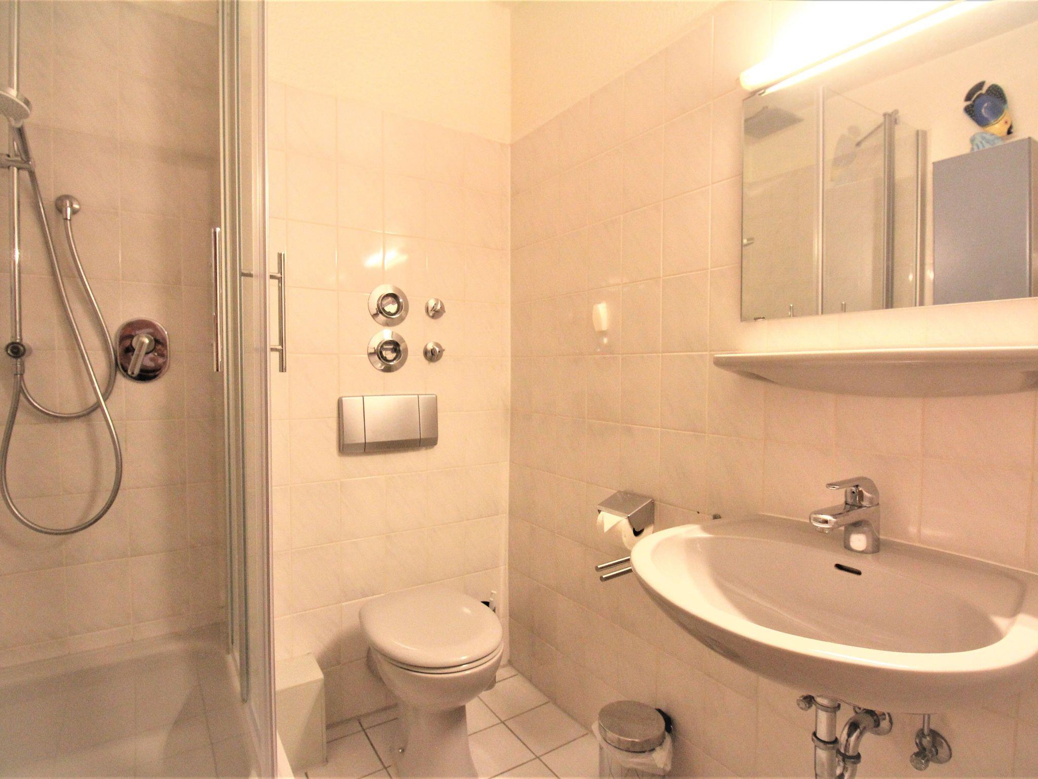 Ein Badezimmer mit Dusche/WC und Föhn gehört ebenfalls zur Wohnung. Das im Keller befindliche Schwimmbad mit Gegenstromanlage und Tageslicht sowie die finnische Sauna können Sie kostenlos nutzen.