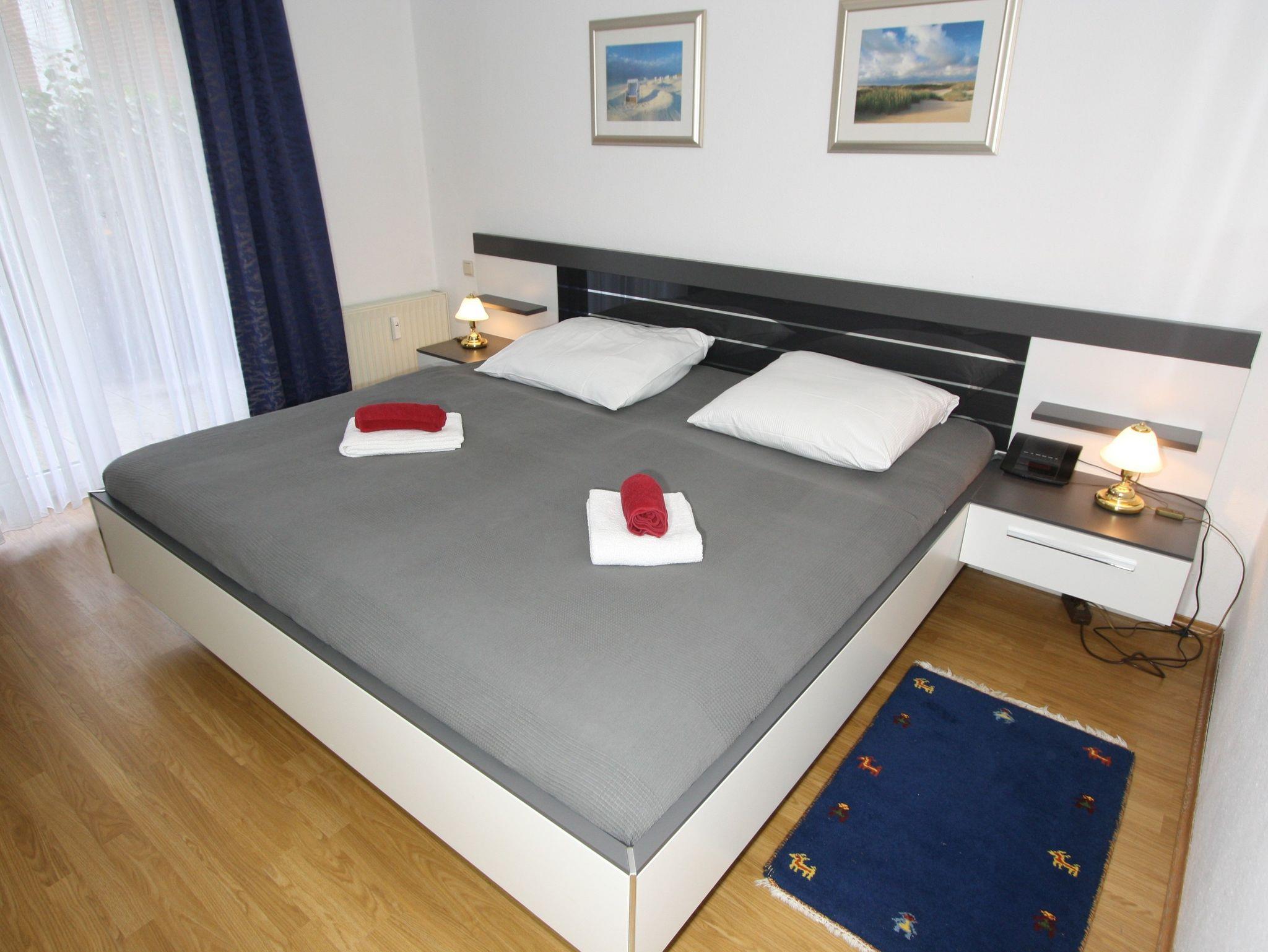 Es erwartet Sie ein separates Schlafzimmer mit Doppelbett (200 cm x 200 cm/Einzelmatratzen). Vom Schlafzimmer aus gelangen Sie auf eine kleine Terrasse auf der Sie Ihr Frühstück oder laue Abende genießen können. Die Terrassentür lässt sich abschließen.