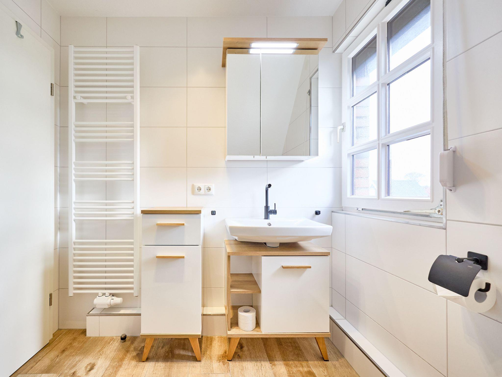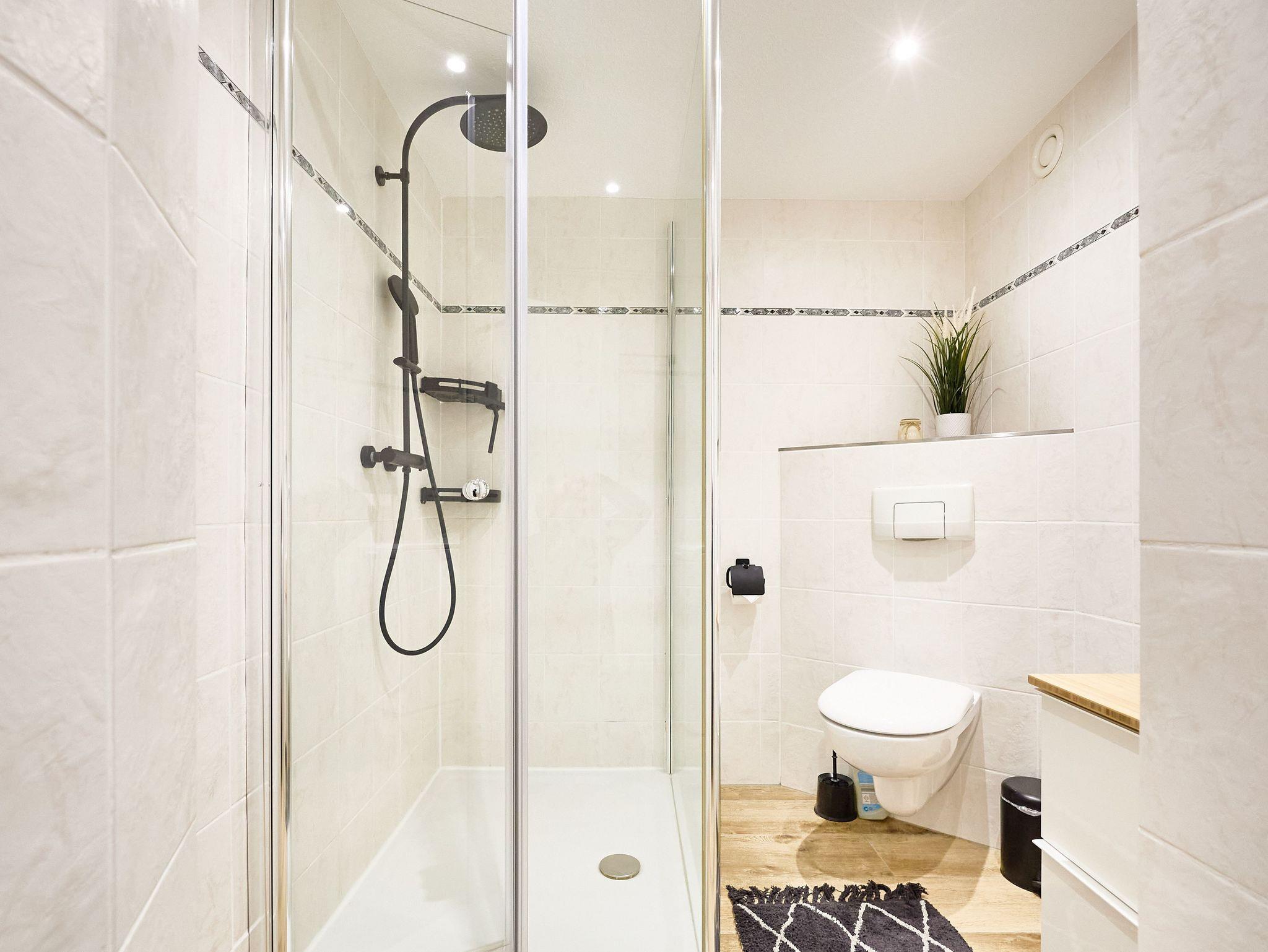 • Modernes Duschbad mit ebenerdiger Dusche, WC, Waschtisch und Waschmaschine und Tageslichtfenster