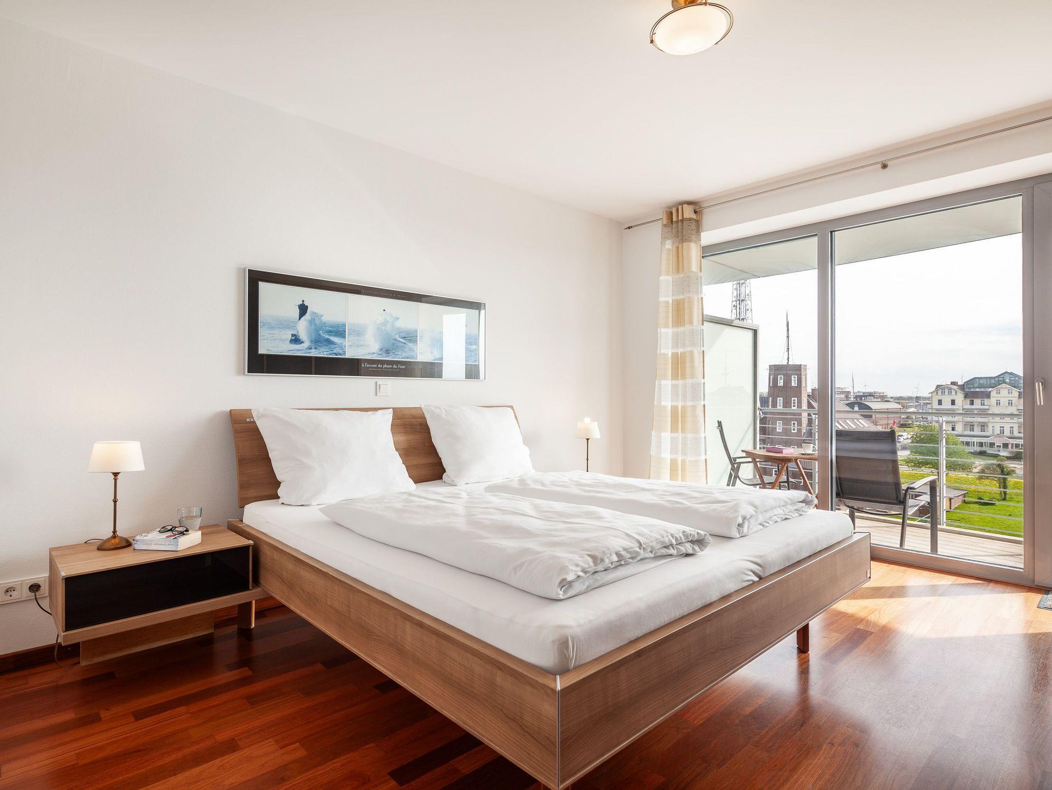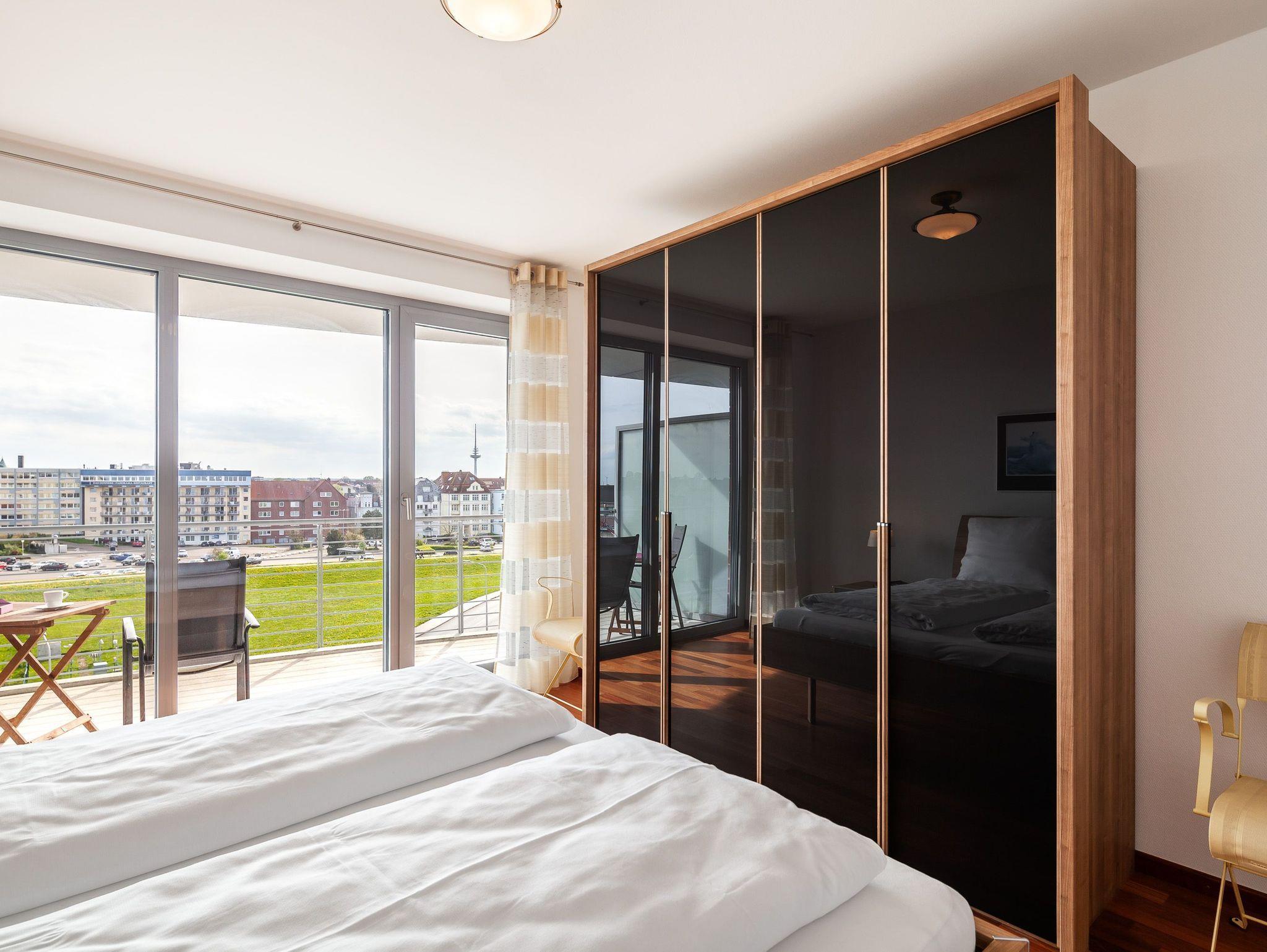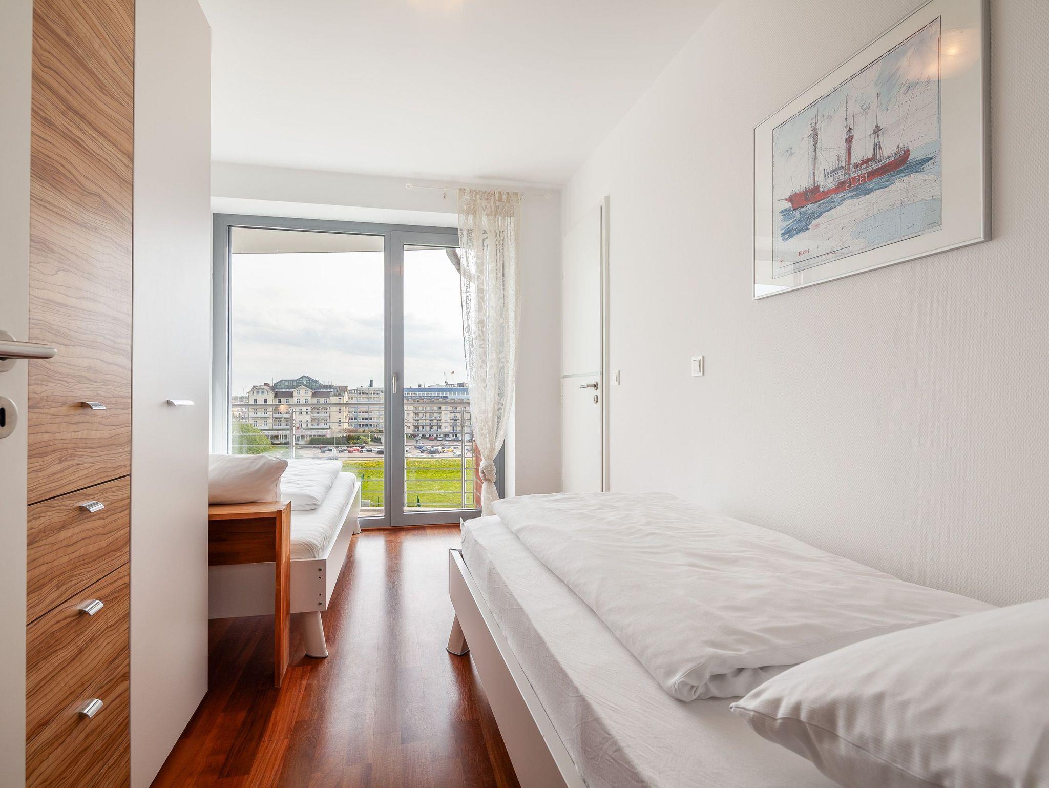 Sehr geschmackvolle 3-Raum-Wohnung in der 4. Etage mit dem atemberaubenden Blick auf die Elbmündung. Großes Wohnzimmer mit offener, voll ausgestatteter Küche, Esstisch, Balkon zur Seeseite, 1 Schlafzimmer mit Doppelbett, 1 Schlafzimmer mit zwei Einzelbetten, beide Schlafzimmer haben Zugang zum sonnigen Südbalkon mit Strandkorb. 1 Bad/Du/Wc, 1 Du/Wc, reservierter Pkw-Stellplatz auf dem Außengelände, Nichtraucher, keine Haustiere.