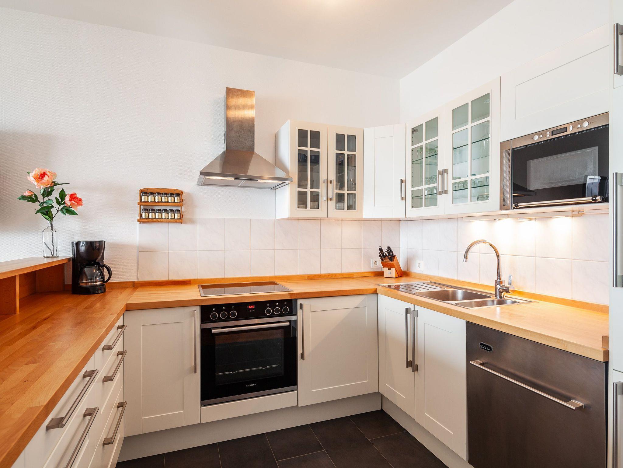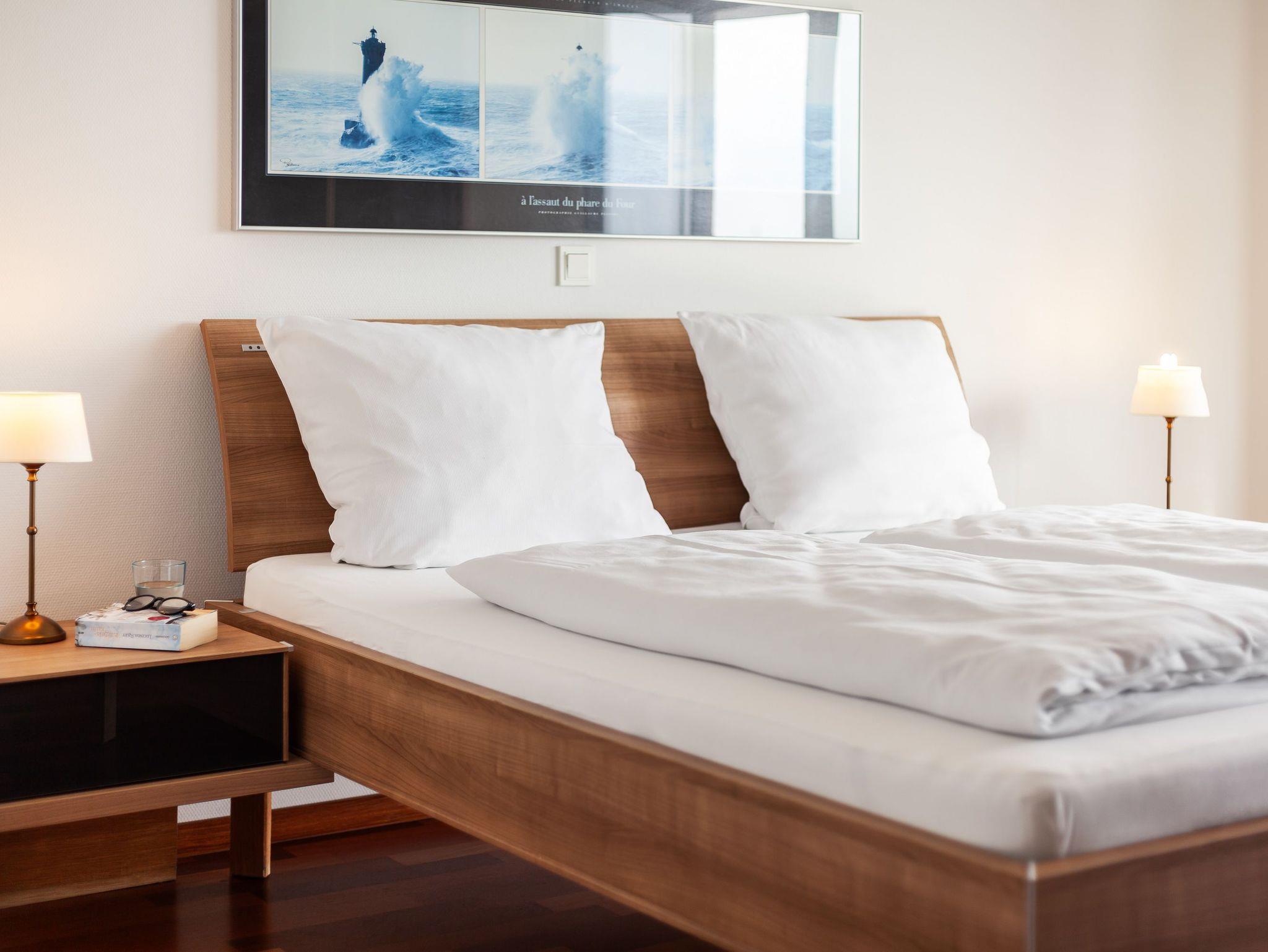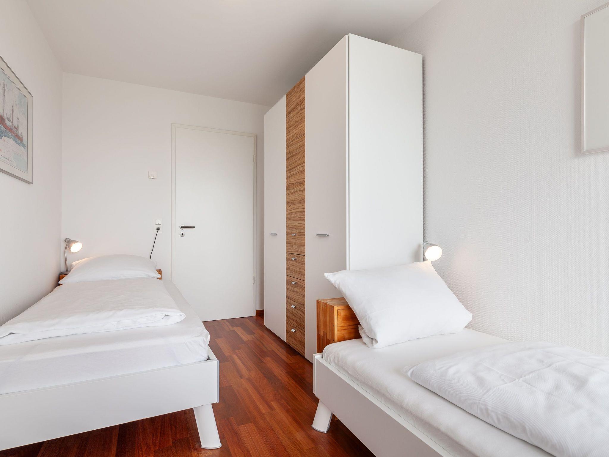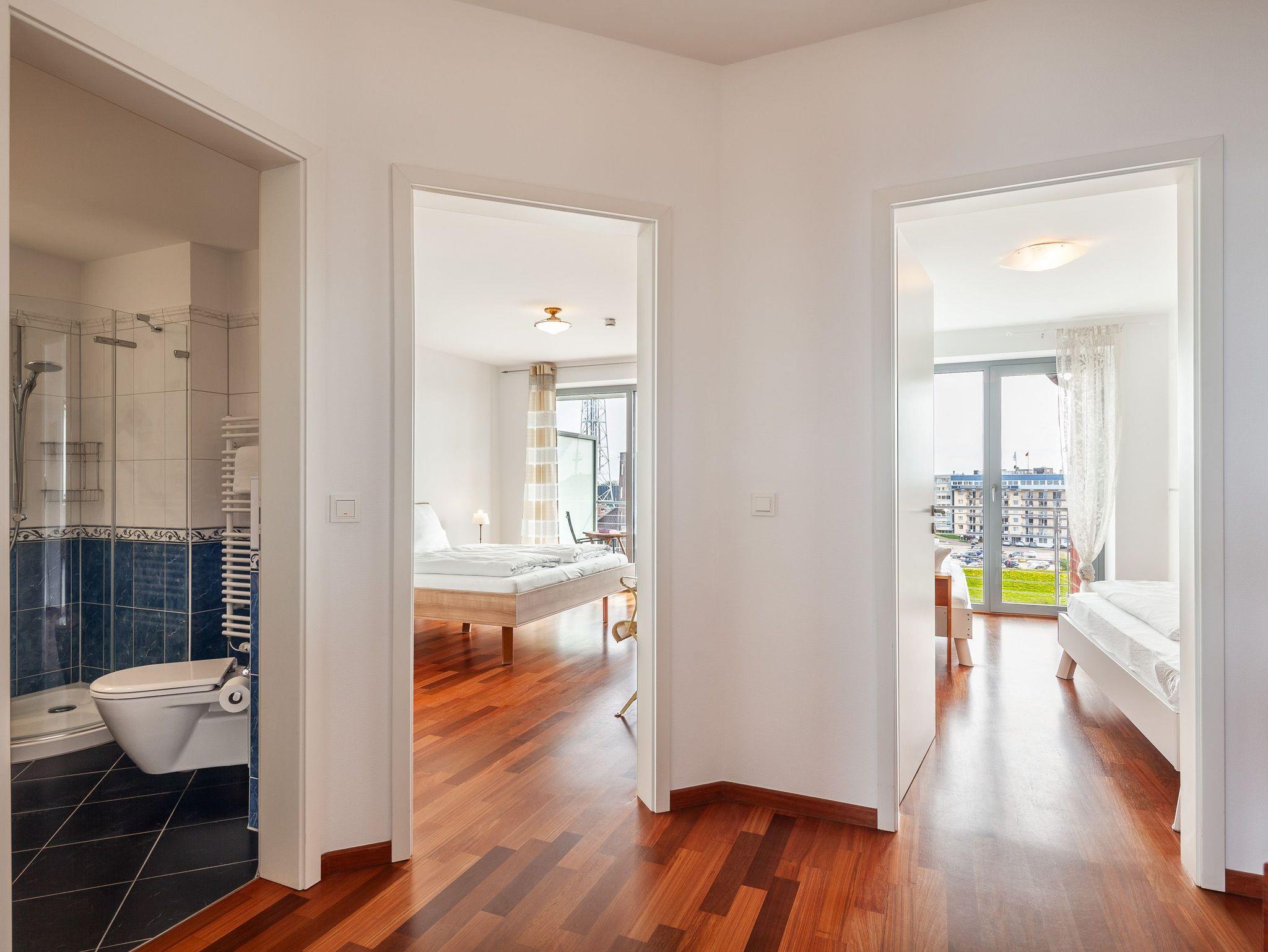 Sehr geschmackvolle 3-Raum-Wohnung in der 4. Etage mit dem atemberaubenden Blick auf die Elbmündung. Großes Wohnzimmer mit offener, voll ausgestatteter Küche, Esstisch, Balkon zur Seeseite, 1 Schlafzimmer mit Doppelbett, 1 Schlafzimmer mit zwei Einzelbetten, beide Schlafzimmer haben Zugang zum sonnigen Südbalkon mit Strandkorb. 1 Bad/Du/Wc, 1 Du/Wc, reservierter Pkw-Stellplatz auf dem Außengelände, Nichtraucher, keine Haustiere.