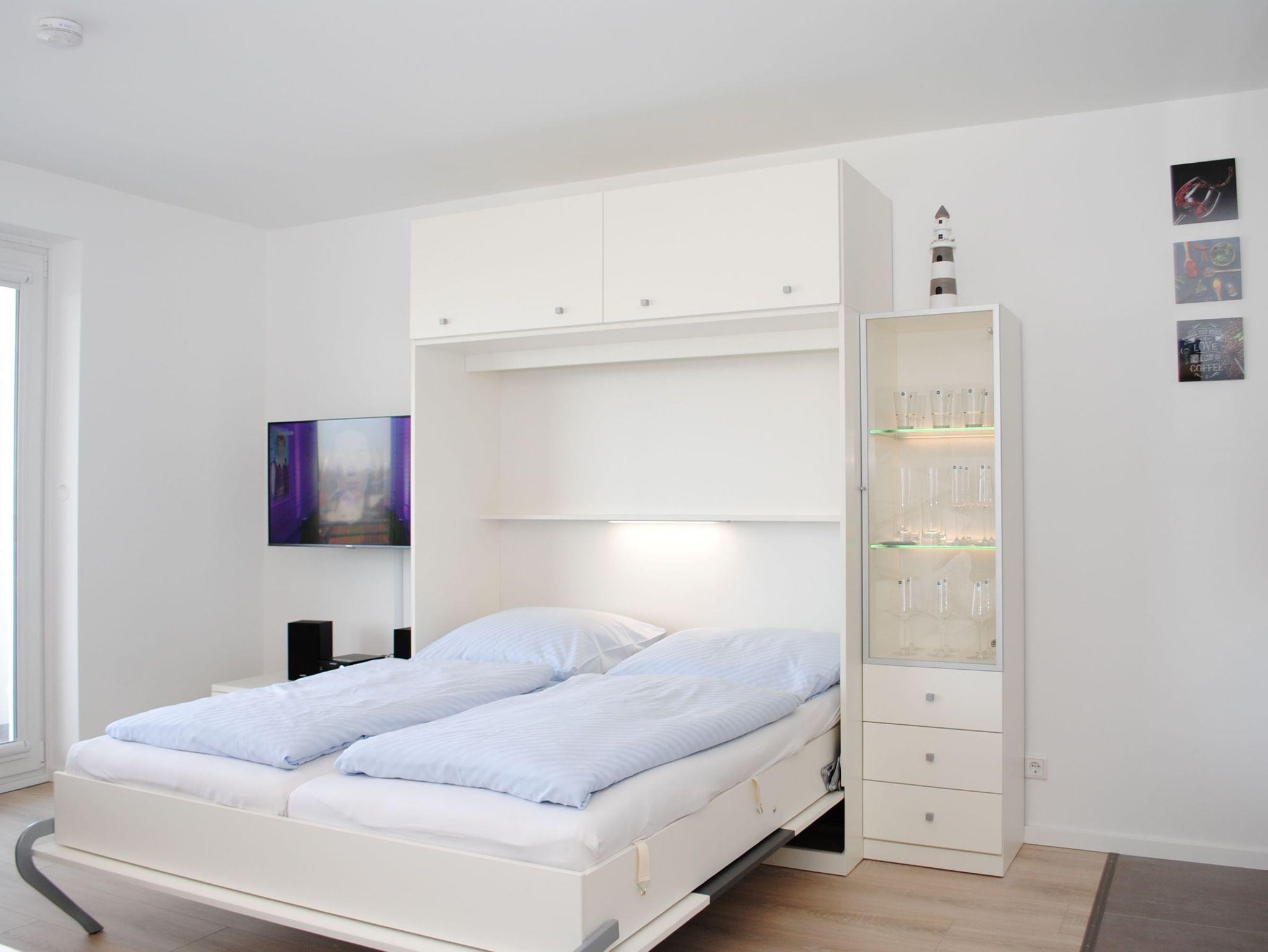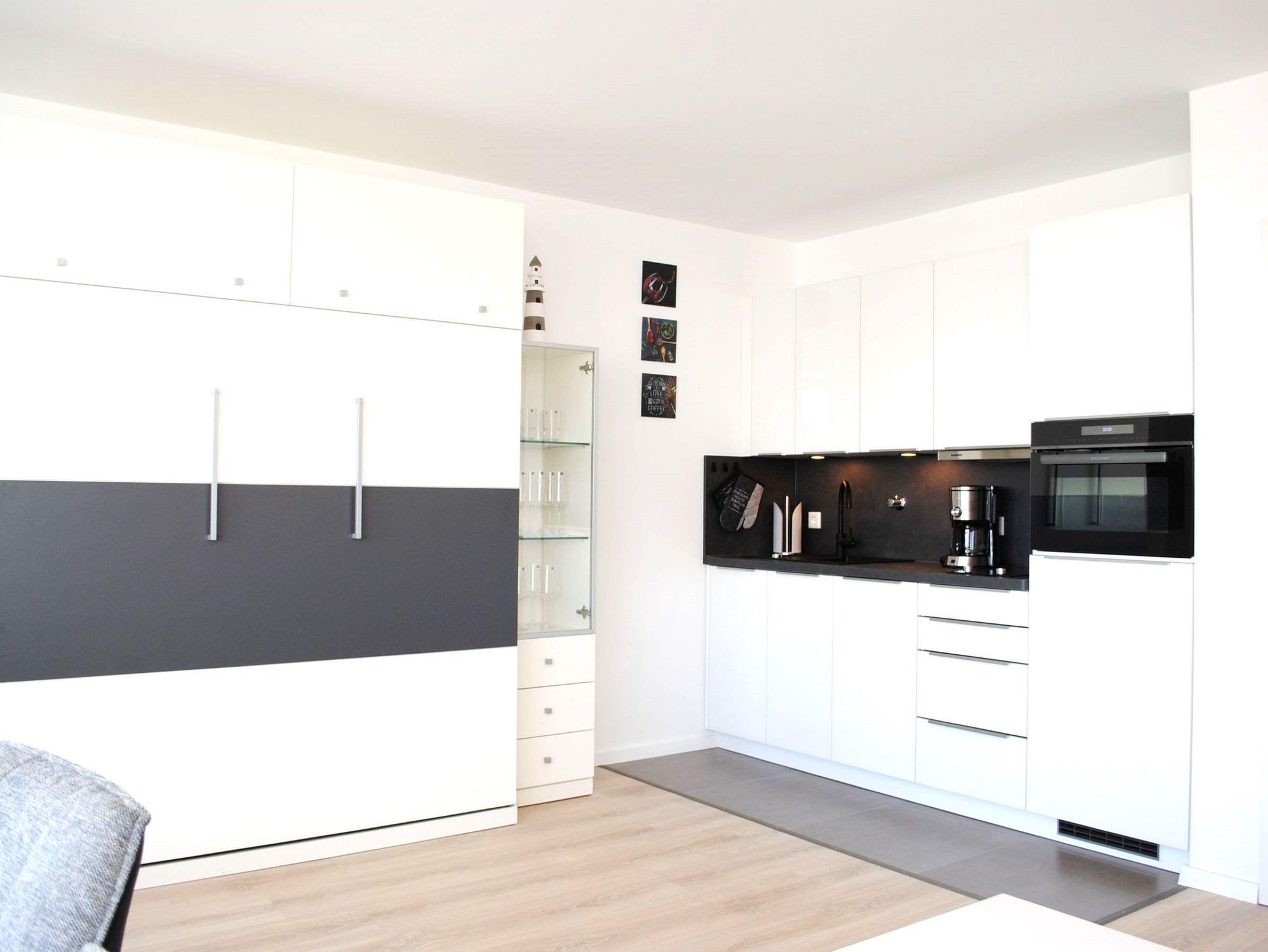 Das Apartment besteht aus einem Wohnbereich mit Schrankbett für 2 Personen, aus einem zusätzlichem Etagenbett in einer Nische im Flur und einem Badezimmer mit Dusche sowie WC. Die Ferienwohnung beinhaltet eine voll ausgestattete offene Küche.