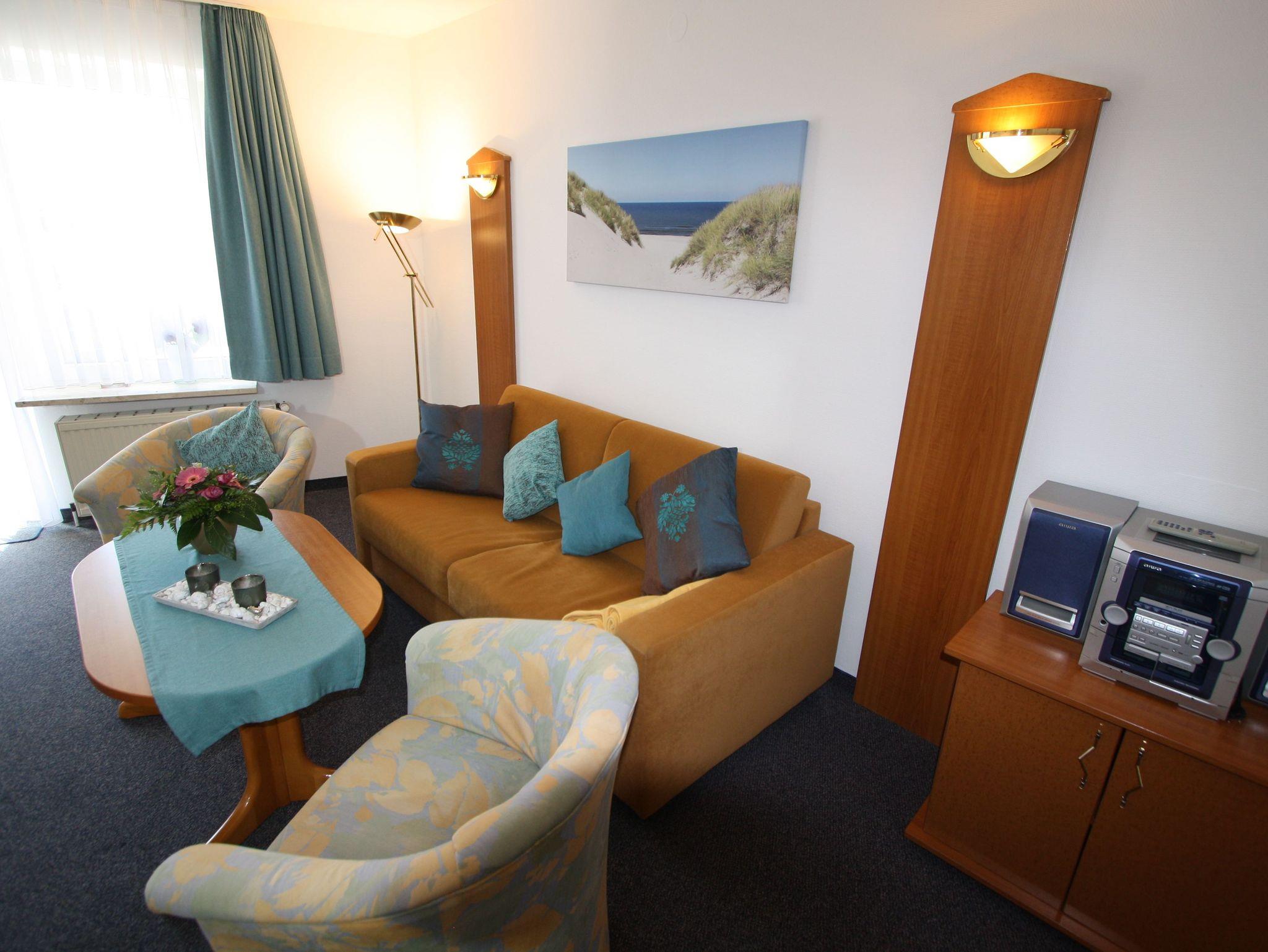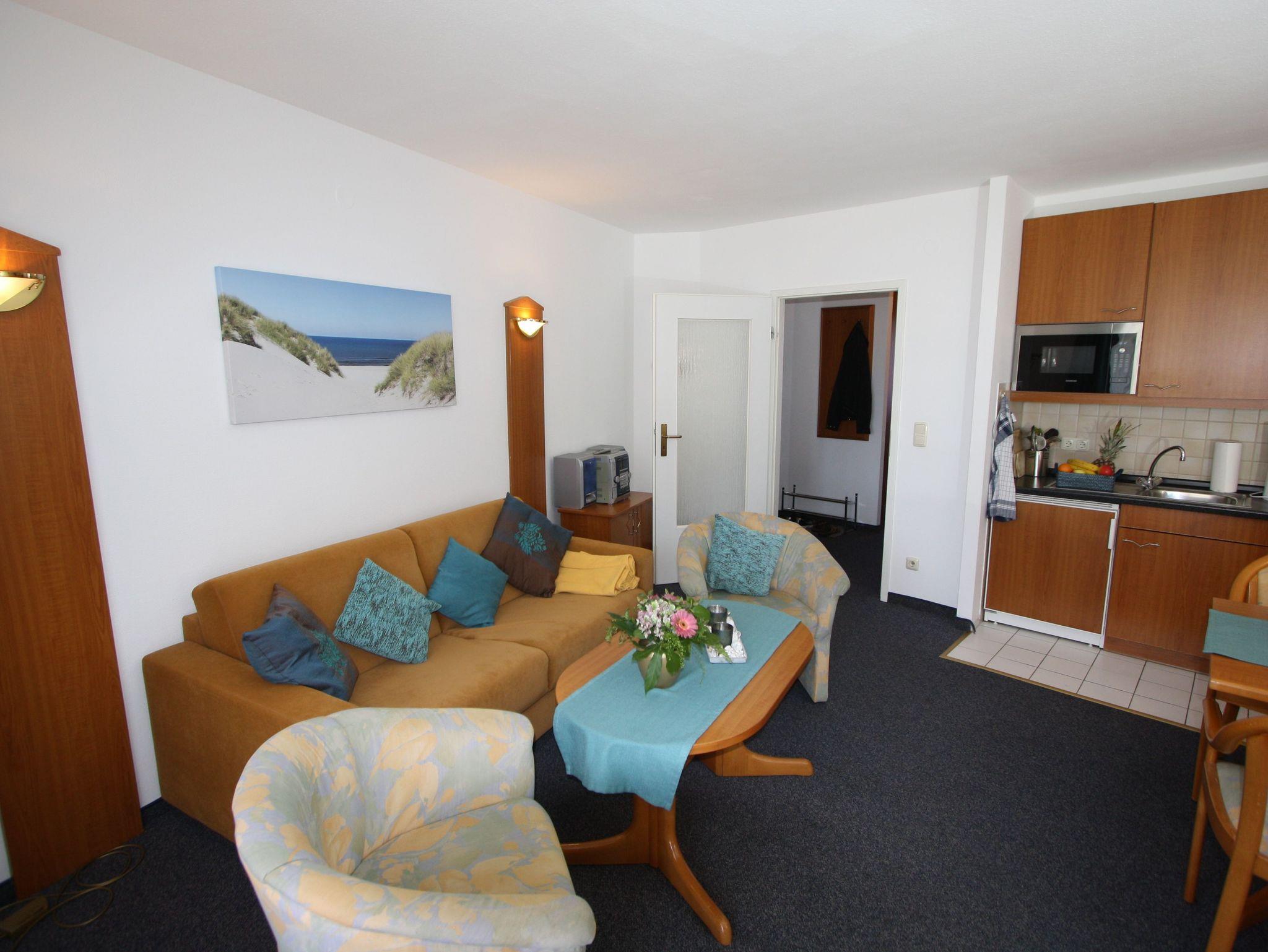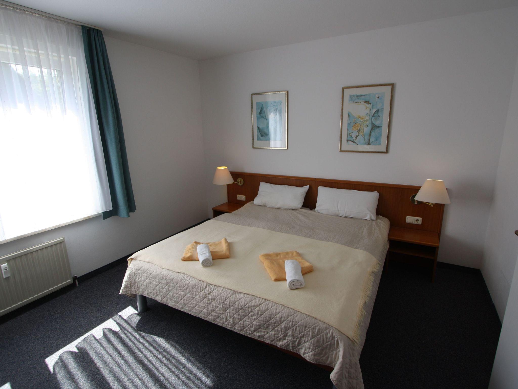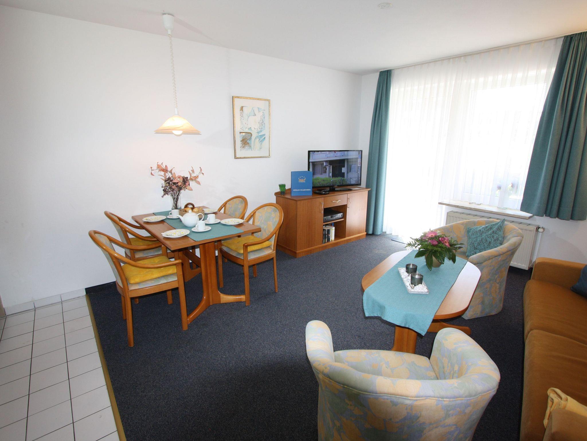 Sie wohnen in einem 2-Zimmer-Appartement für bis zu 4 Personen auf ca. 51 m² Wohnfläche im Erdgeschoss. Ein Schlafzimmer mit Doppelbett, Wohn-/Schlafraum mit bequemer Doppelbettcouch, separater Essplatz, voll ausgestatteter Küchenbereich, Dusche/WC, Terrasse und SAT-TV, kostenloses WLAN. PKW-Stellplatz in der Tiefgarage.