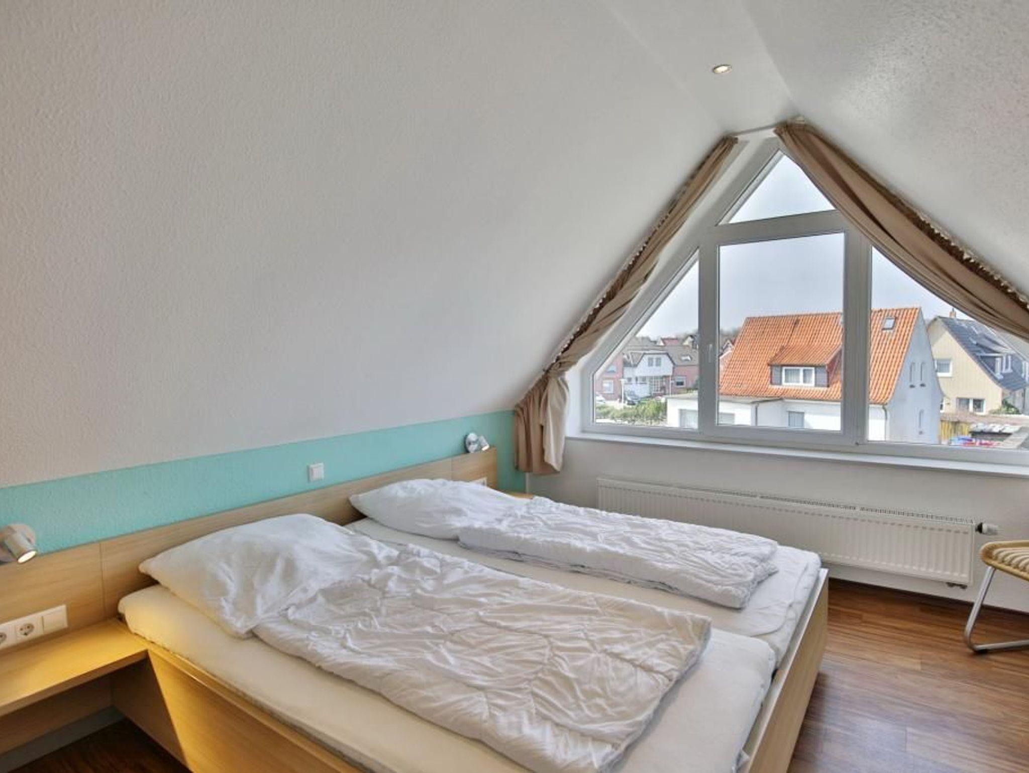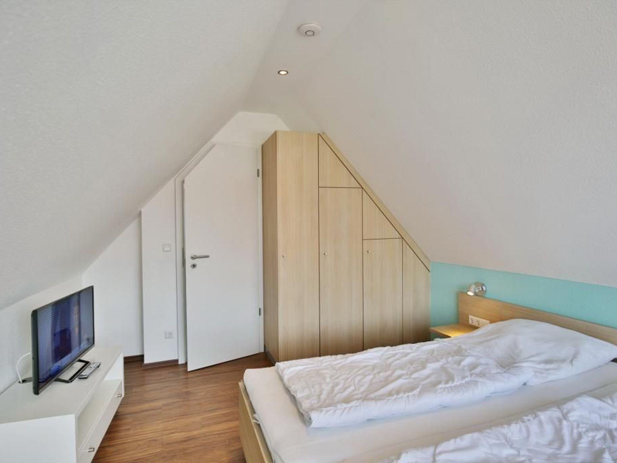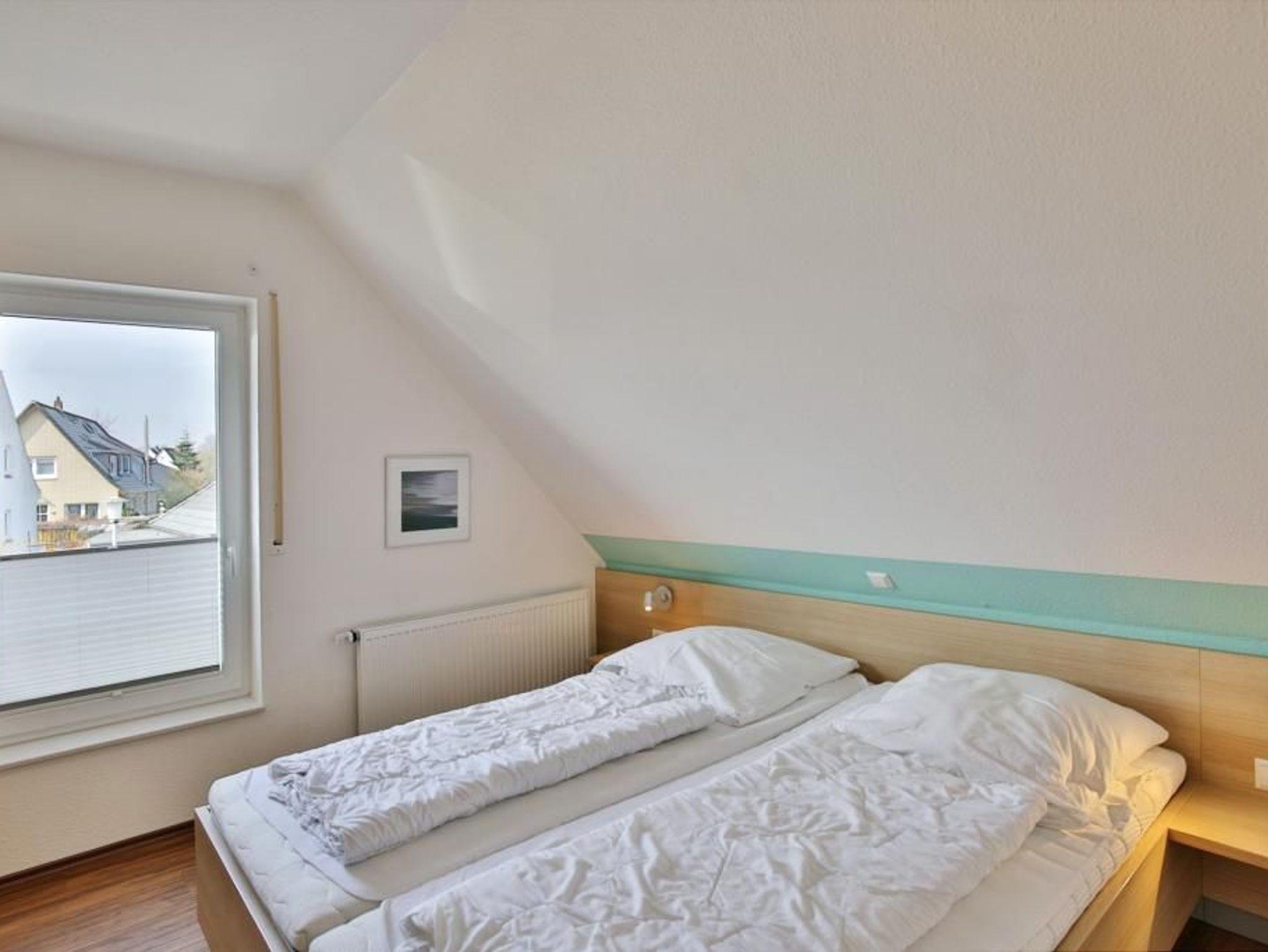Sehr schöne, helle 3-Raum-Maisonette-Wohnung, 1.Etage, 1 Schlafzimmer mit Doppelbett, 1 Schlafzimmer im Dachgeschoss Doppelbett und separaten WC, Wohnzimmer mit Küchenzeile (Backofen, Mikrowelle, Geschirrspüler) 2x SAT-TV, CD, DVD, kostenloses W-LAN Internet, Du/Wc, großer Balkon (süd) mit Balkonmöbeln und Sonnenschirm (saisonabhängig), Rollladen, reservierter Pkw-Stellplatz vor dem Haus, keine Haustiere erlaubt, Nichtraucher.