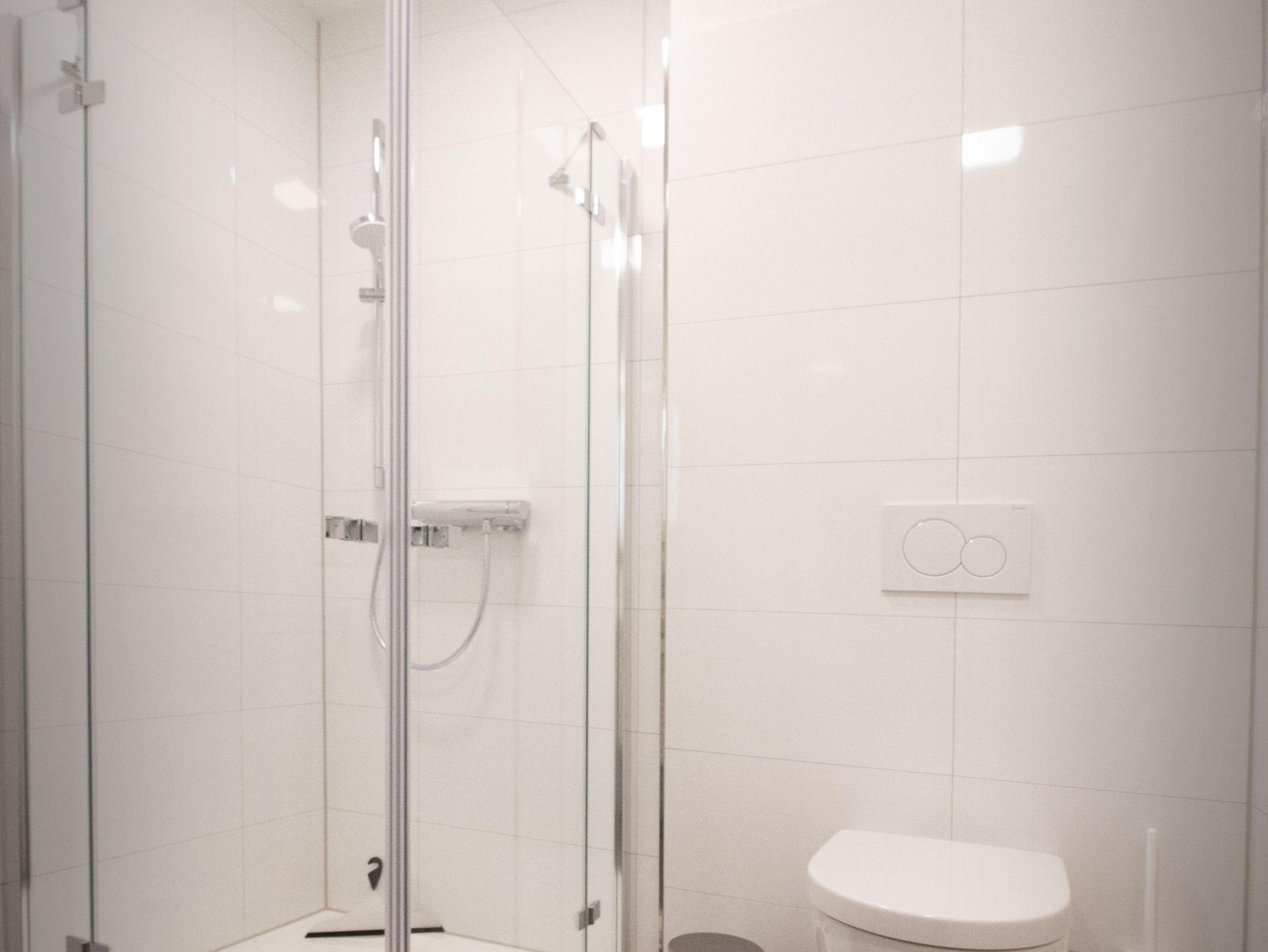 Das Bad ist mit WC, Waschtisch, Handtuchheizkörper und einer großzügigen, bodentiefen Glasdusche ausgestattet. Die praktische Raumaufteilung schafft viel Bewegungsfreiheit.
