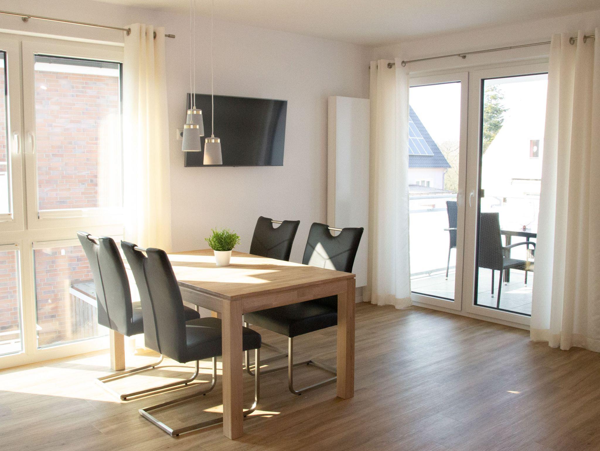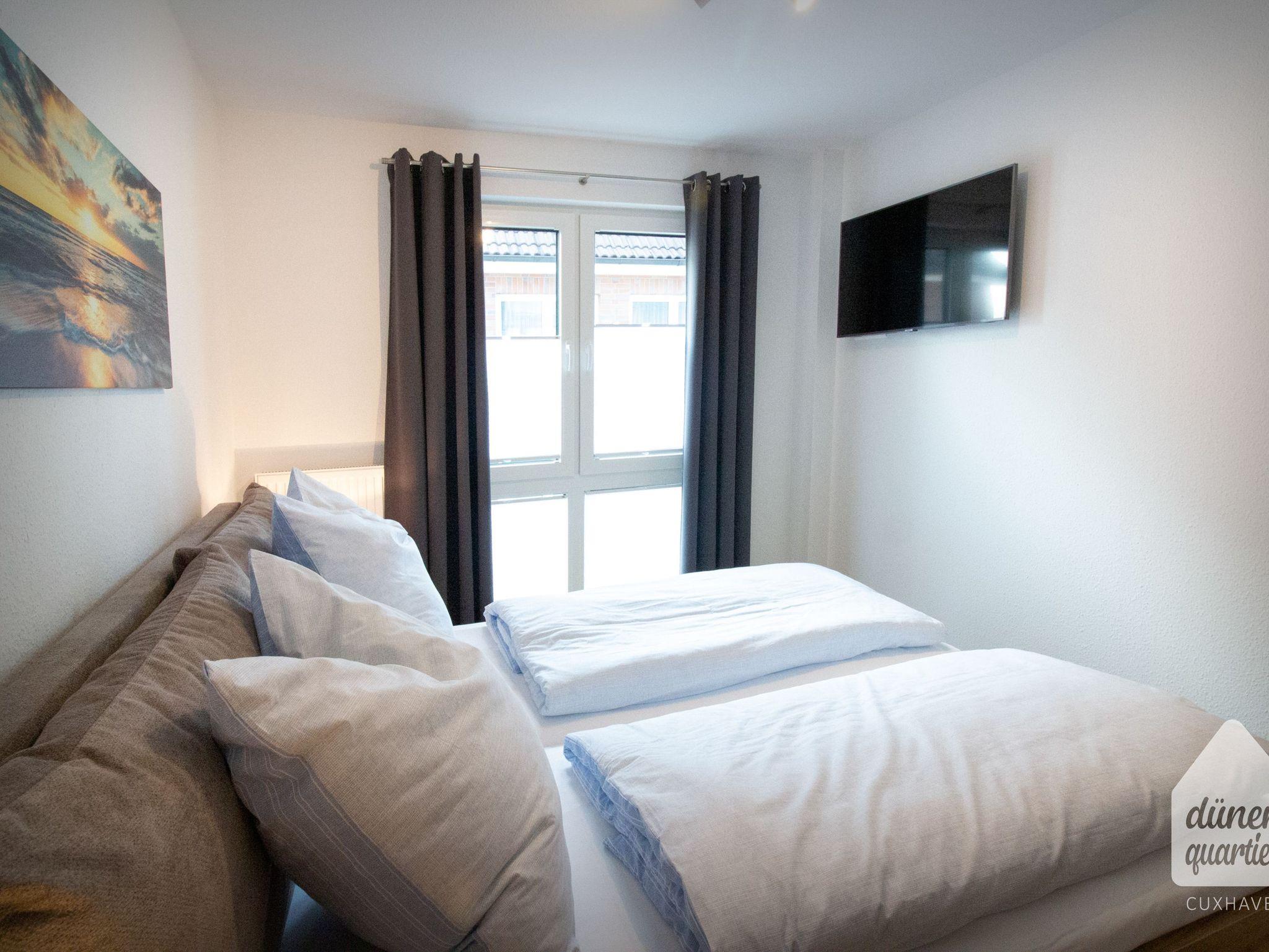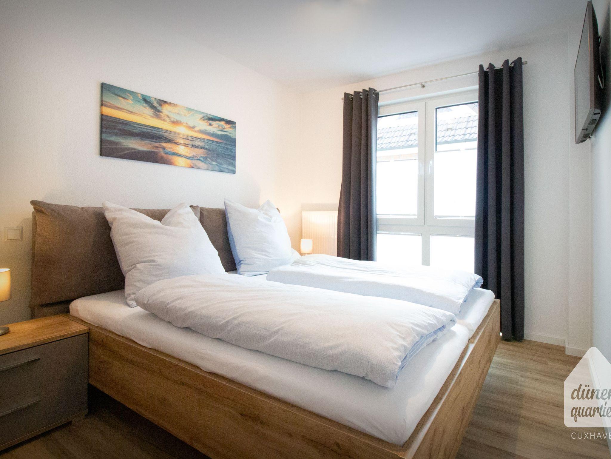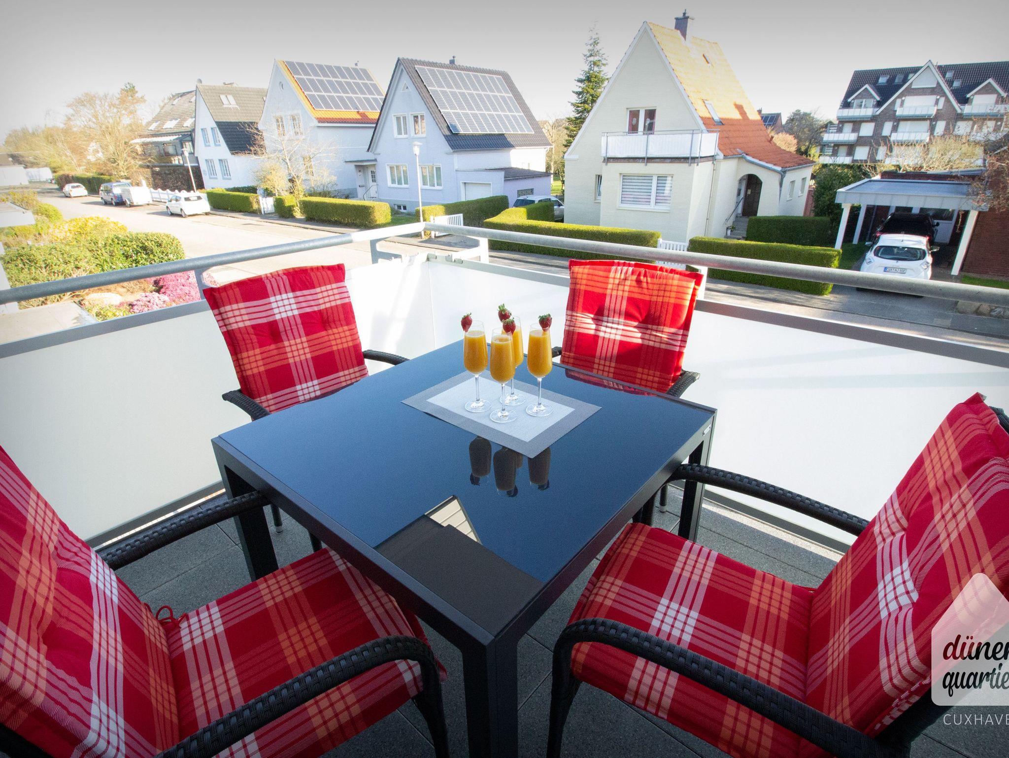 Moderne Ferienwohnung im Dünenquartier Cuxhaven, 300m vom Strand, mit Balkon, Aufzug und Tiefgarage, ideal für Familien und Paare.