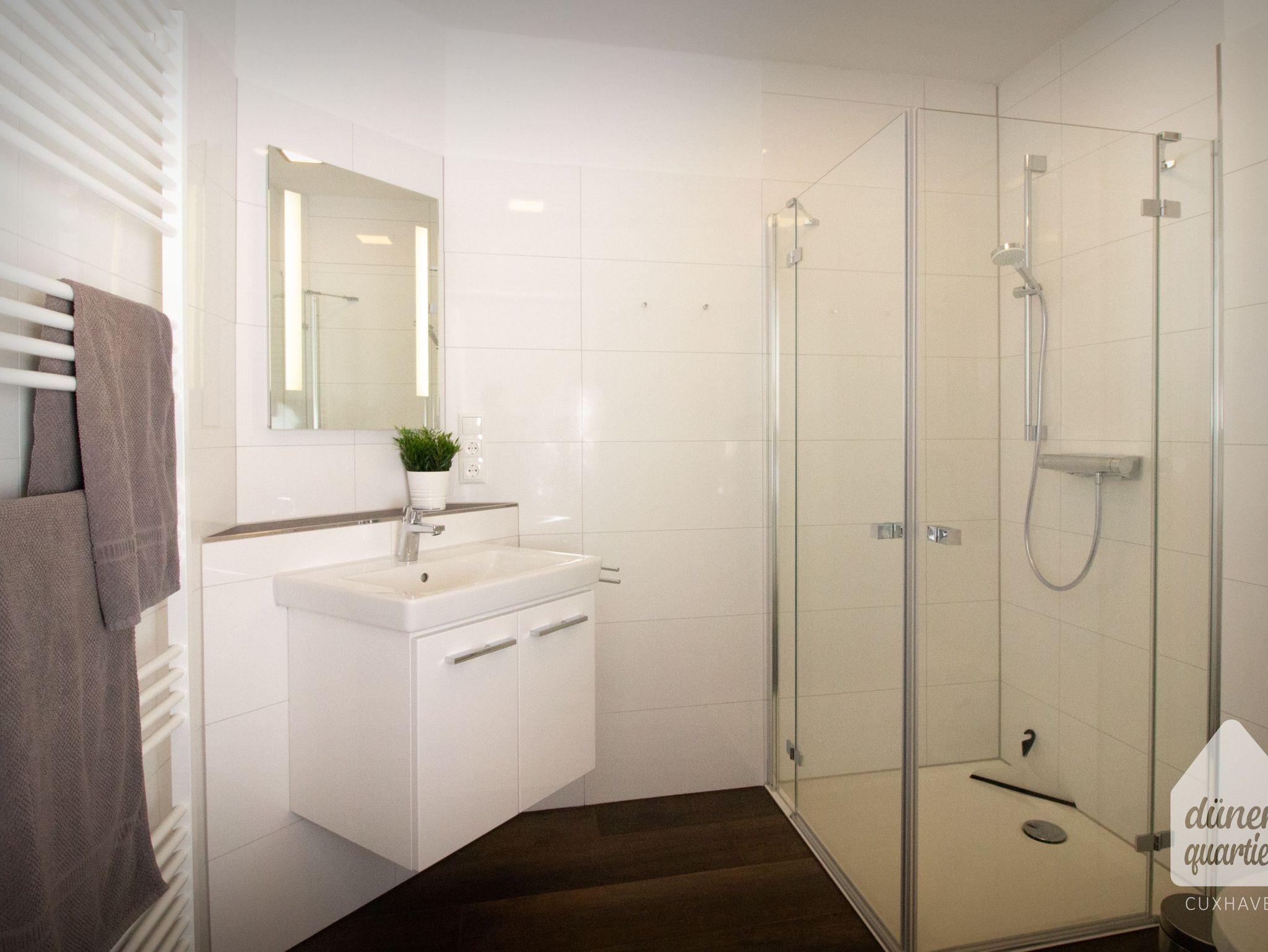Das moderne Badezimmer ist hell und freundlich gestaltet und punktet durch die bodengleiche Dusche und den Handtuchheizkörper. Hand- und Duschtücher sind im Preis inbegriffen.