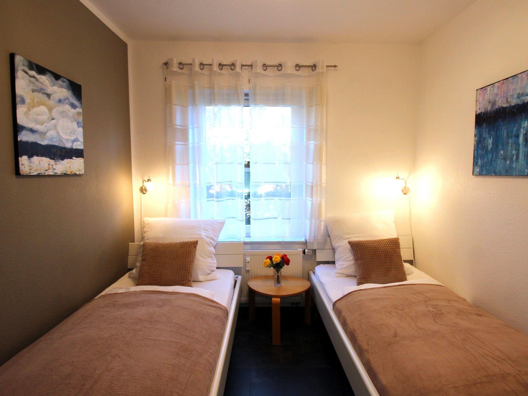 * ein Schlafzimmer mit getrennten Betten und zusätzlichem Flachbild-TV