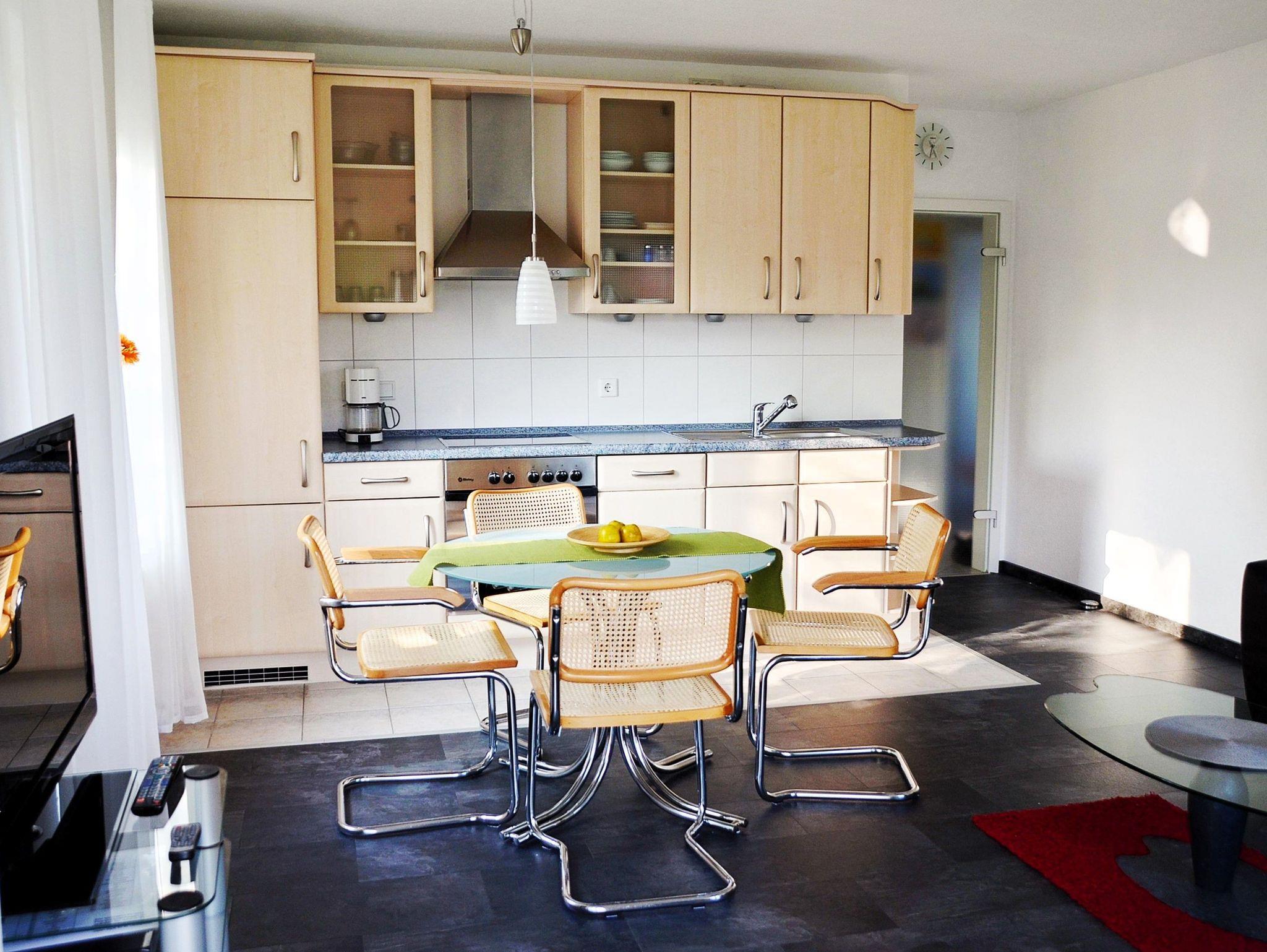 * eine voll ausgestattete Küchenzeile mit Backofen, Geschirrspüler, Kühlschrank mit Tiefkühlfach und