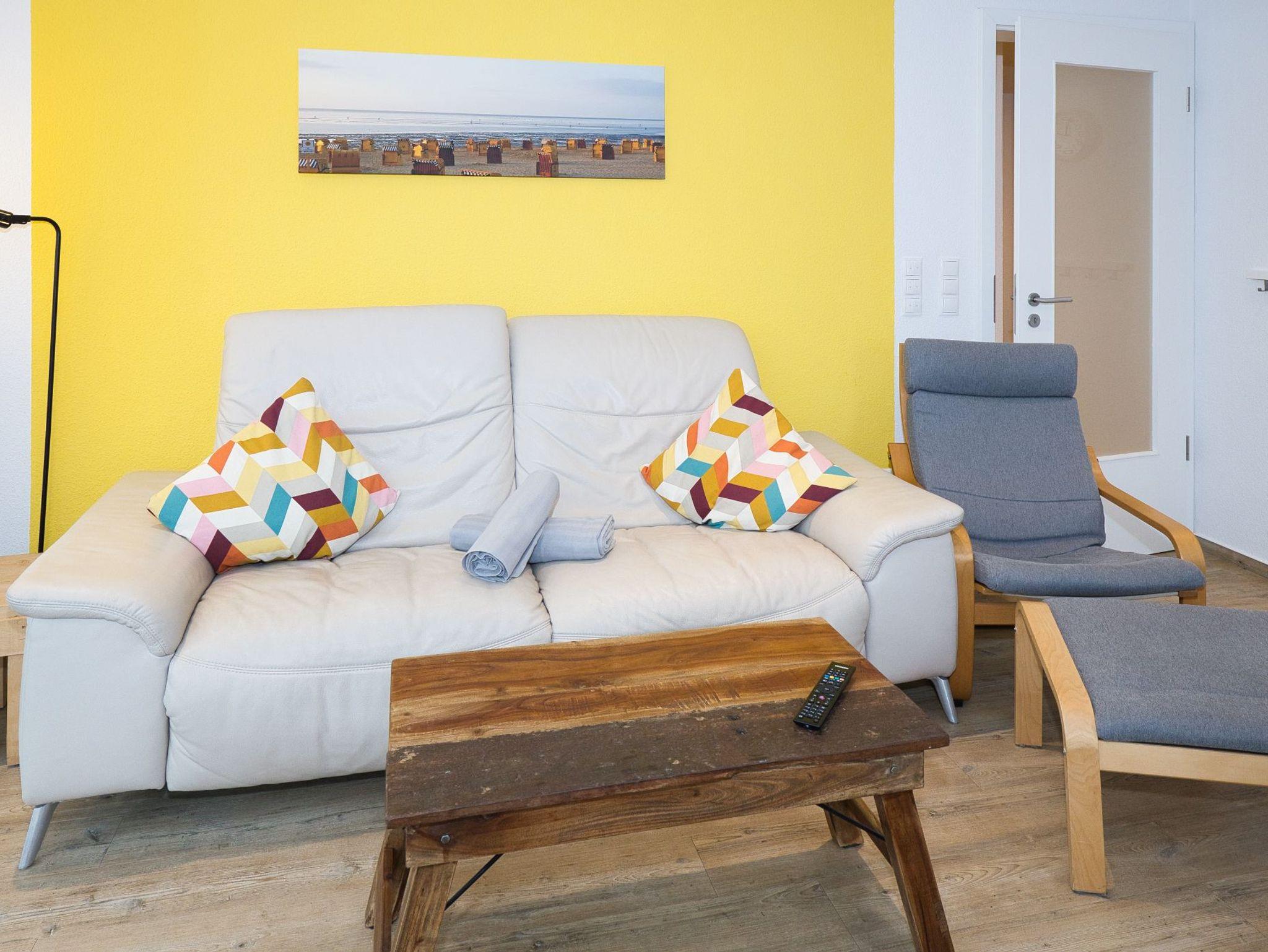 Der Wohn-, Ess- und Küchenbereich der Wohnung ist nicht nur hell, sondern auch gemütlich und geschmackvoll eingerichtet. Hier können Sie sich nach einem ereignisreichen Tag am Strand oder bei Ausflügen wunderbar entspannen. Vom Wohnbereich gelangen Sie zudem auf den großartigen Balkon, der mit komfortablen Sitzmöbeln ausgestattet ist. Genießen Sie hier die frische Nordseeluft und lassen Sie Ihre Seele baumeln.