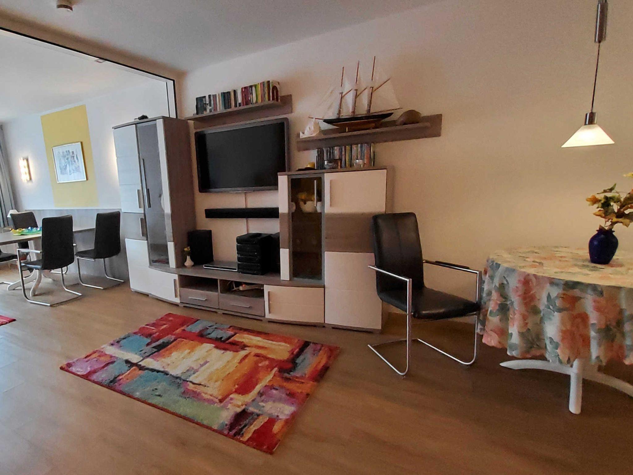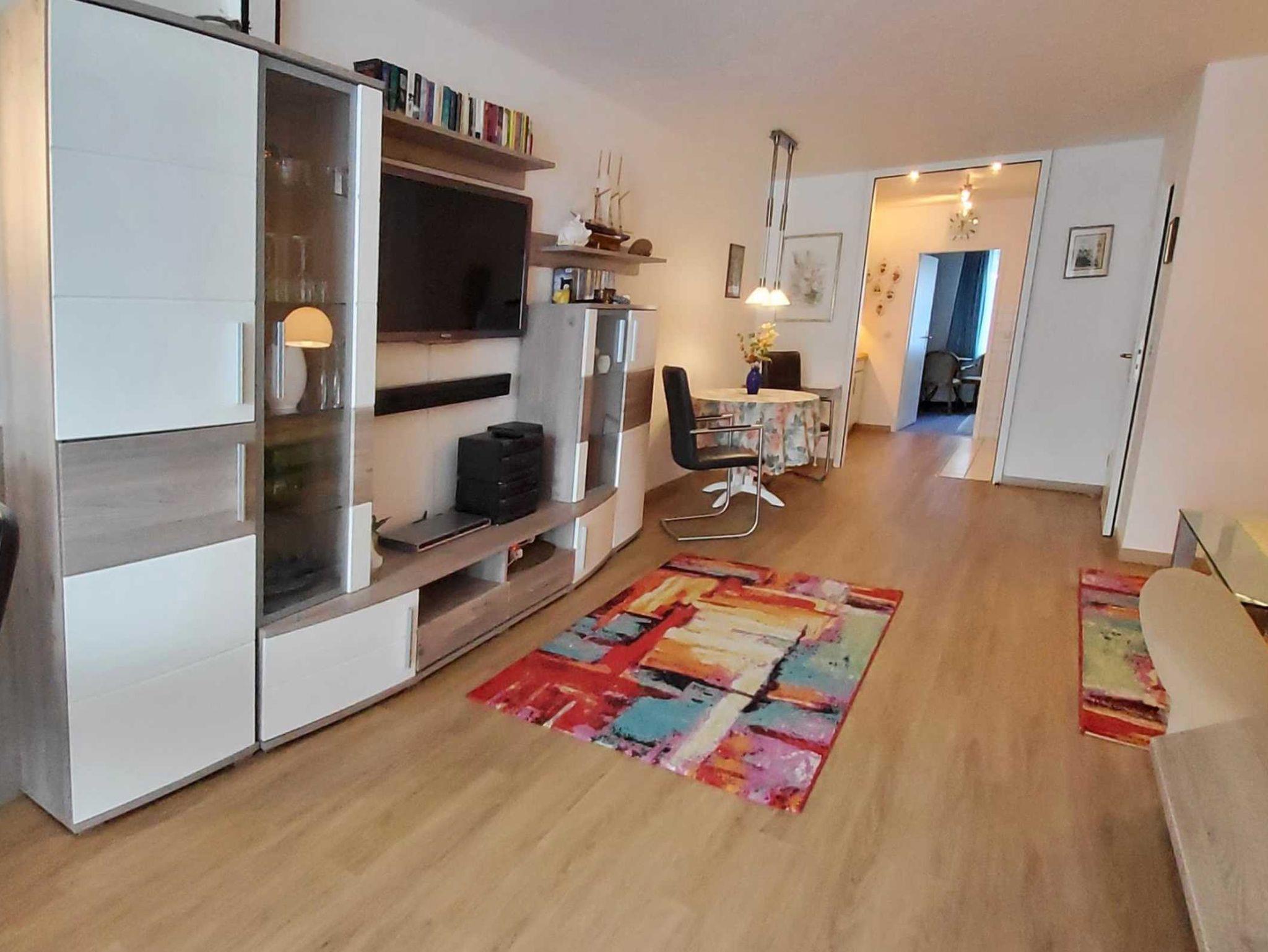 Wohnzimmer: Gemütliche Sitzecke in L-Form, moderne Schrankwand mit 46(120 cm) LED-TV mit Ambilight und Soundbar, HiFi-Anlage mit CD, Video- und DVD-Player mit div. DVD. Separater Essbereich mit modernen Lederschwingstühlen für vier Personen und kleiner Essbereich für zwei Personen, Fenster mit Verdunklungsrollo und festinstallierten Fliegengitter.