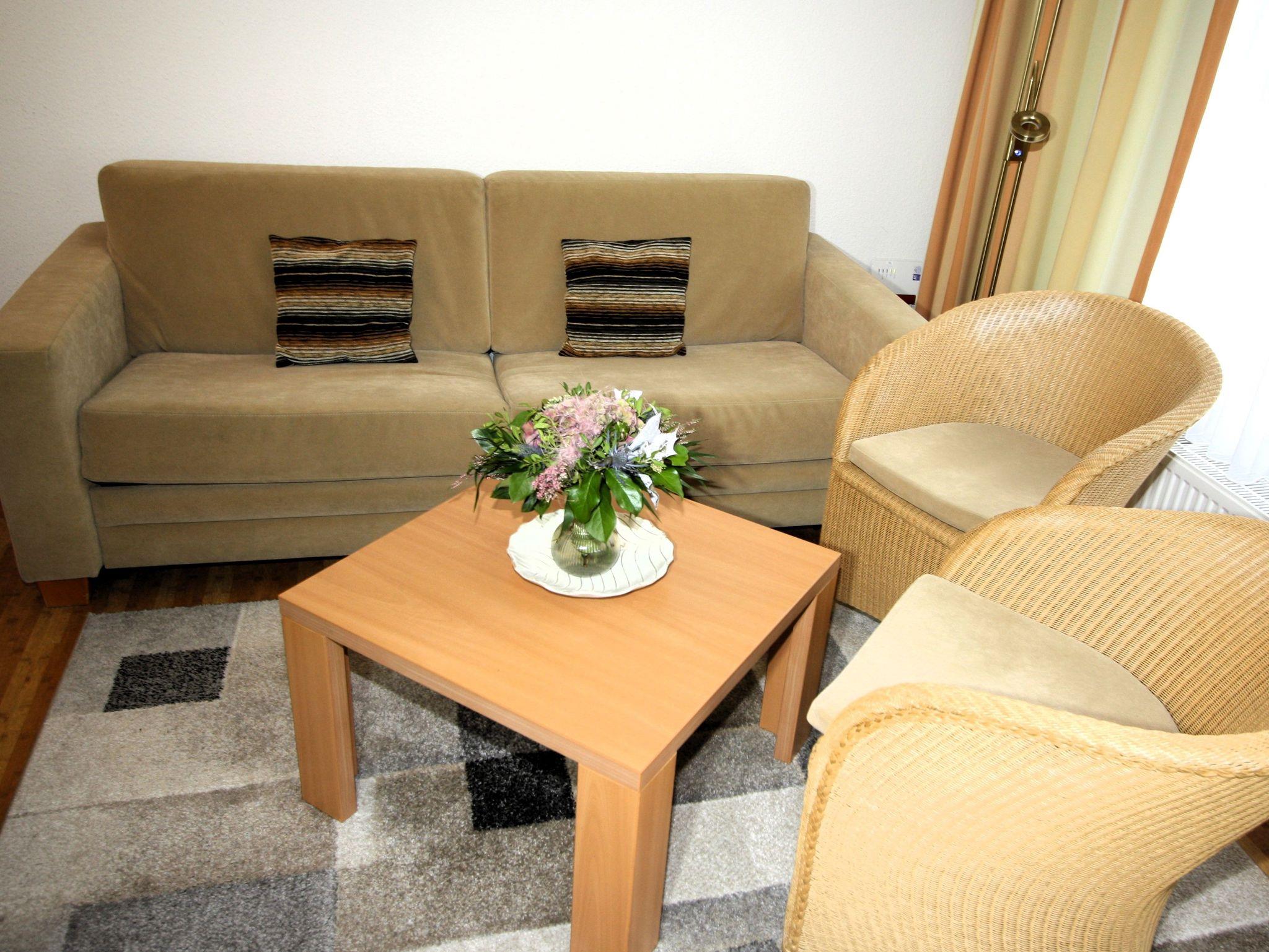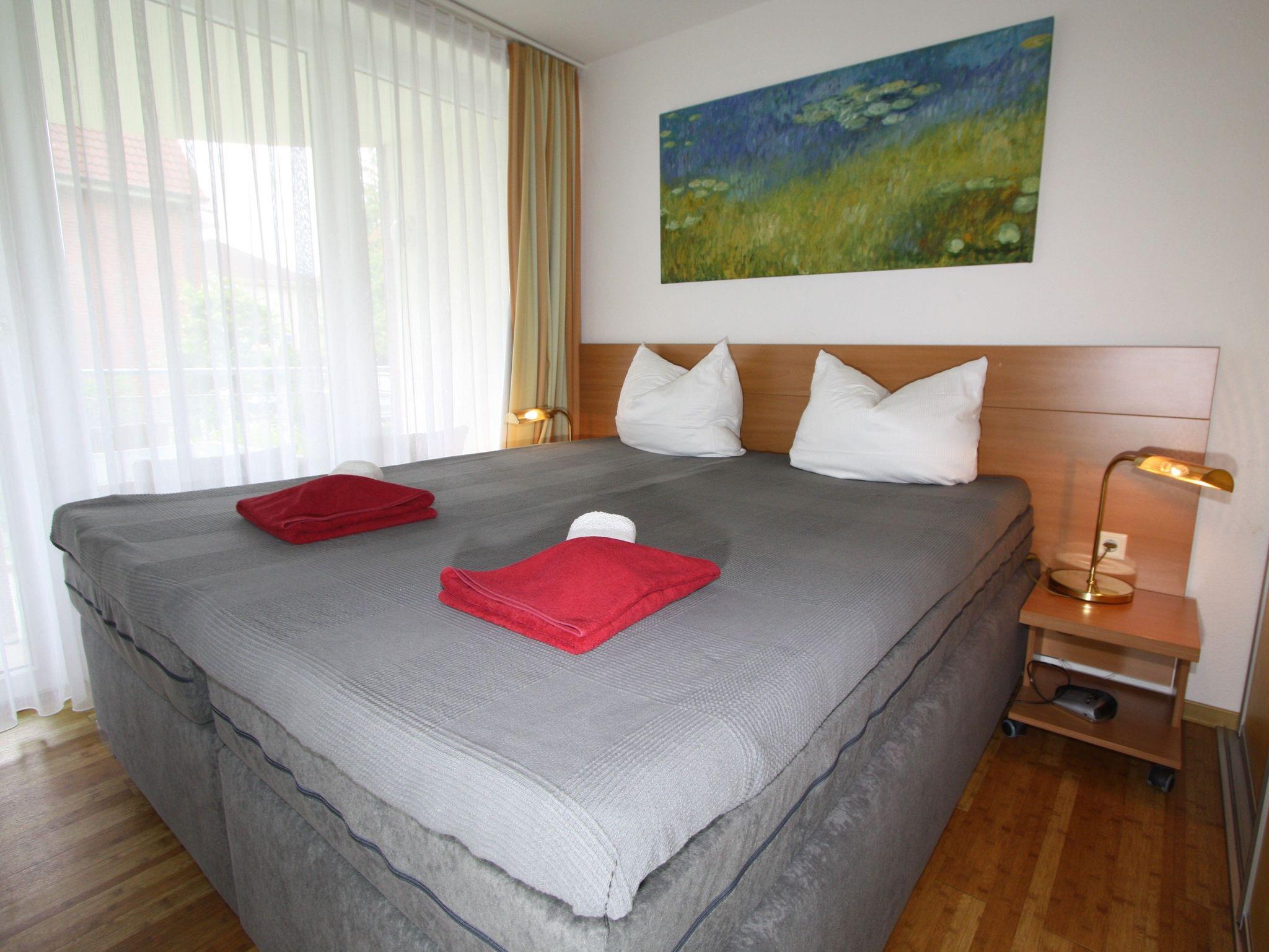 2-Zimmer-Appartement für bis zu 4 Personen, ca. 48 m², ein Schlafzimmer mit Doppelbett (auch als Einzelbetten stellbar), großer heller Wohn-/Schlafraum mit bequemer Doppelbettcouch, separater Essplatz, voll ausgestatteter Küchenbereich mit Geschirrspüler, Dusche/WC, Balkon, Abstellraum, SAT-TV.